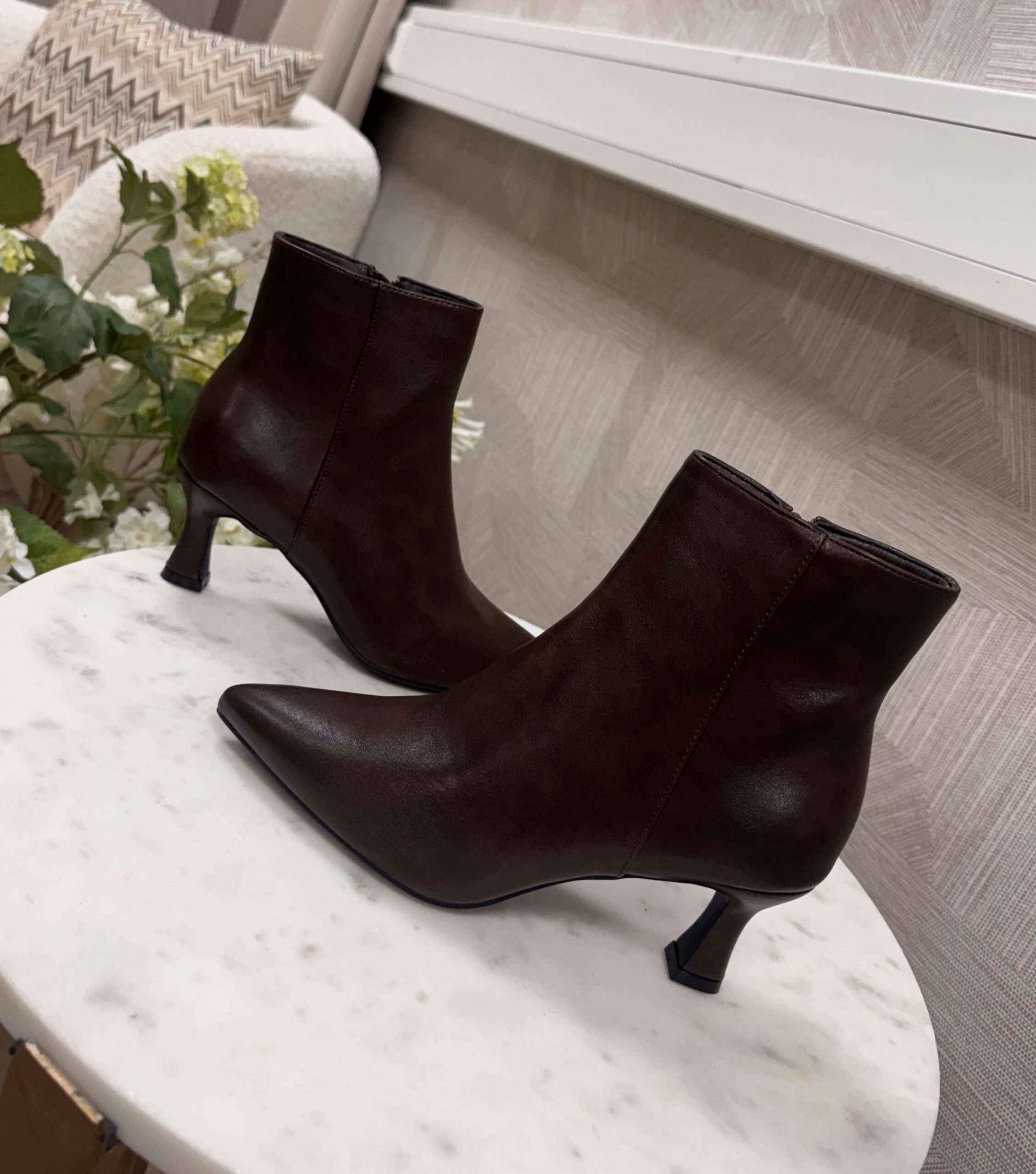 Deze elegante enkellaarsjes in diep donkerbruin zijn een echte musthave voor het najaar. Het tijdloze design met spitse neus en slanke hak zorgt voor een vrouwelijke en chique uitstraling. Combineer ze met een jurk, jeans of pantalon voor een moeiteloos stijlvolle look.