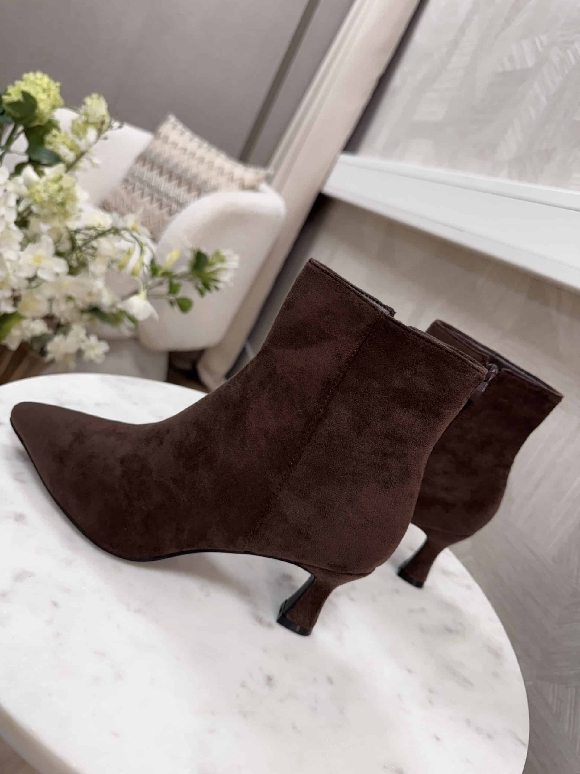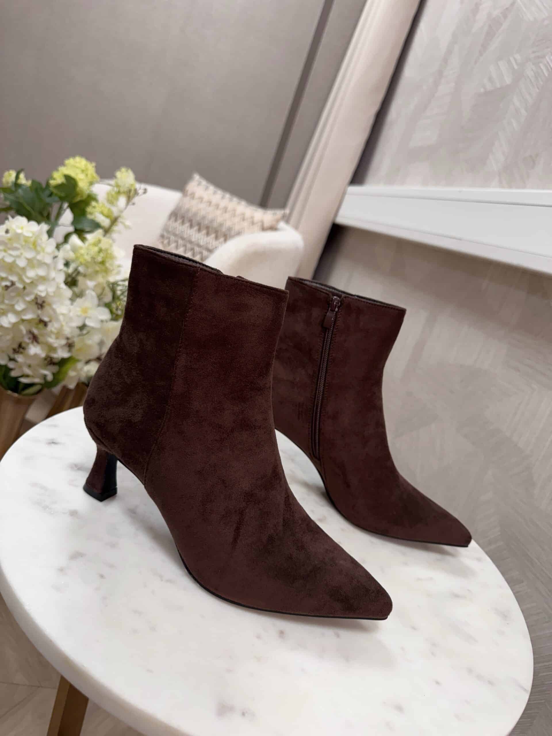 Deze elegante enkellaarsjes in suedelook bruin zijn een echte musthave voor het najaar. Het tijdloze design met spitse neus en slanke hak zorgt voor een vrouwelijke en chique uitstraling. Combineer ze met een jurk, jeans of pantalon voor een moeiteloos stijlvolle look.