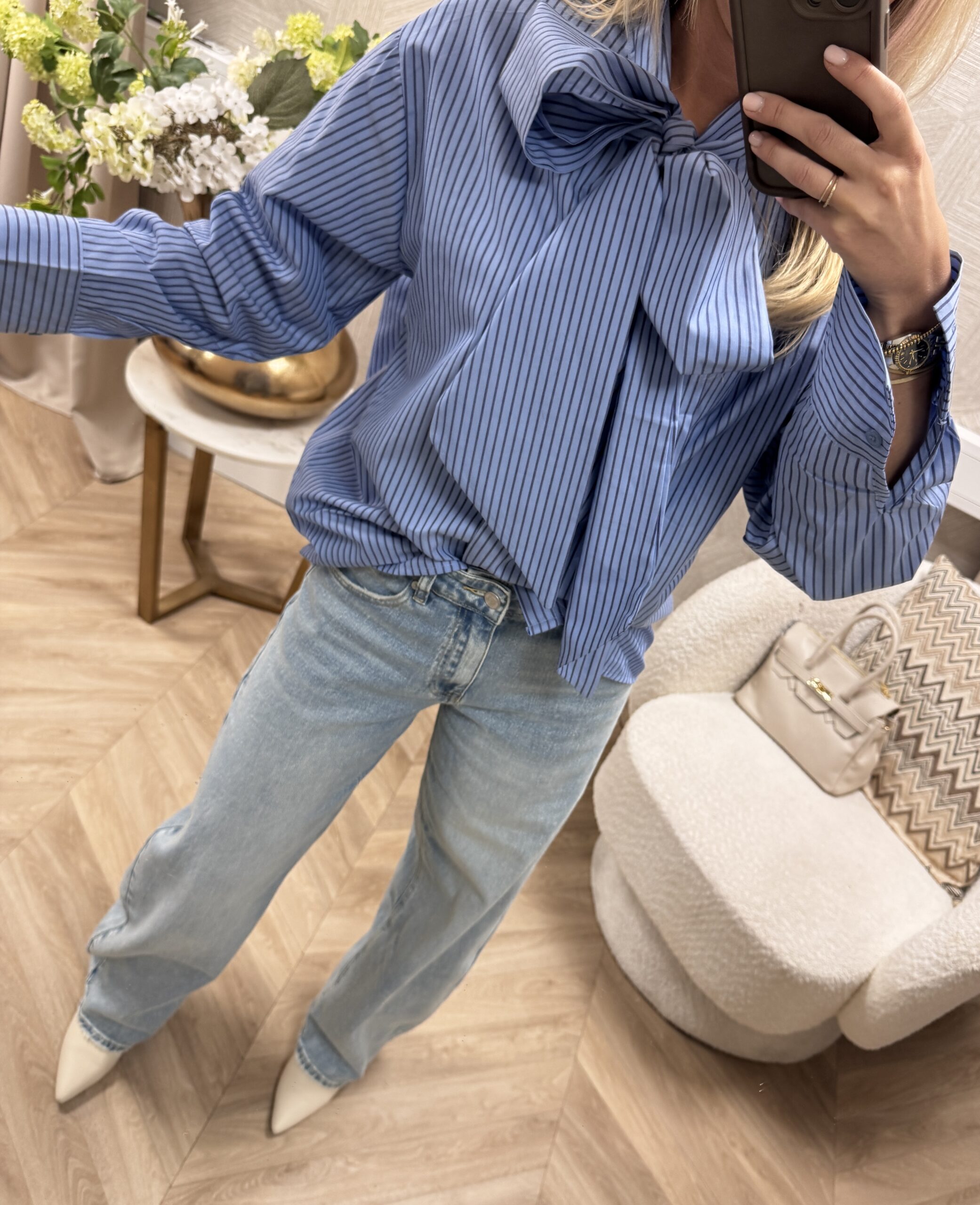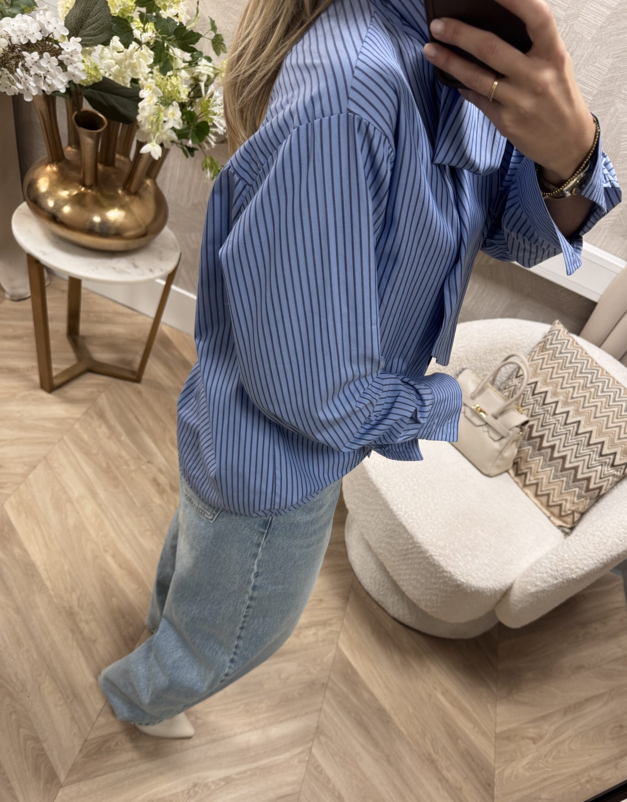 Deze blouse is een echte eyecatcher voor het nieuwe seizoen. Het model heeft een fijne verticale streep en een luxe uitstraling. De blouse is voorzien van een stijlvol strikdetail bij de hals, wat zorgt voor een chique touch. Dankzij de soepel vallende stof en de licht oversized fit draagt de blouse comfortabel.