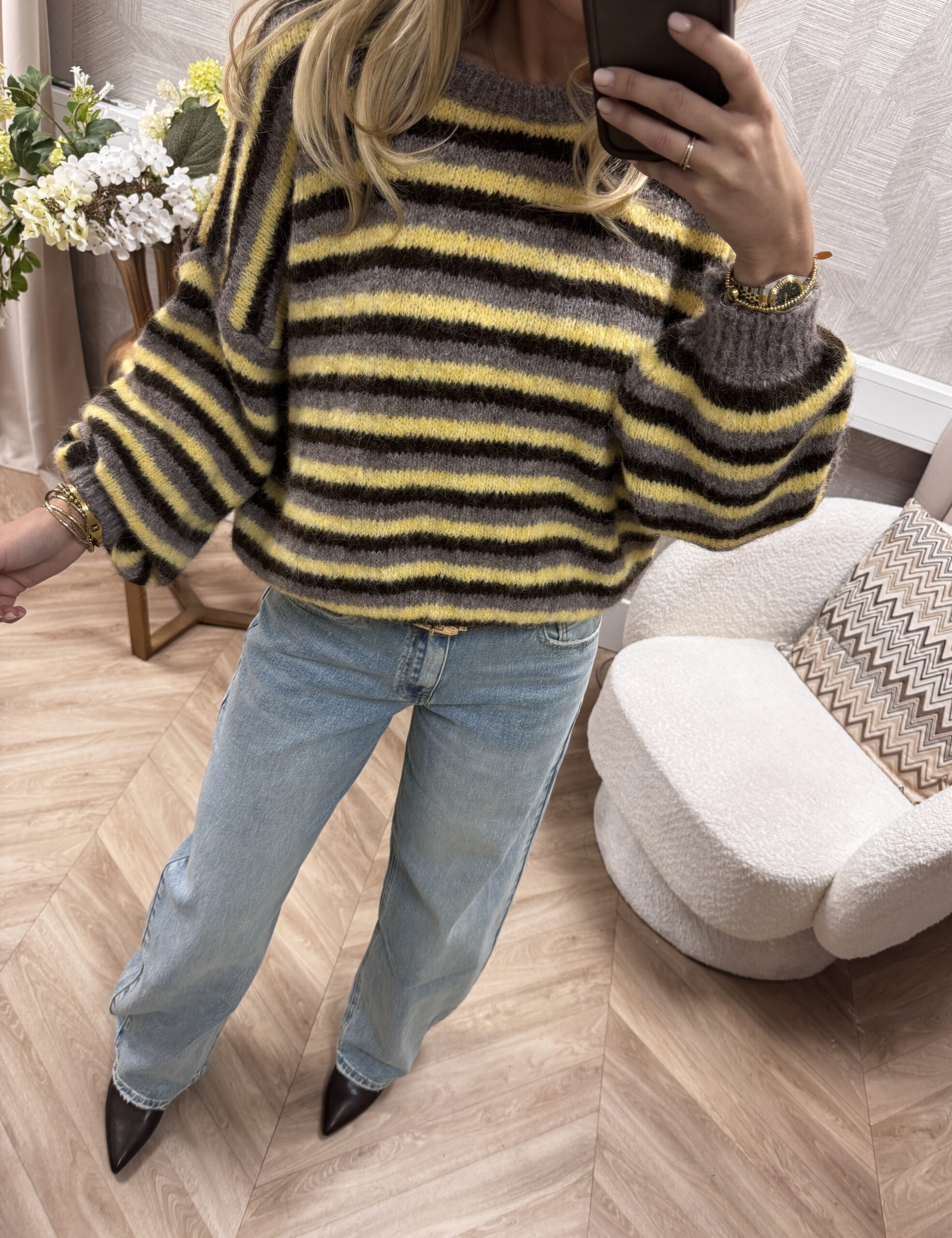 Deze zachte Ambika trui is een echte eyecatcher dankzij het speelse streeppatroon. De trui heeft een comfortabele, losvallende fit en is gemaakt van een heerlijk zachte knit die fijn aanvoelt op de huid. De ronde hals en licht oversized pasvorm zorgen voor een casual look, terwijl de kleurencombinaties de trui net dat extra geven.