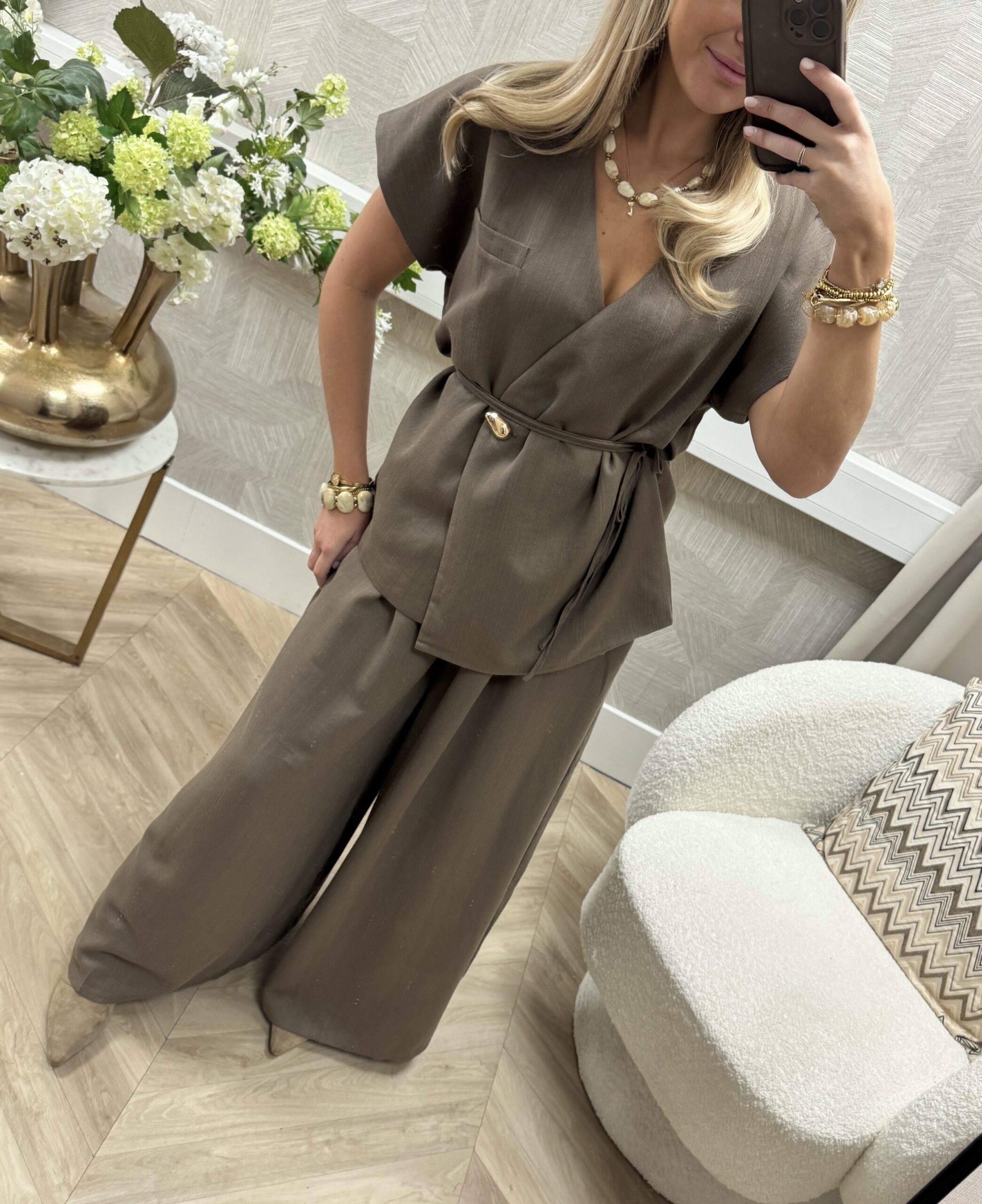 Hoe leuk is dit gilet! 🤎 De gouden knoop zorgt voor een subtiel chic detail, terwijl het koord in de taille mooi te strikken is voor een vrouwelijke fit. Perfect om te dragen met de bijpassende broek of jeans.