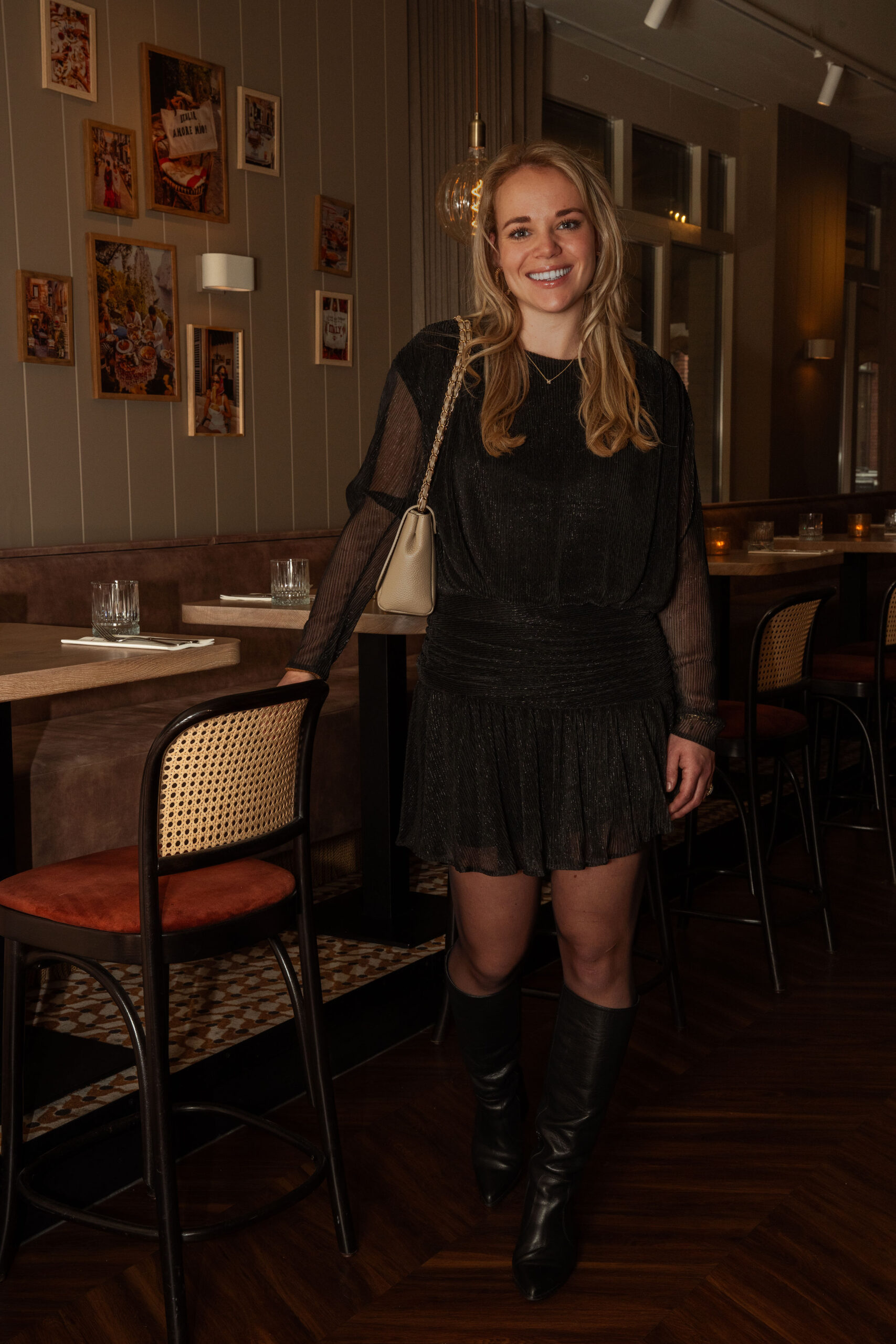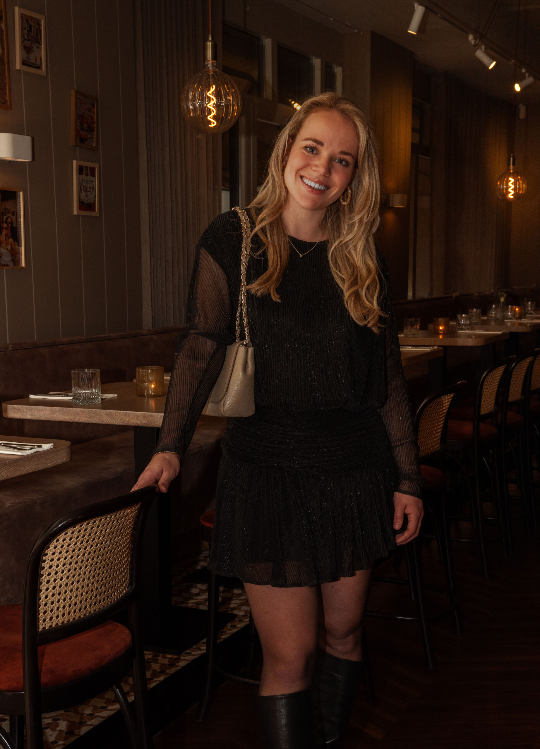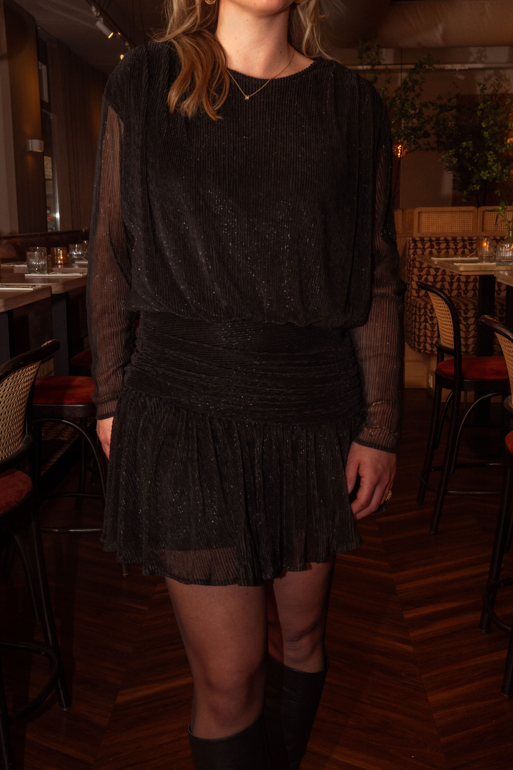 Hoe prachtig is deze zwarte glitterjurk?! De jurk heeft een subtiele glans door de fijne glitterdraad die door de plisséstof verweven zit. Het bovenstuk valt losjes en elegant, terwijl de taille mooi aansluit door de brede, geplooide band. De rok heeft een speelse plissé en zwiert mooi mee bij elke beweging. De mouwen zijn licht transparant voor een chique, feestelijke uitstraling.
