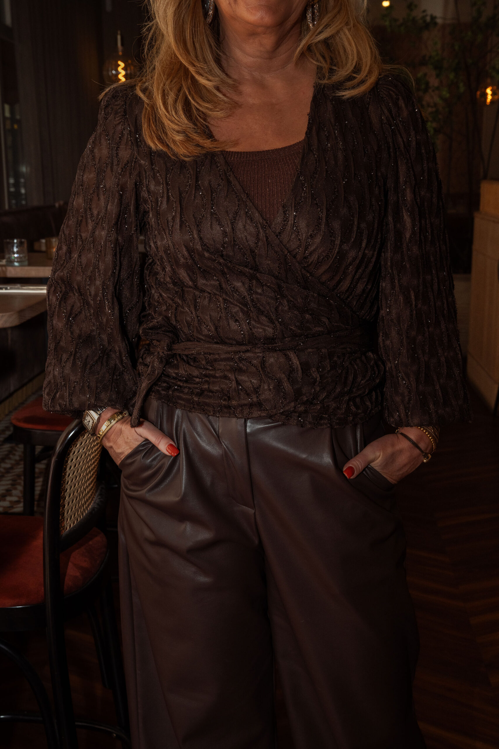 Wauw, hoe prachtig is deze bruine sparkle blouse! De stof heeft een luxe structuur met subtiele glansdraad, waardoor hij meteen een chique én feestelijke uitstraling krijgt. Het model is een wikkelmodel dat je taille mooi accentueert en super vrouwelijk valt.