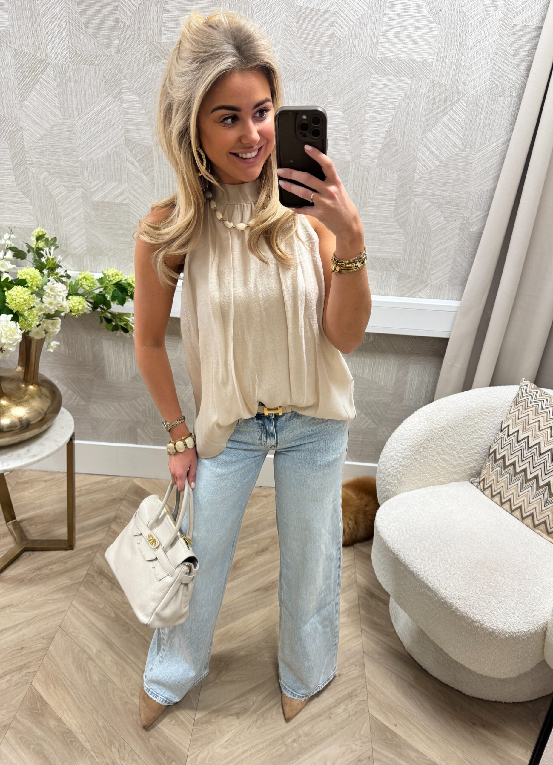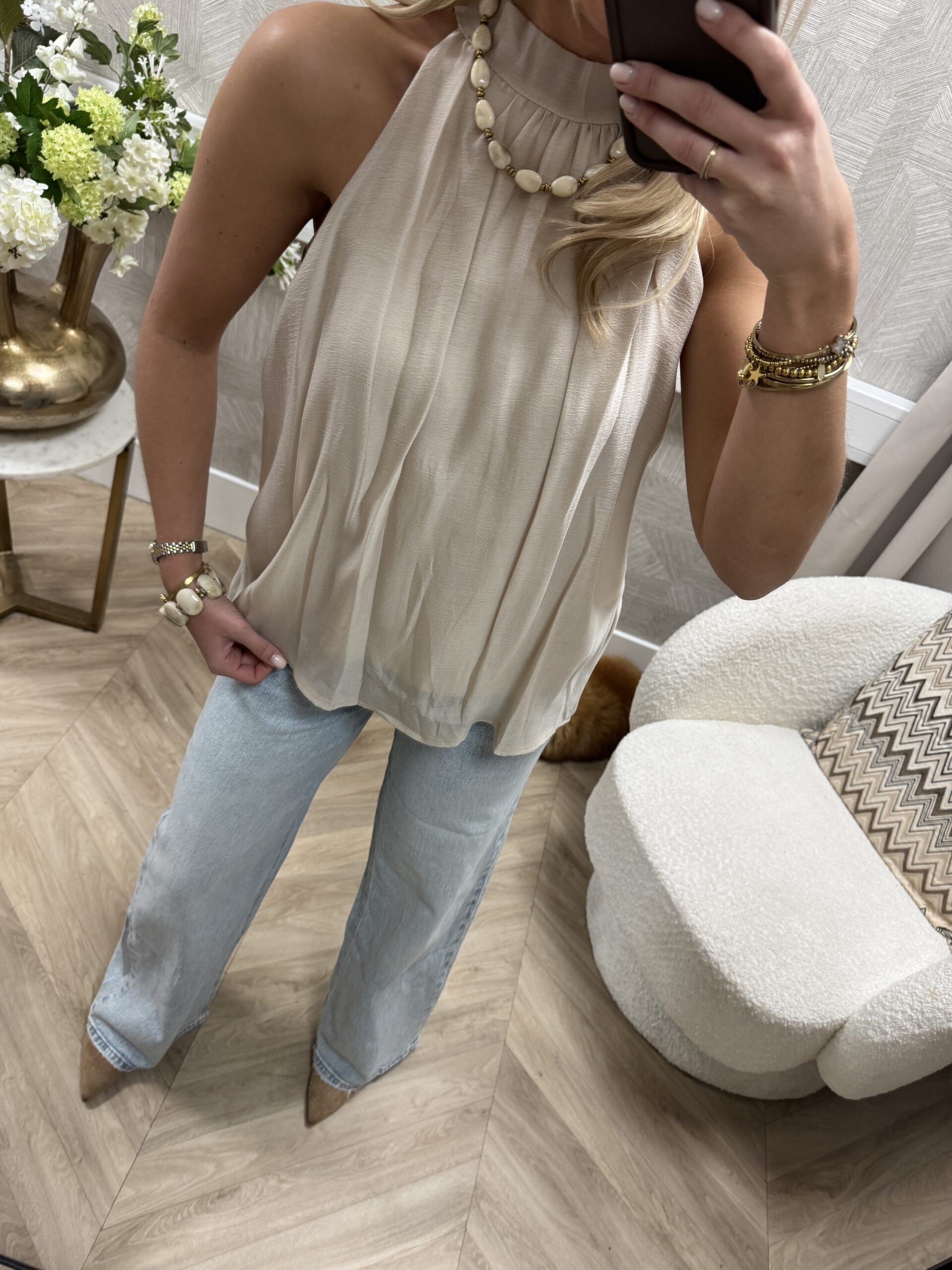 Een elegante haltertop met een vrouwelijke uitstraling. De soepel vallende stof geeft een luchtig gevoel, terwijl de open schouders zorgen voor een verfijnde look. Het strikdetail aan de achterkant maakt de top extra bijzonder en speels.