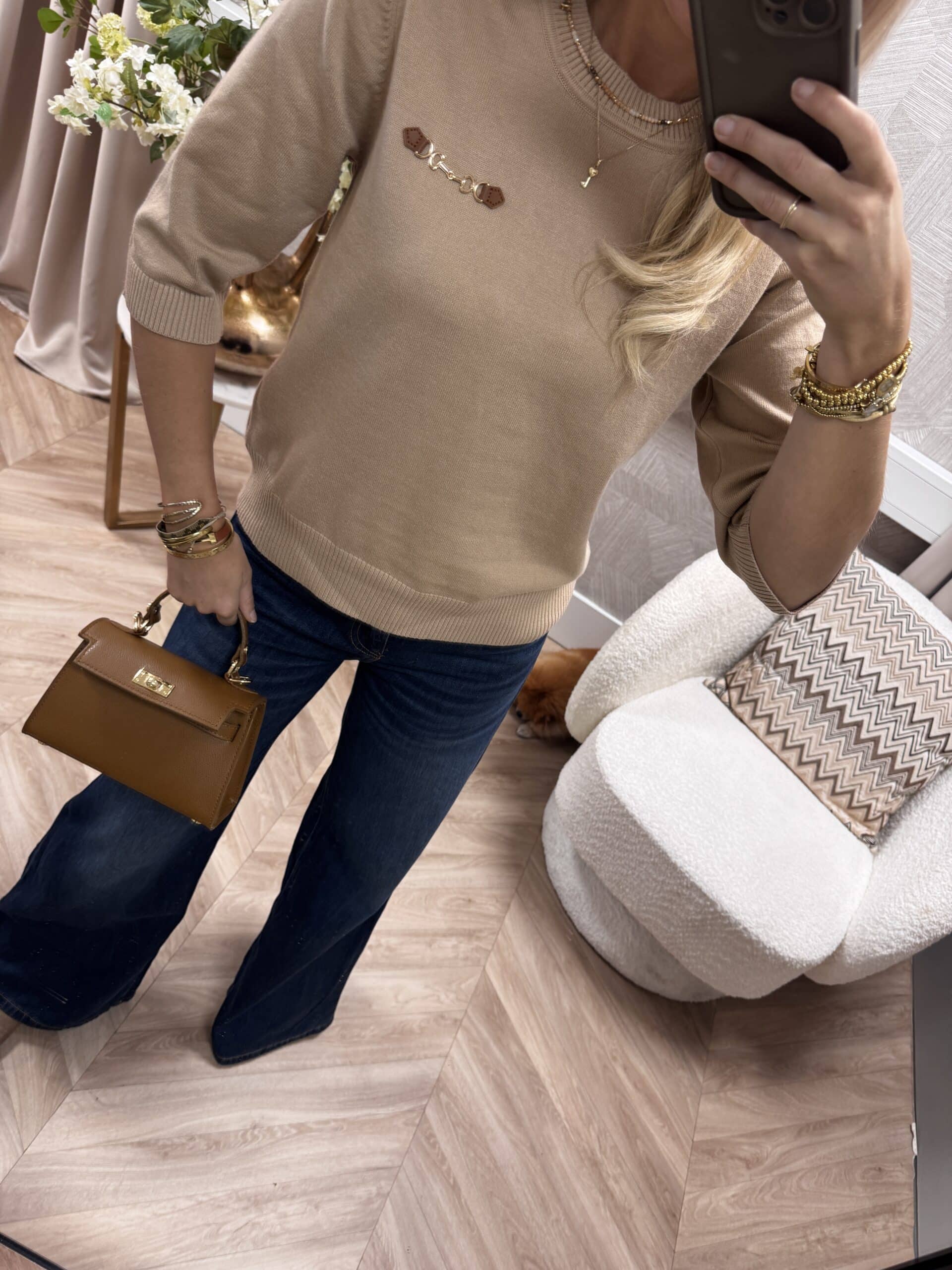 Deze knit is een stijlvolle basic met een luxe touch. Het model heeft een rechte fit met halflange mouw en is afgewerkt met een subtiel inspired detail op de borst. Dankzij de zachte stof en tijdloze kleuren is dit truitje perfect voor zowel casual als chique combinaties. Verkrijgbaar in bruin en camel.