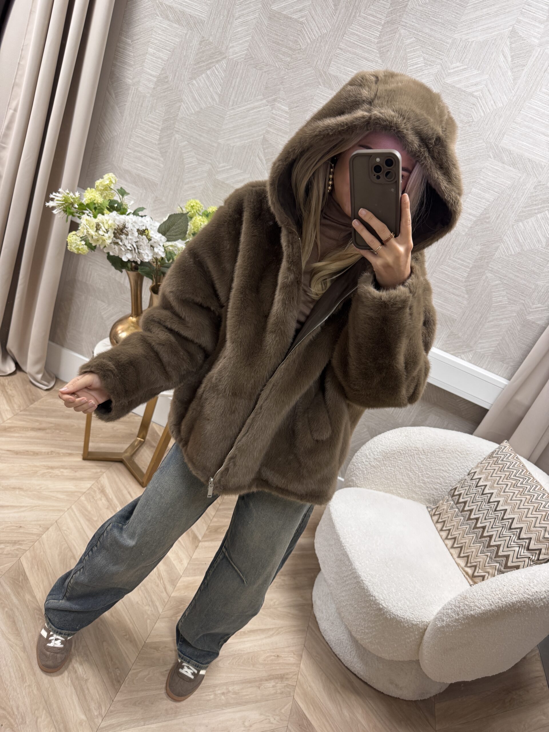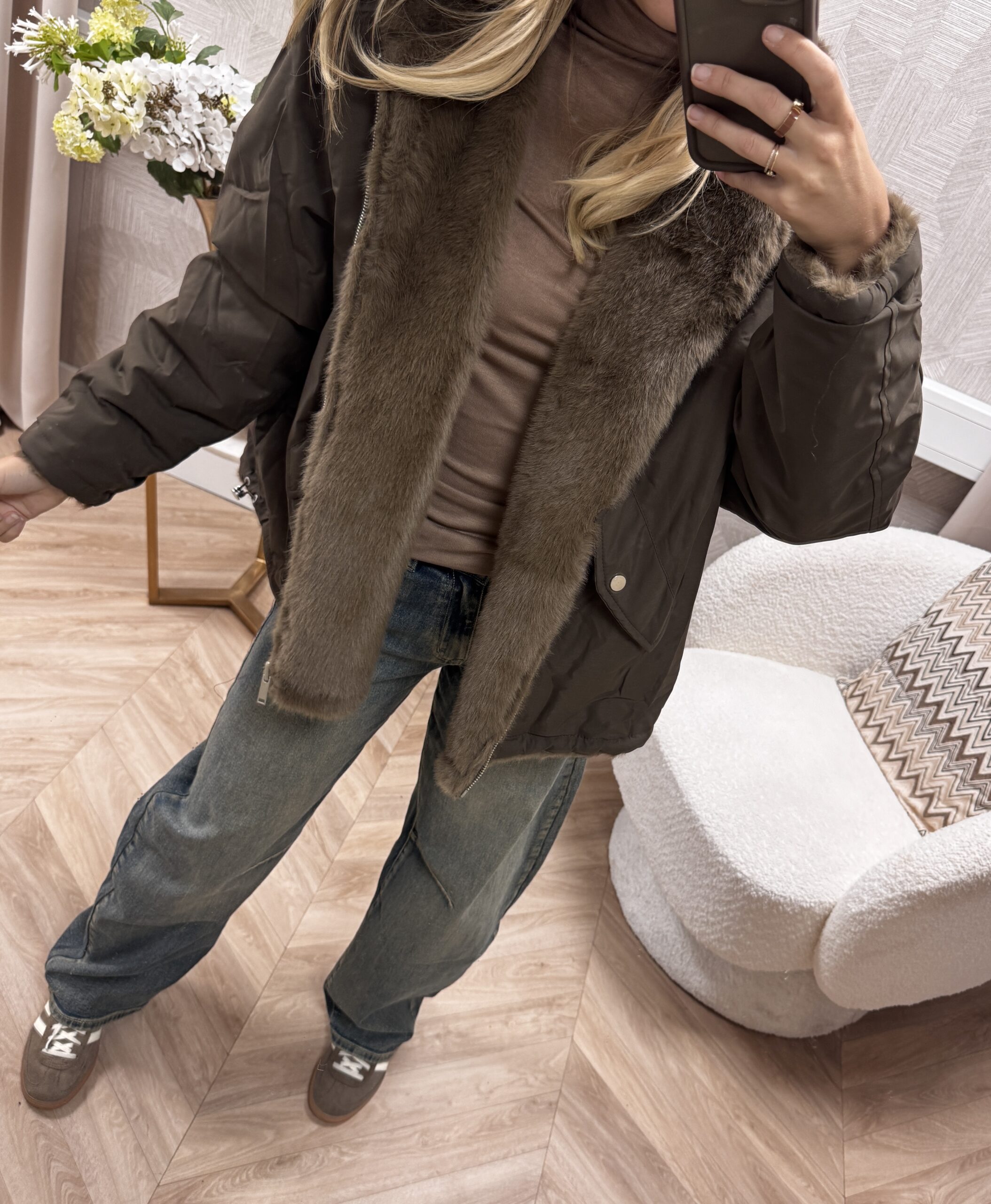 Deze prachtige winterjas is reversible en heeft aan de ene kant een gladde taupekleurige stof en aan de andere kant een heerlijk zachte faux fur kant. De oversized fit zorgt voor een nonchalante, cozy uitstraling terwijl hij toch superstijlvol blijft. Perfect voor koude dagen, van casual tot chic.