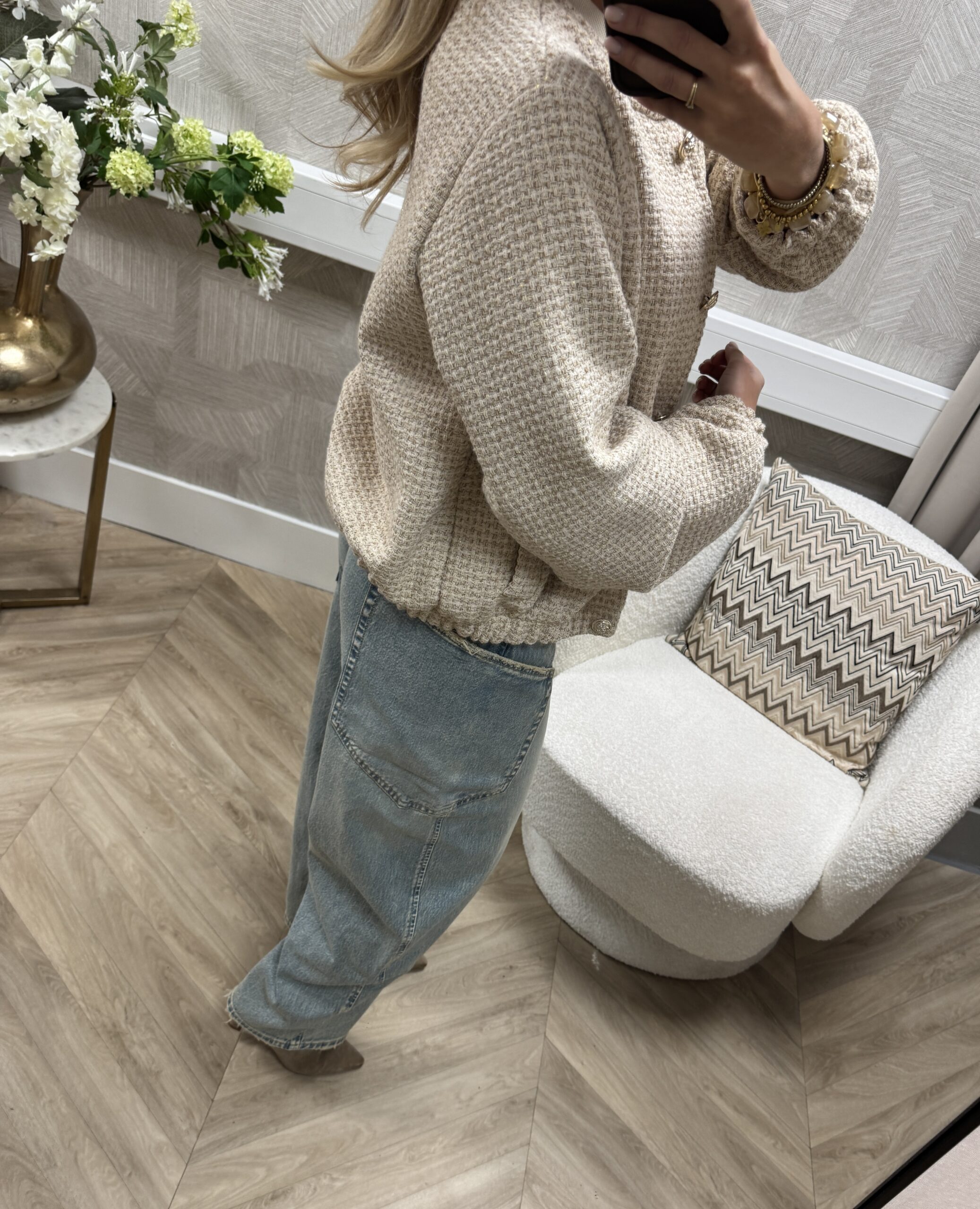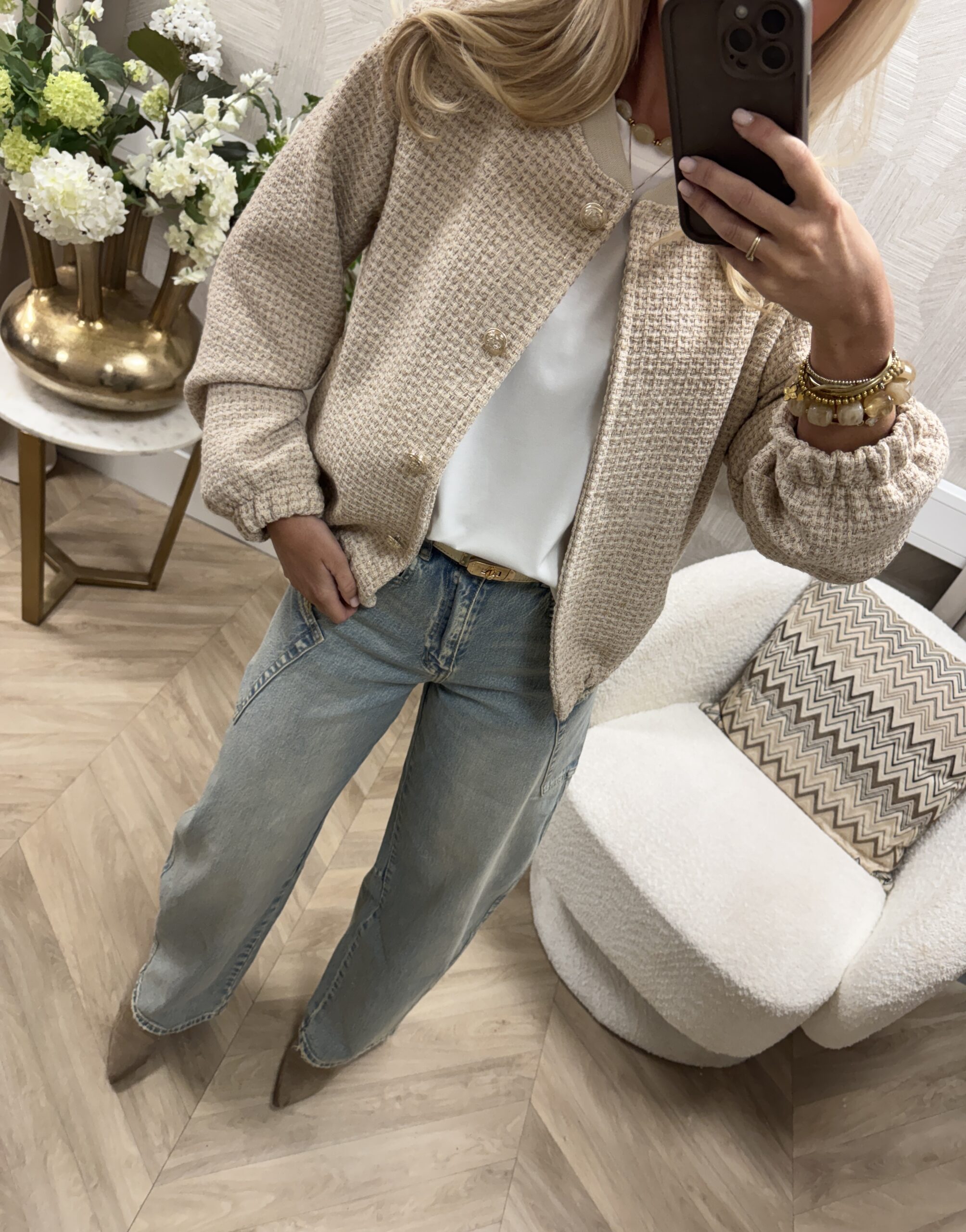 WEBSHOP ONLY. Een stijlvol jasje in een beige tint met gouden accenten. De tweed stof geeft het jasje een chique uitstraling en de gouden knopen zorgen voor een elegante finishing touch. Perfect om je outfit net dat beetje extra te geven.