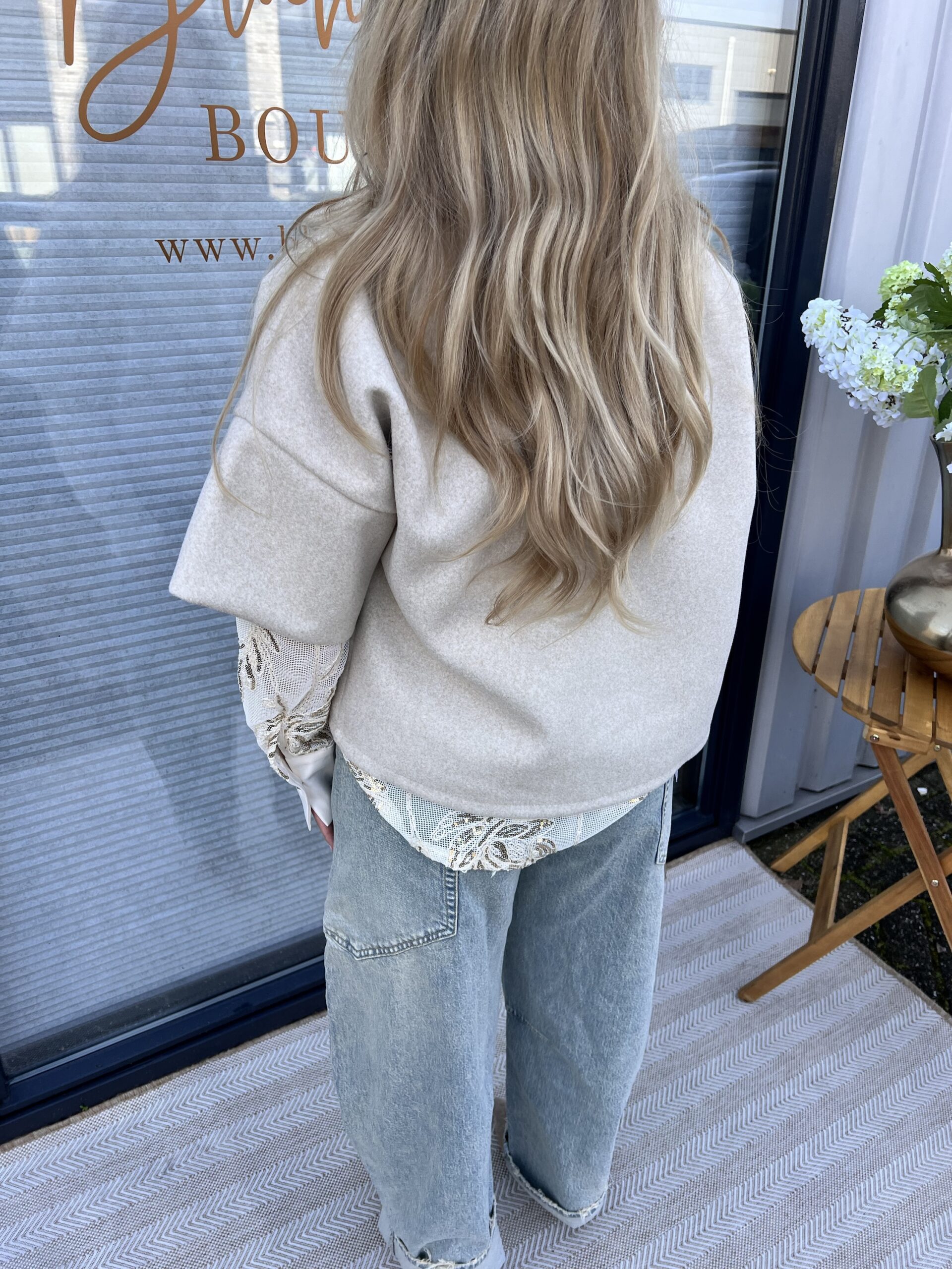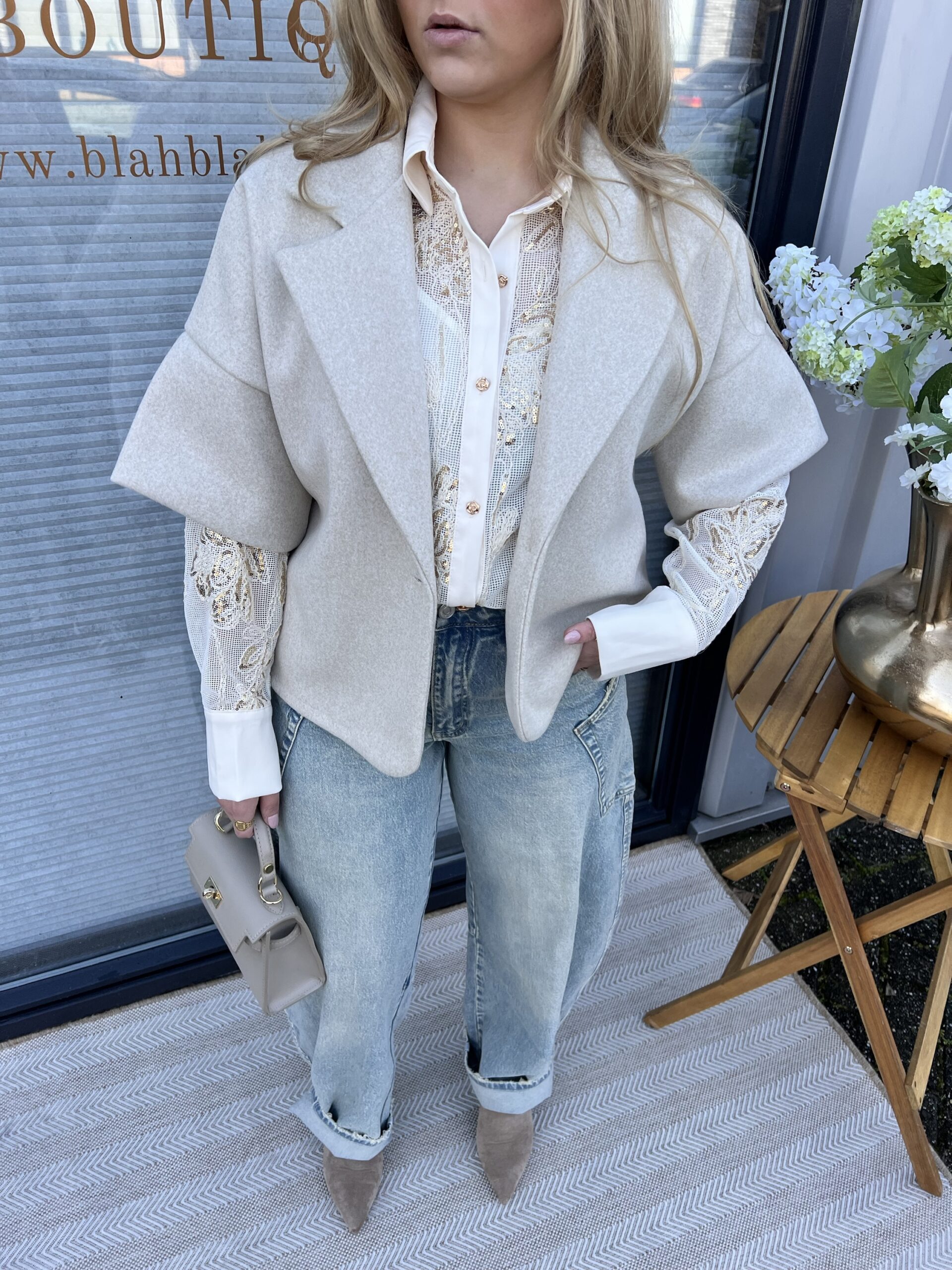 Dit beige jasje heeft een elegante, blazer-achtige uitstraling met een speelse twist. De korte mouwen geven het jasje een modieuze look en maken het perfect om te dragen over een blouse of top.
