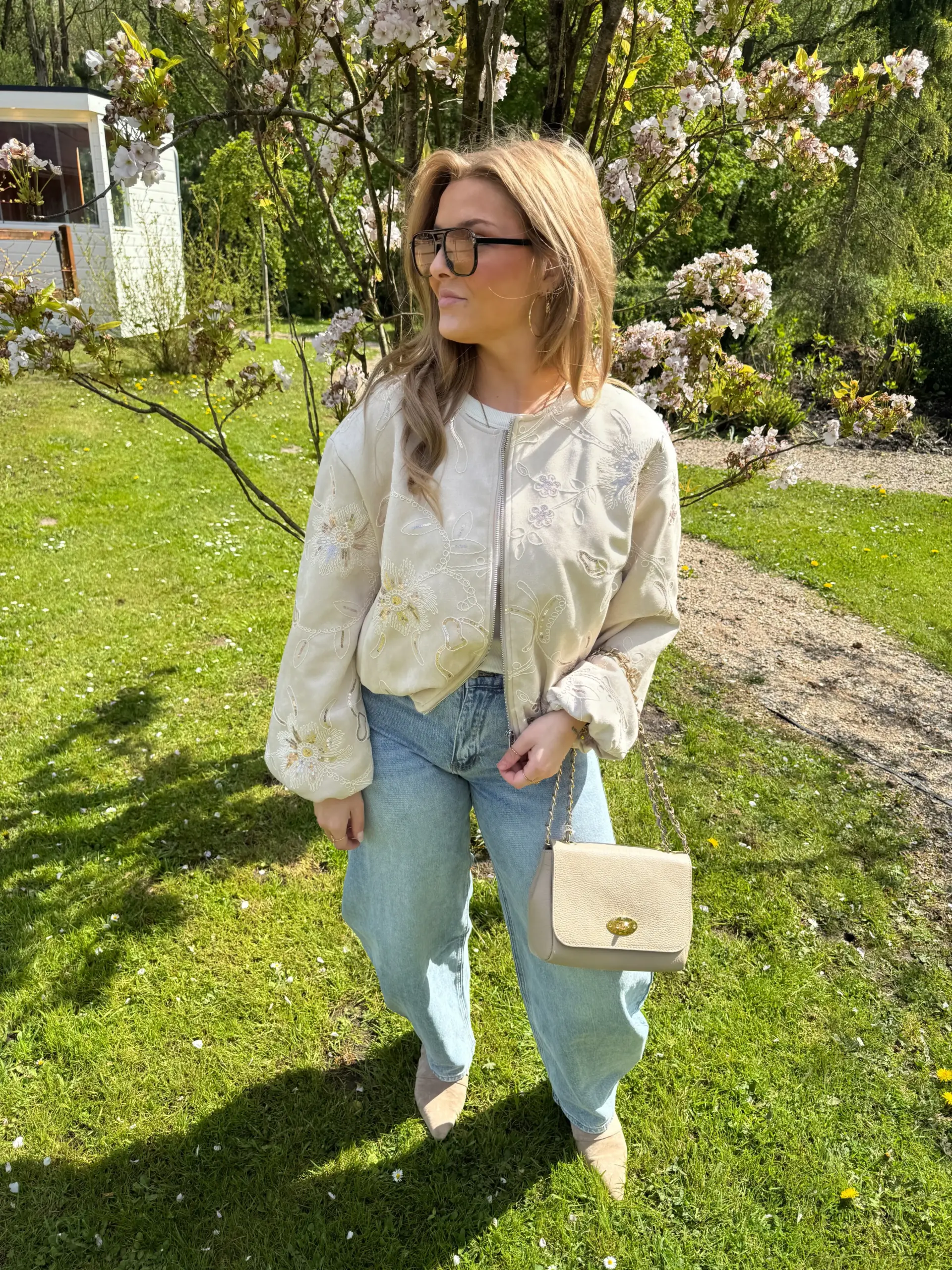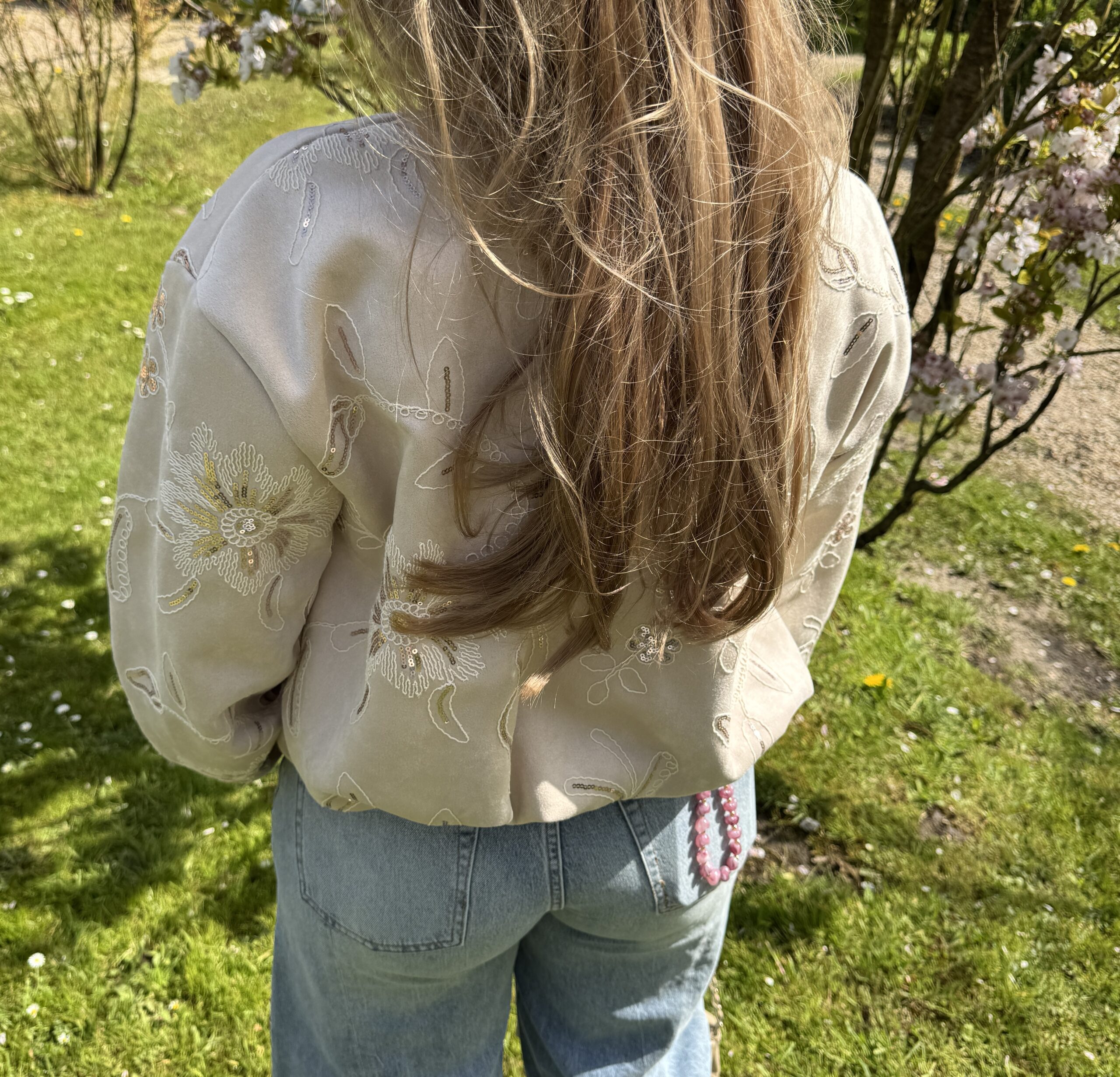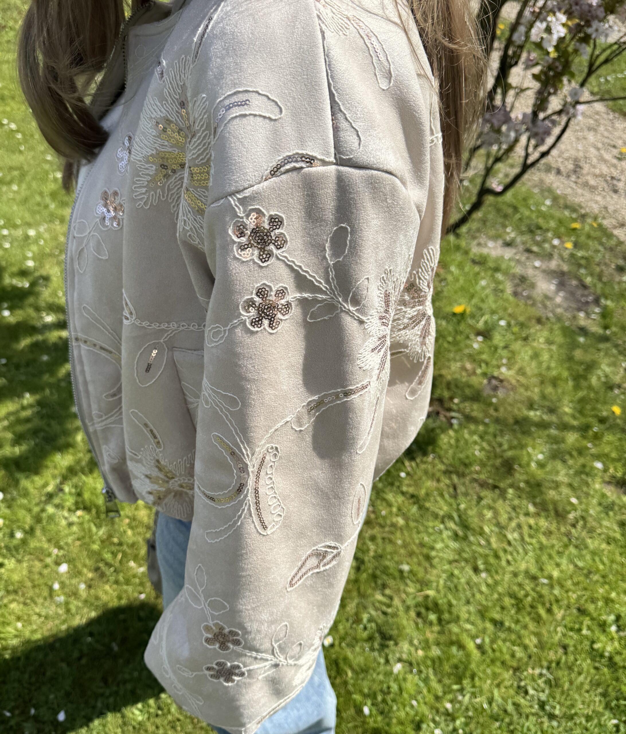 Een stijlvol en zacht bomber jasje in een beige tint met verfijnde geborduurde bloemen en subtiele pailletten. De luxe, soepele stof en het lichte bomber model geven het jasje een comfortabele maar chique uitstraling. Perfect om je outfit net dat beetje extra te geven ✨