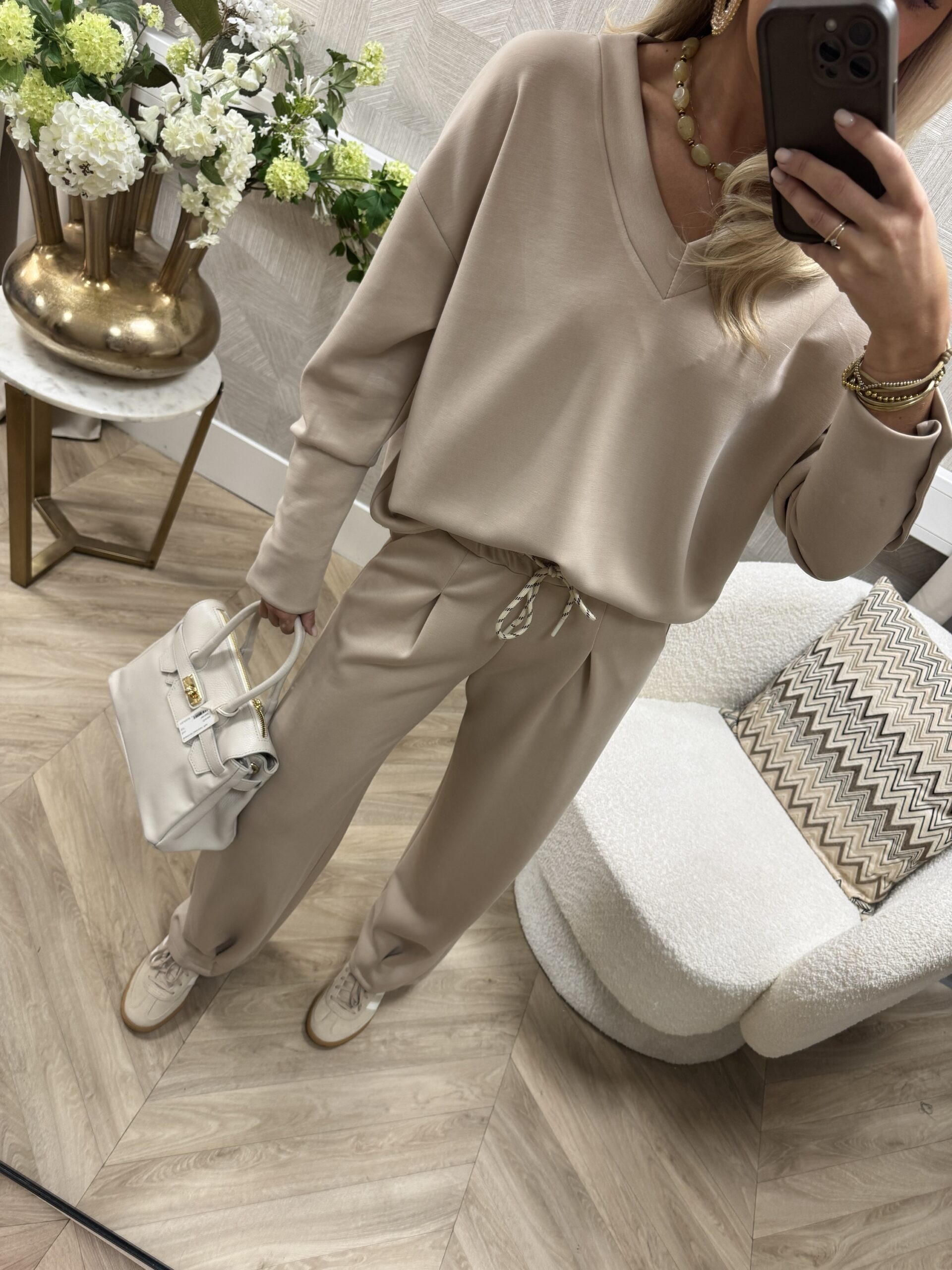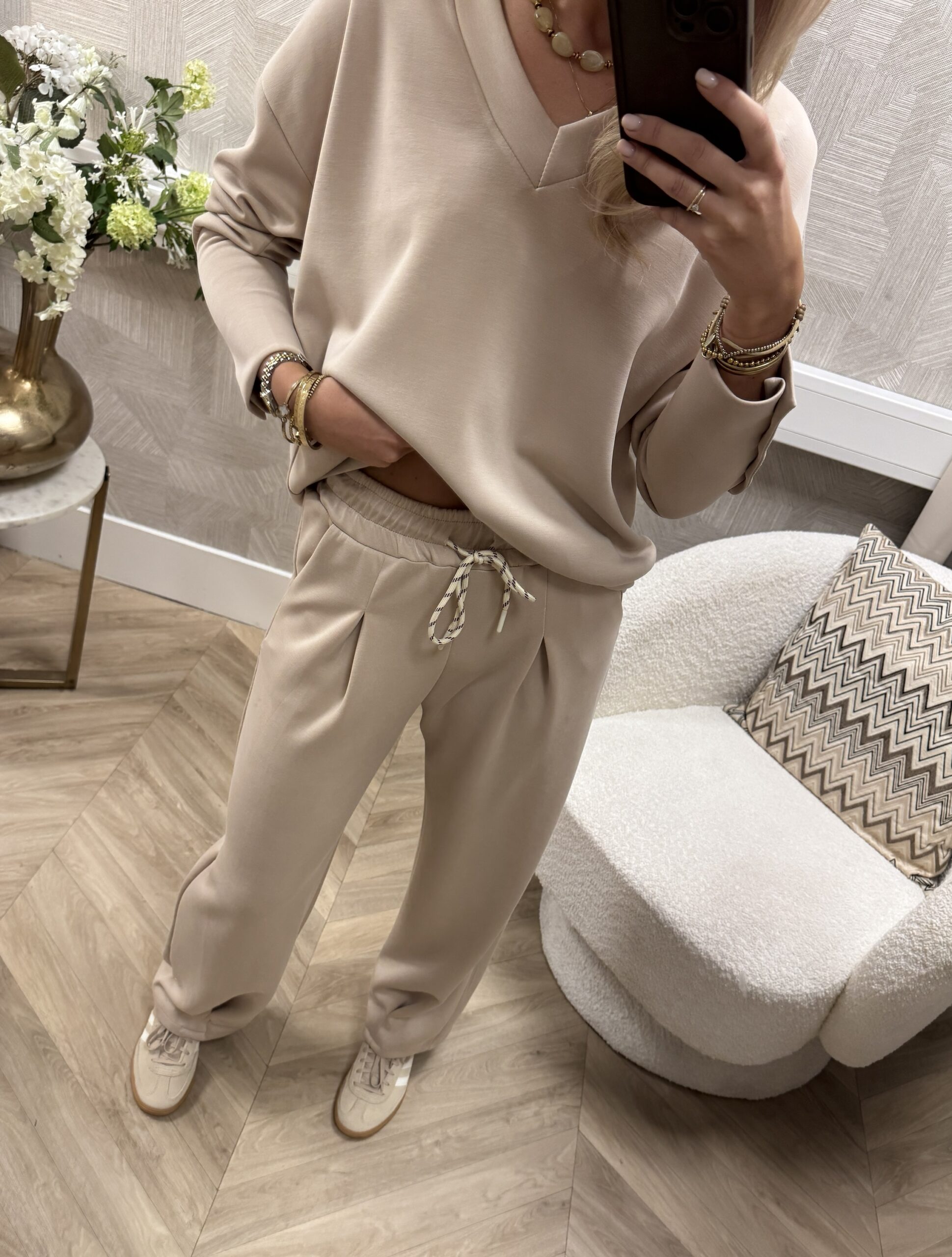 Een comfy jogset in een zachte beige tint. De top heeft een losvallende fit met een vrouwelijke V-hals en subtiele knoopjes op de mouw. De bijpassende broek heeft een elastische tailleband en een licht uitlopende pijp (ballonfit) voor een stijlvolle look.