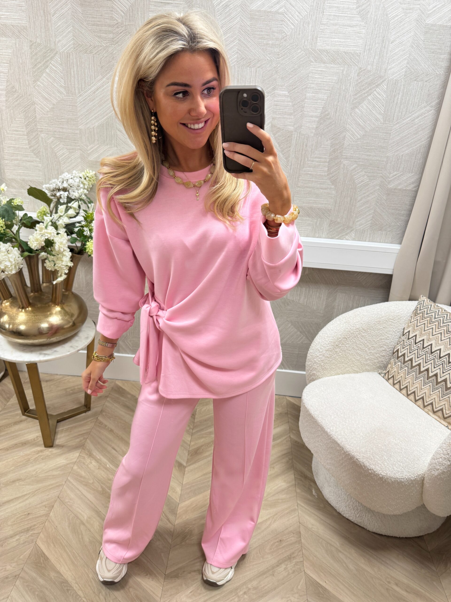 Een comfy maar stijlvolle jogset met een vrouwelijke twist. De top heeft een losvallende fit met een speels strikdetail aan de zijkant, wat zorgt voor een flatterend effect. De bijpassende broek heeft een elastische tailleband en een rechte pijp en draagt heerlijk comfortabel.