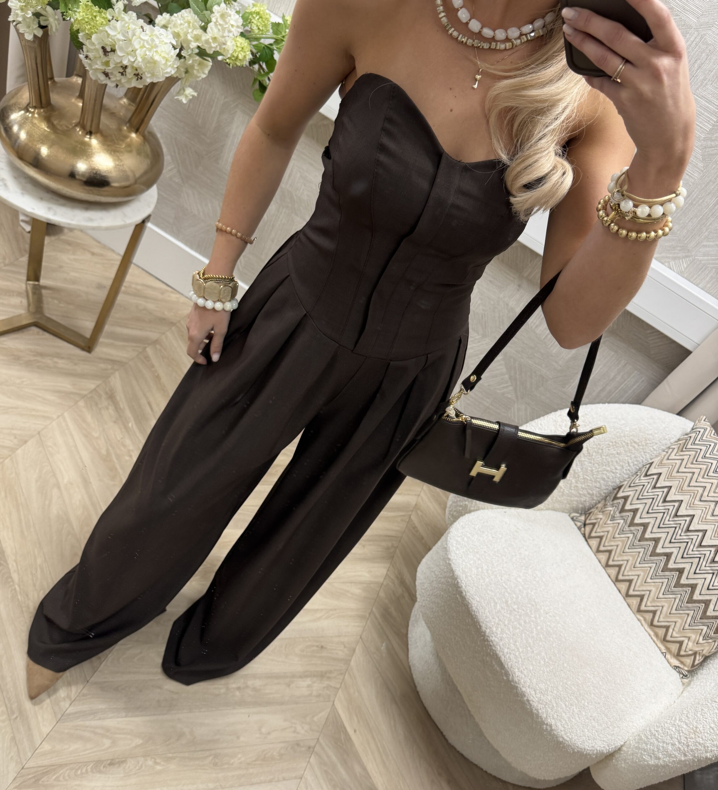 Een elegante strapless jumpsuit in een mooie bruine tint. De aangesloten bovenkant geeft een vrouwelijke pasvorm, terwijl de smock achterkant zorgt voor extra comfort en een fijne fit. De wijde pijpen vallen soepel langs het been en geven een stijlvolle uitstraling.
