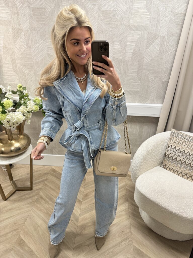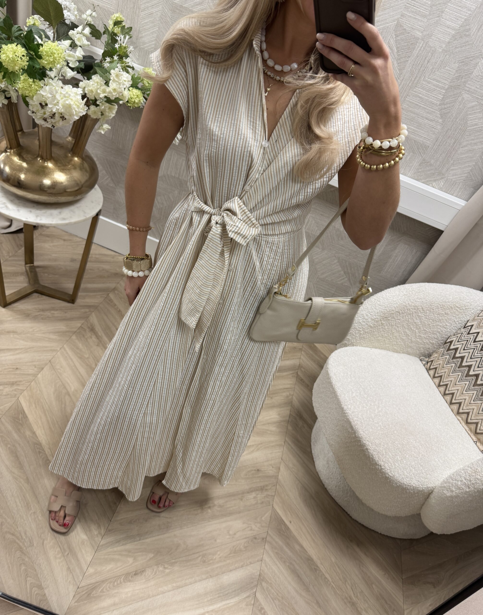 Een luchtige jurk met een subtiele streep in een beige tint en een vrouwelijke overslaglook. De knoopjes en het strikdetail in de taille zorgen voor een mooie pasvorm en geven de jurk een speelse touch.