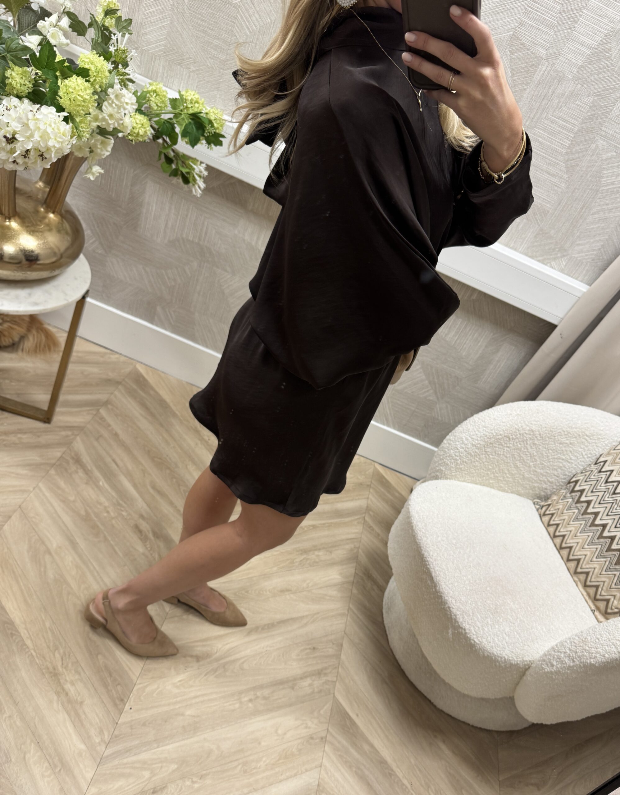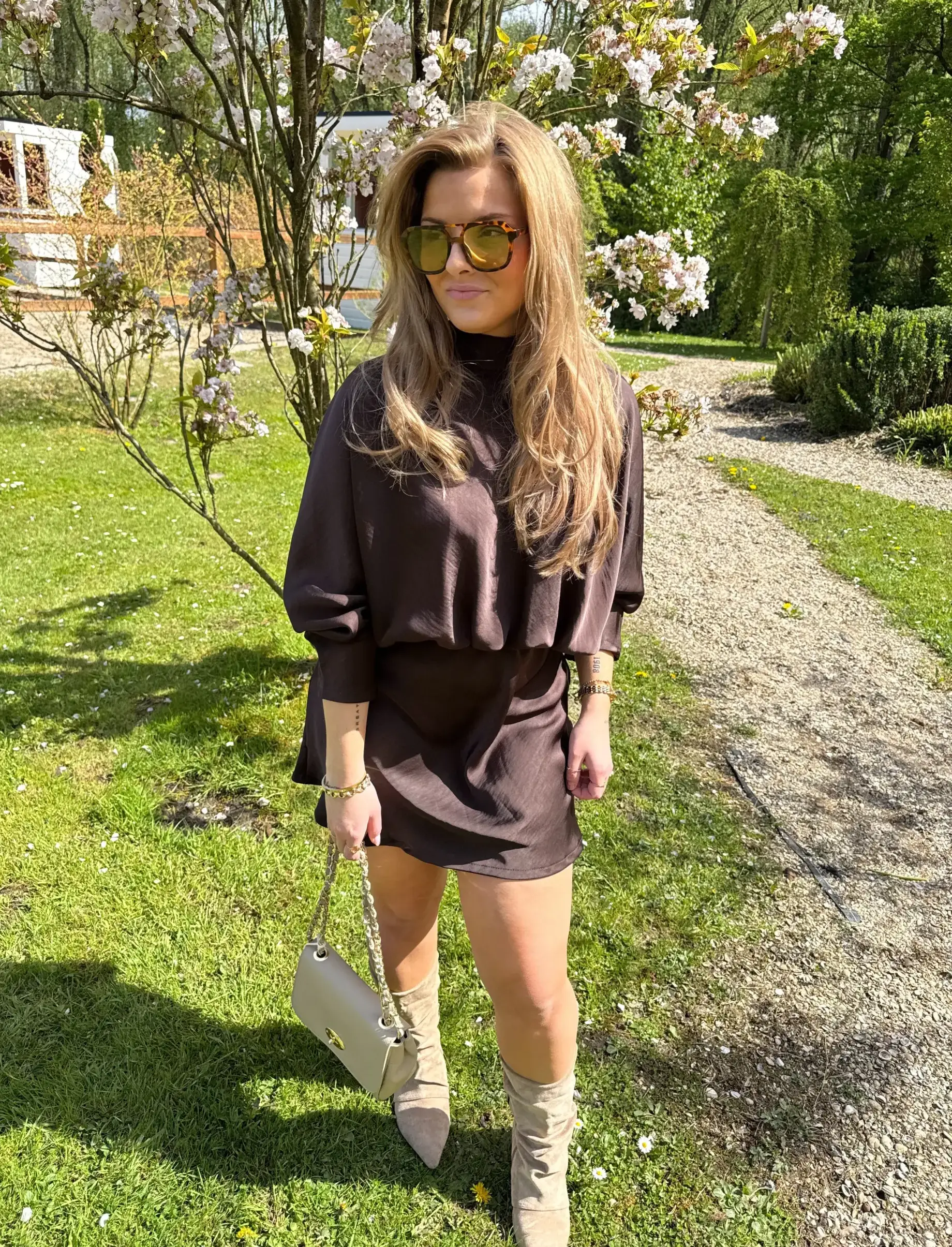 Een stijlvolle bruine jurk met een mooie, vloeiende satijn fit. De top valt losjes en komt mooi samen in het midden, wat zorgt voor een subtiel gevormde look. De strik op de achterkant geeft een speelse en elegante touch.