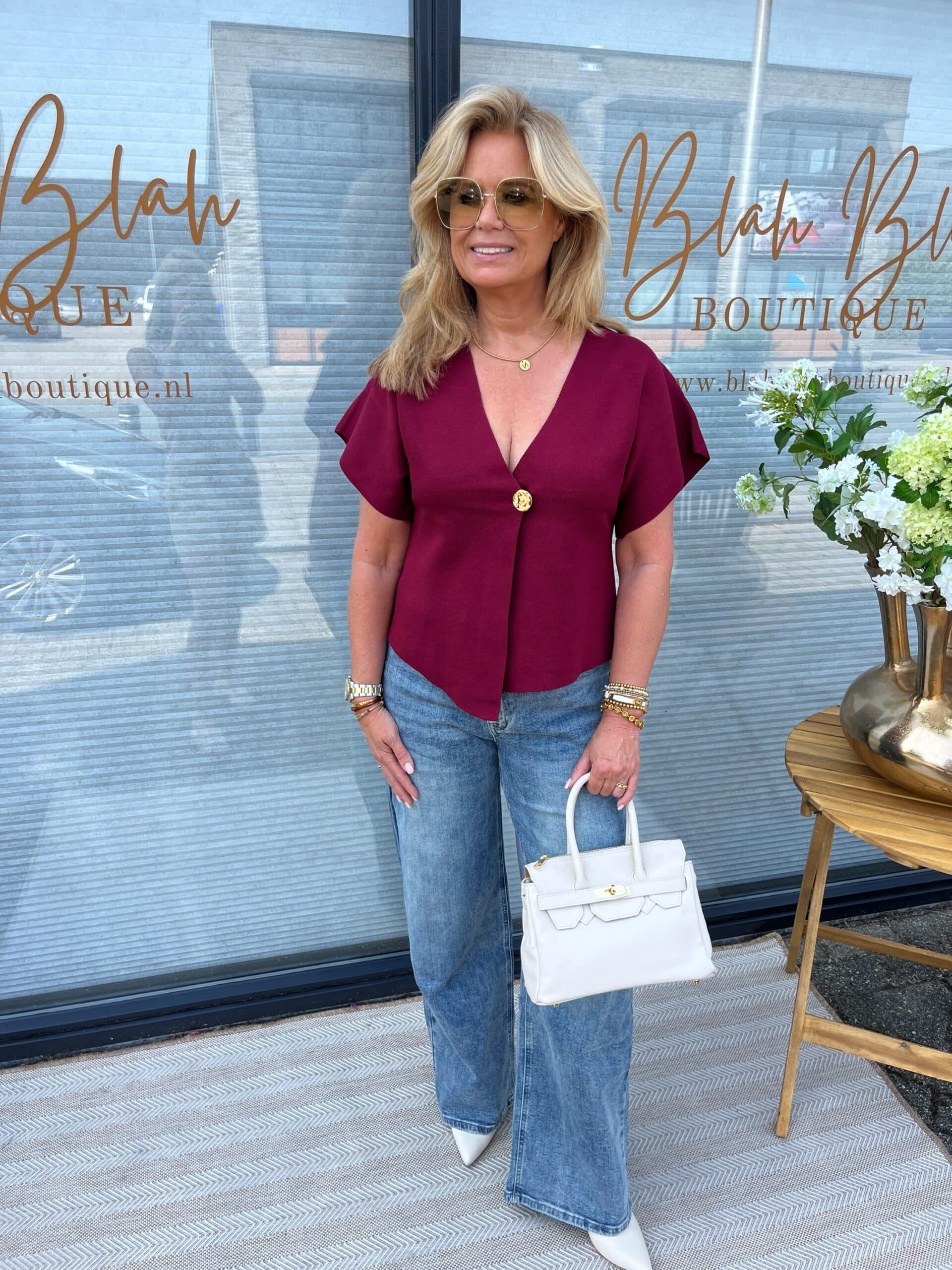 Hoe leuk zijn deze truitjes?! <3 Het model heeft een diepe V-hals, korte mouwen en een elegante gouden knoopsluiting die zorgt voor een luxe touch. De licht uitlopende mouwtjes en het iets langere voorpand creëren een flatteus silhouet. Gemaakt van een zachte, fijngebreide stof die comfortabel meebeweegt. V