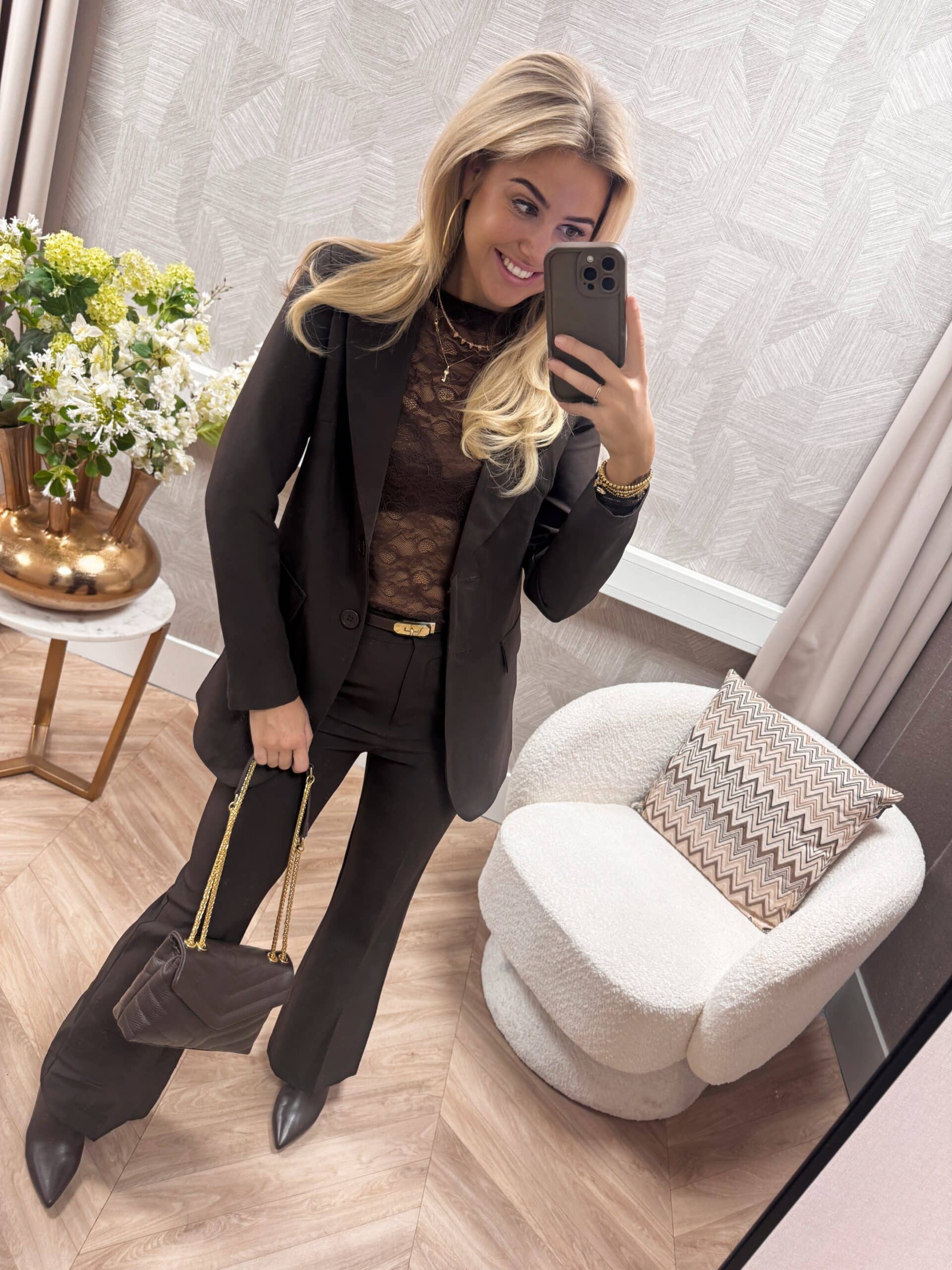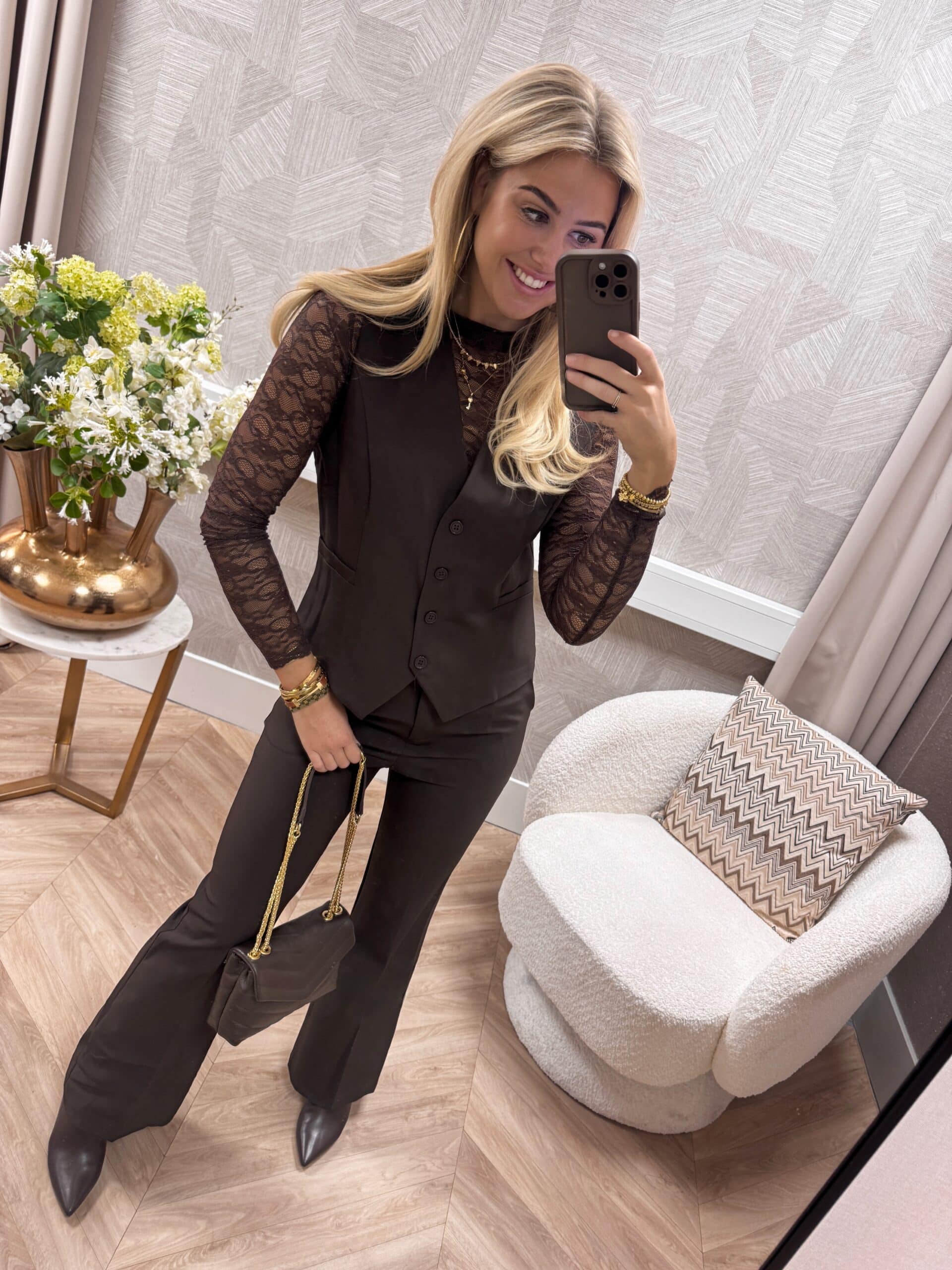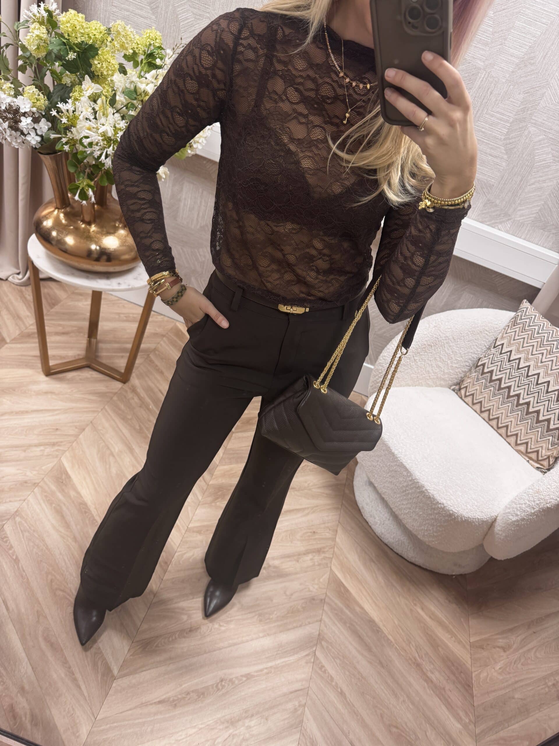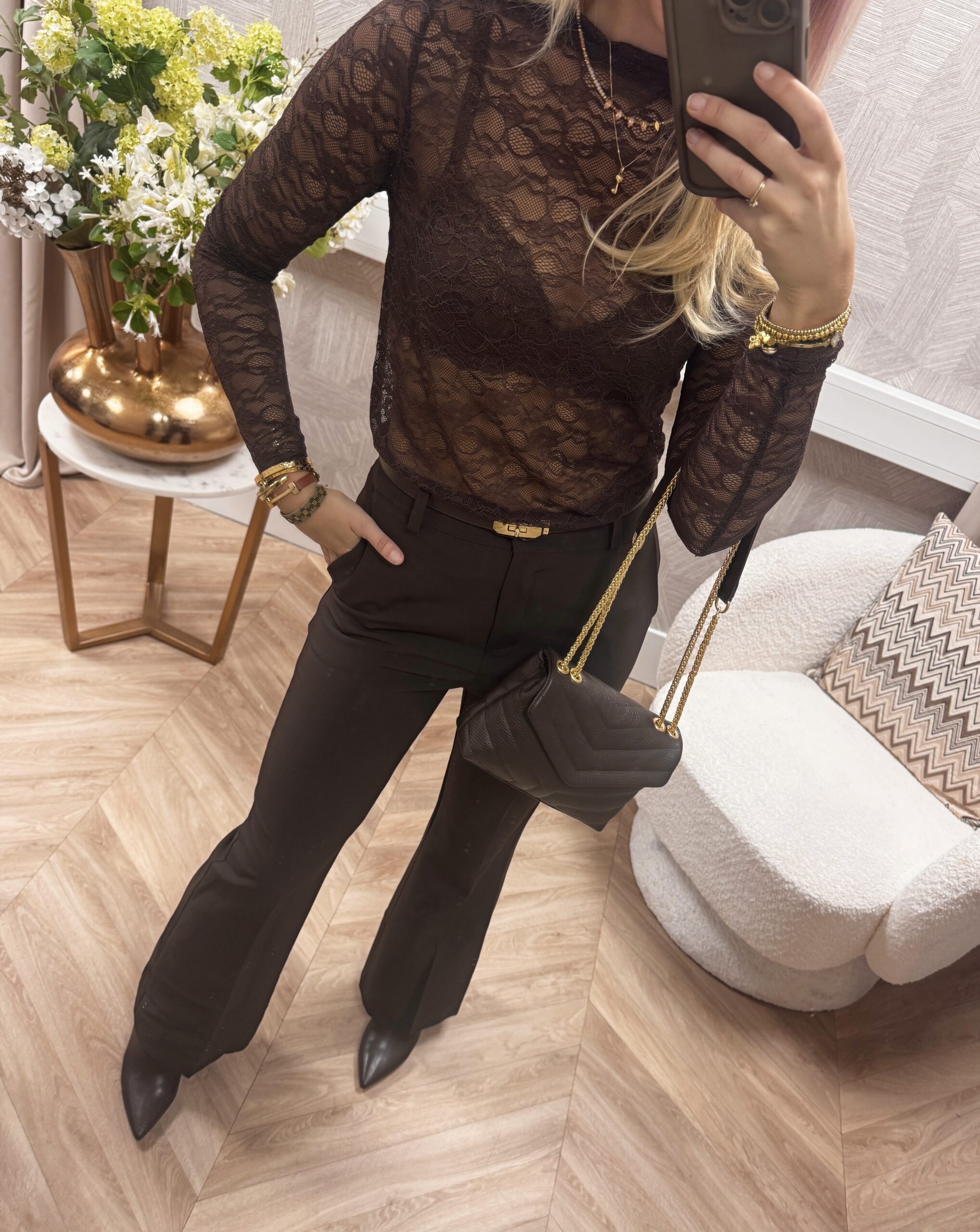 Deze lace top is de perfecte mix van vrouwelijk en stijlvol. De semi-transparante kantstof geeft een elegante en chique uitstraling, terwijl de aangesloten pasvorm zorgt voor een mooie, flatterende look. Draag hem onder een blazer voor een classy outfit of combineer hem speels met een high-waist broek of rok. Een echte musthave voor in je garderobe!