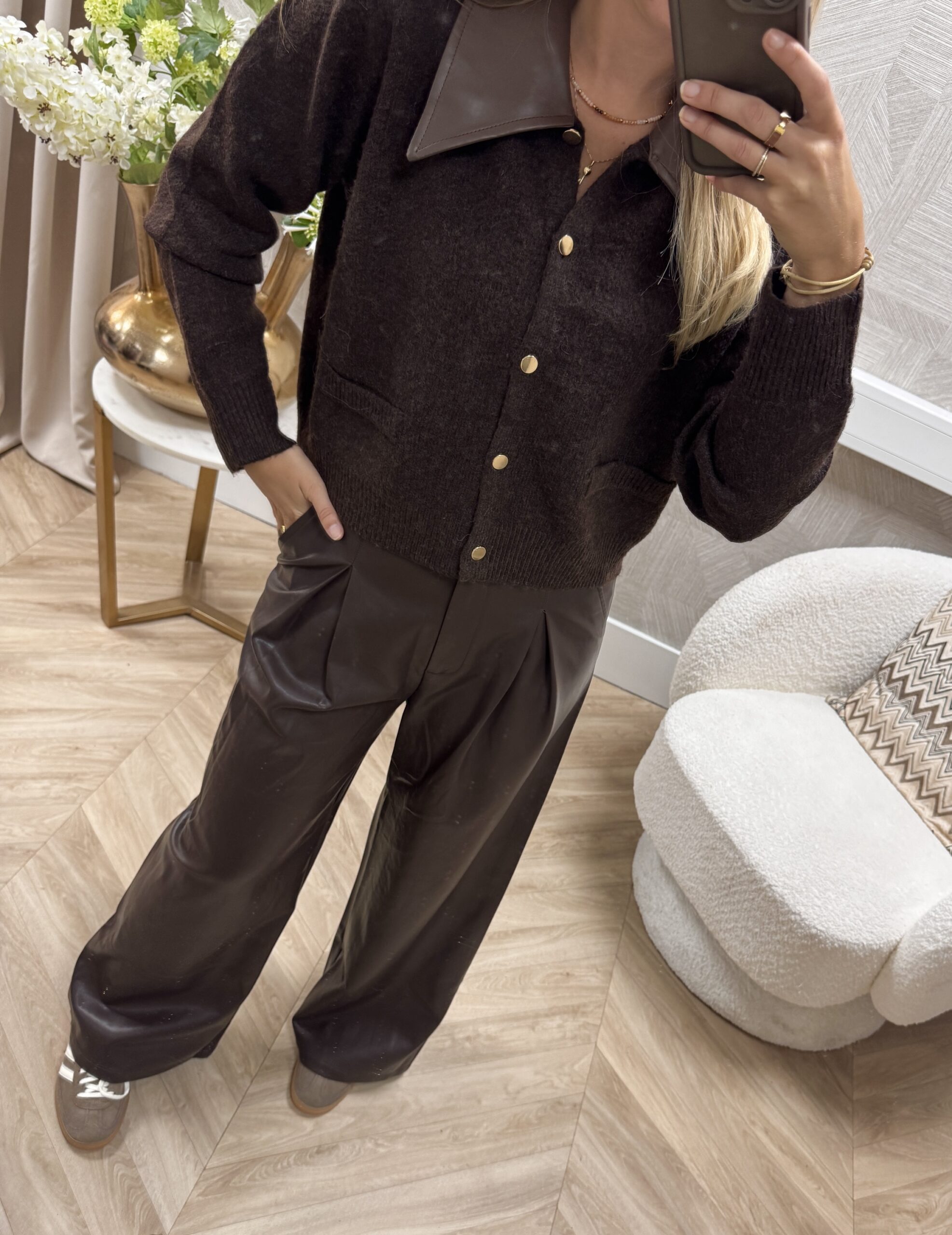 Deze stijlvolle leatherlook broek in donkerbruin is een echte eyecatcher voor het najaar. Het model heeft een hoge taille, rechte pijpen en elegante plooien aan de voorkant.De stof is soepel en voelt zacht aan, waardoor de broek niet stug zit maar juist comfortabel draagt.