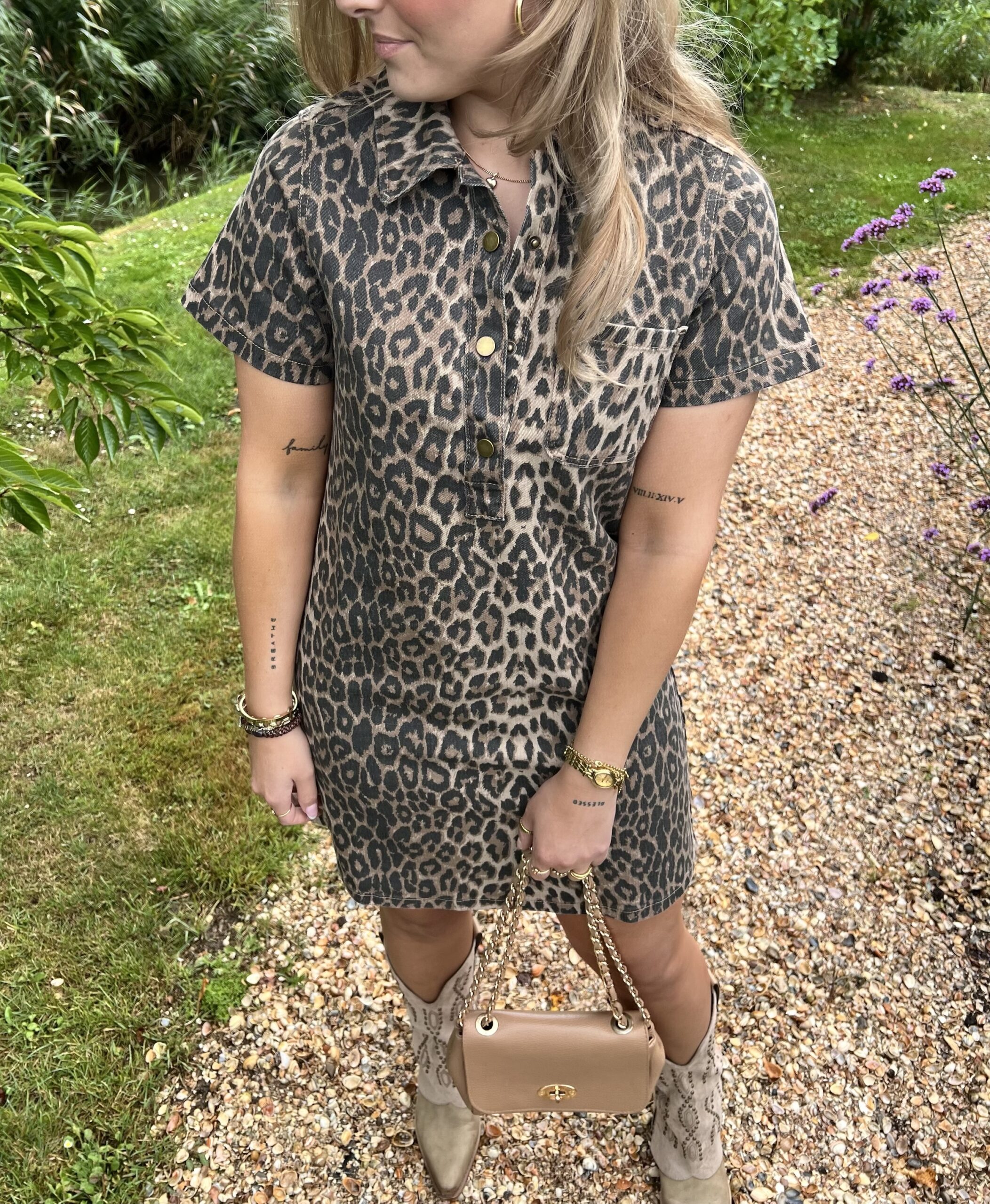 Deze leopard jurk is een stoere eyecatcher met een vrouwelijke fit. Gemaakt van een stevige stof met denim look, waardoor hij comfortabel draagt én mooi in model blijft. De korte mouwen, kraag en doorknoopsluiting zorgen voor een casual touch, terwijl de leopard print hem net dat beetje extra geeft.