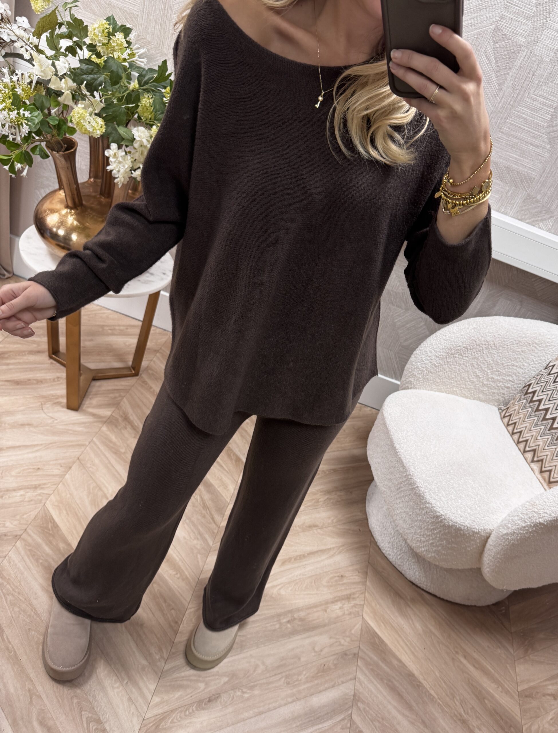 Deze zachte loungewear set is ideaal voor comfortabele dagen thuis of een casual dagje uit. De stof voelt superzacht aan en de relaxte fit zorgt voor ultiem draagcomfort. De top heeft een lichte off-shoulder look en de broek heeft een rechte, soepele pijp.