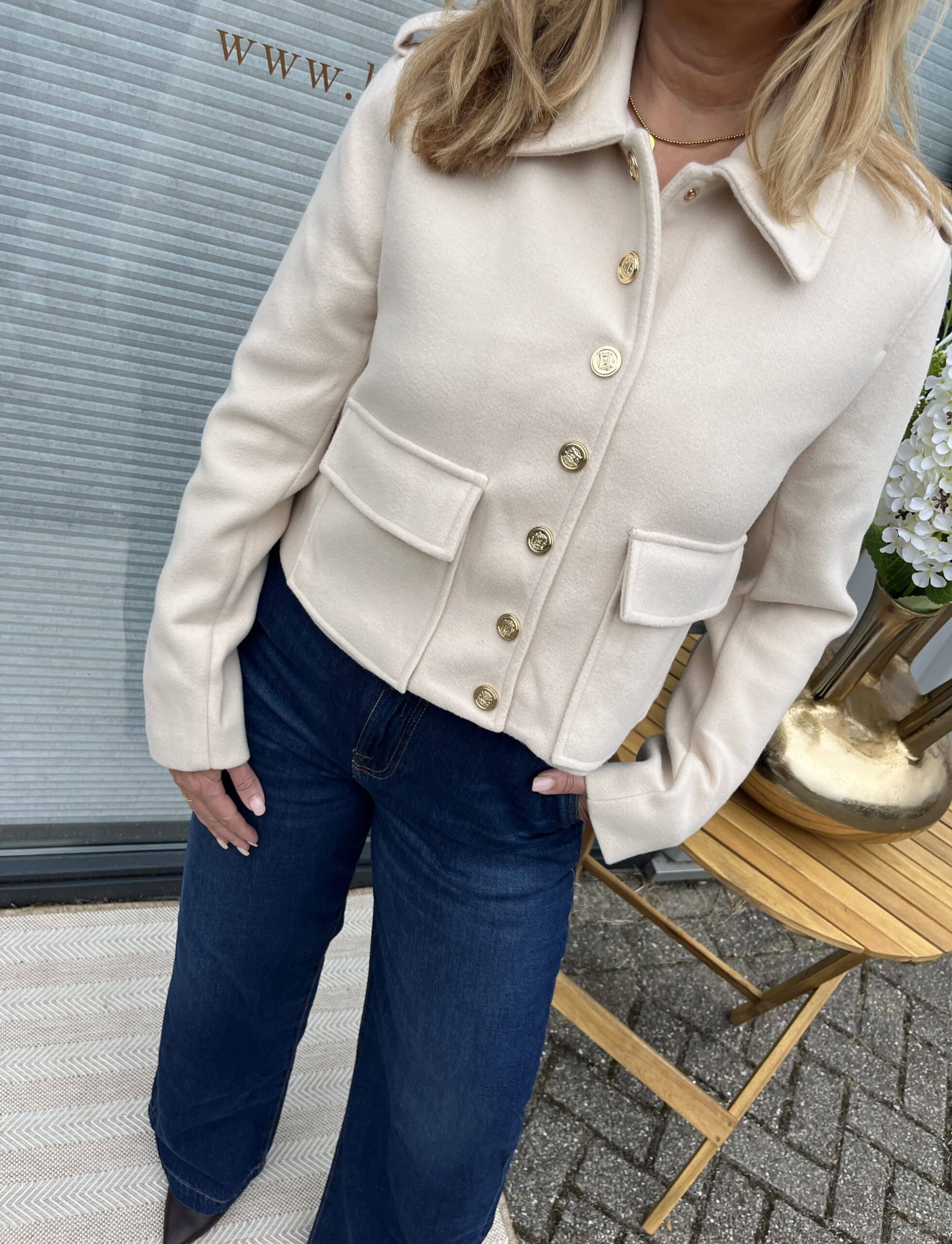 Dit korte jack is een elegante basic die je makkelijk combineert. Het model heeft een iets kortere fit met een klassieke kraag, grote klepzakken en gouden knopen die zorgen voor een chique uitstraling. Door de rechtvallende pasvorm is het jack comfortabel en tegelijk stijlvol, ideaal voor zowel casual als geklede looks.