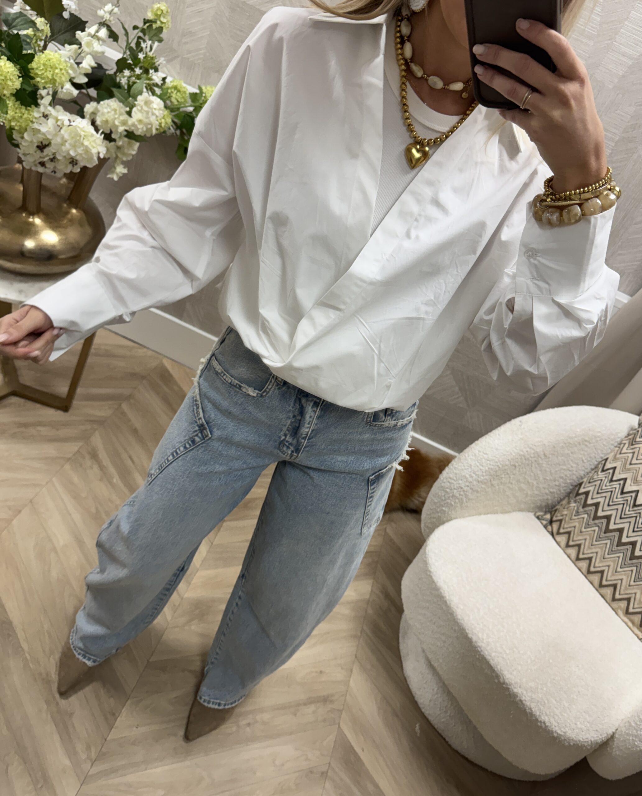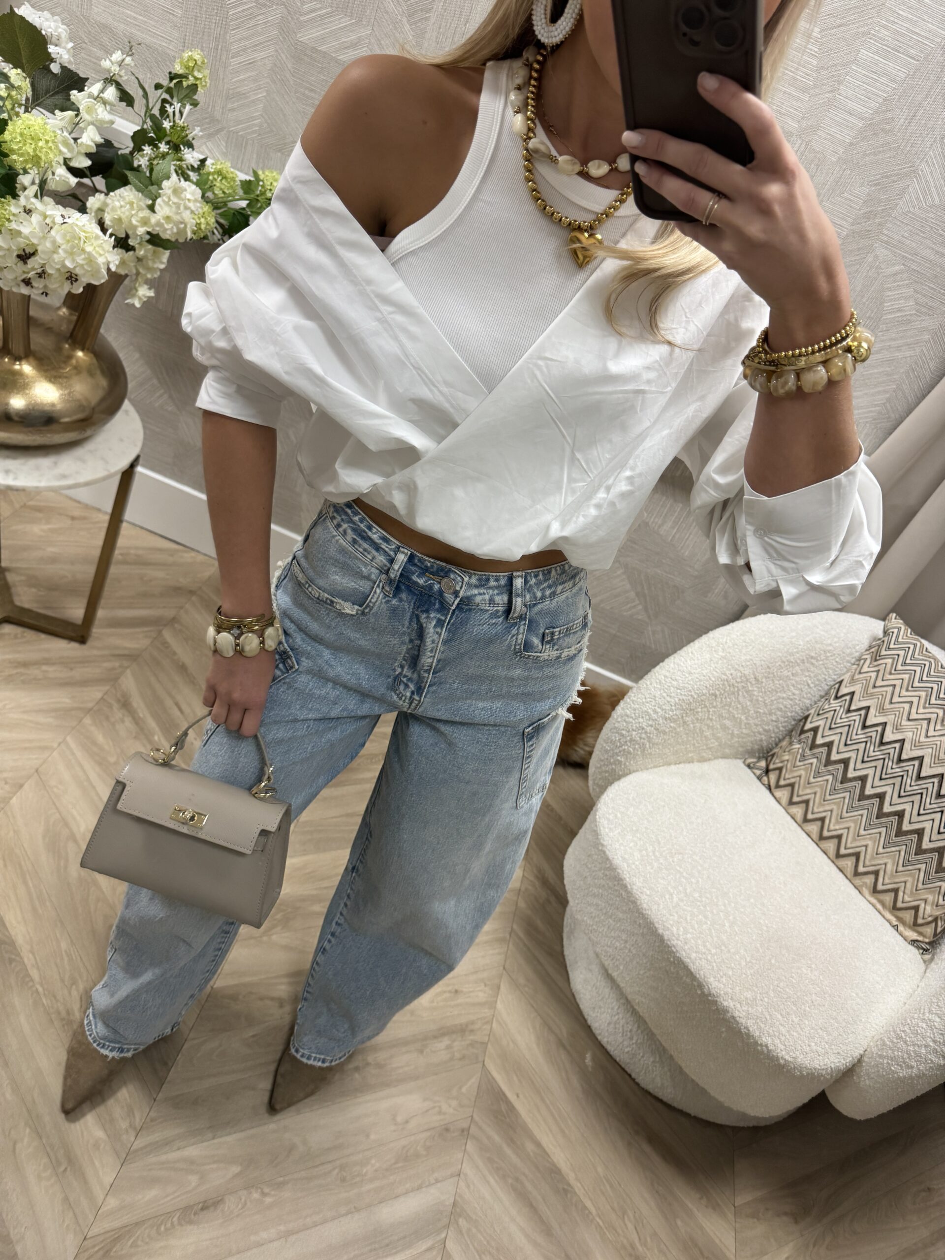 Stijlvolle witte blouse met een moderne twist. De blouse heeft een klassieke kraag en een speelse gelaagde look met een top eronder, wat zorgt voor een trendy uitstraling. De blouse kan zowel off-shoulder of als overslag gedragen worden.