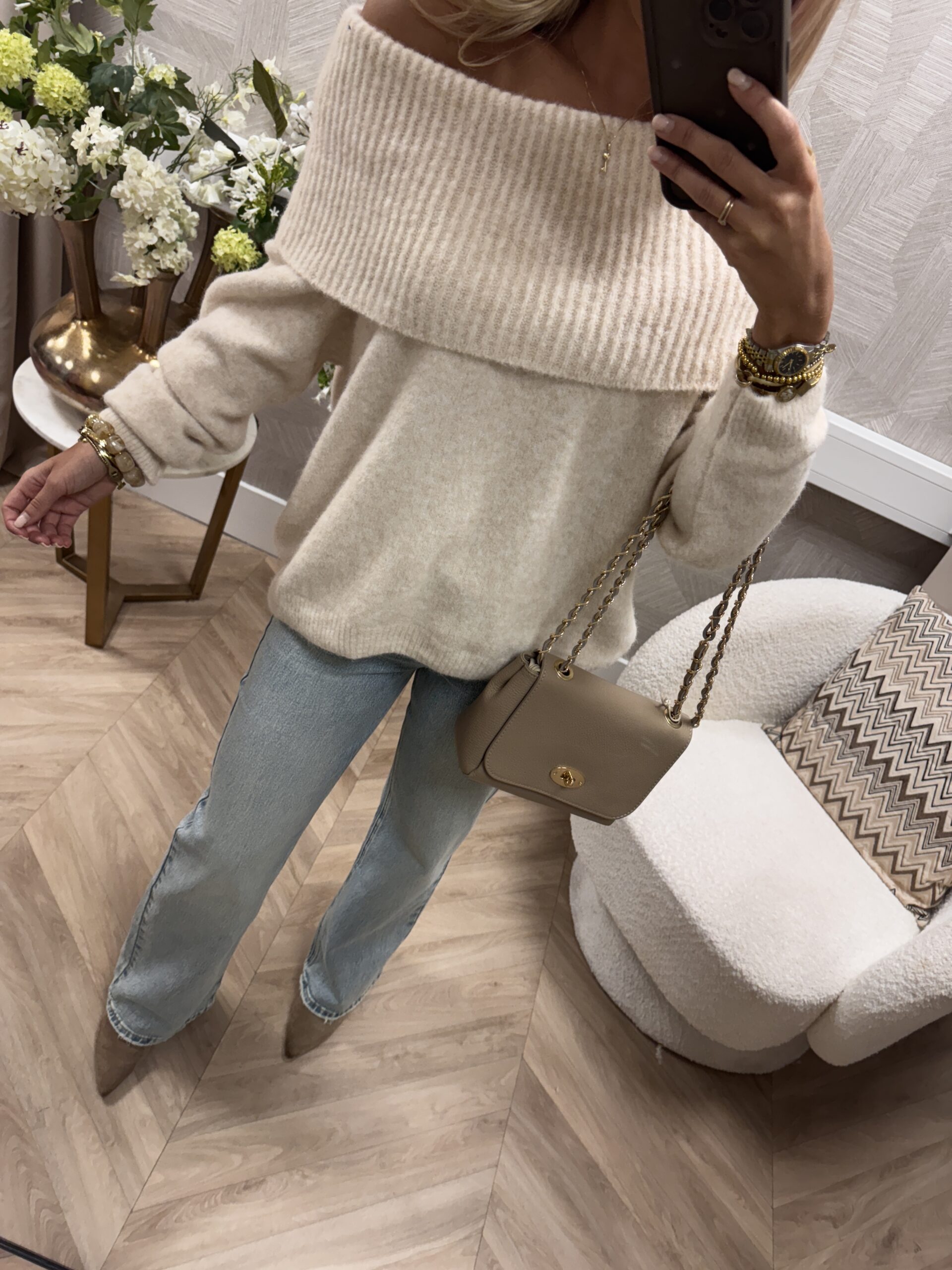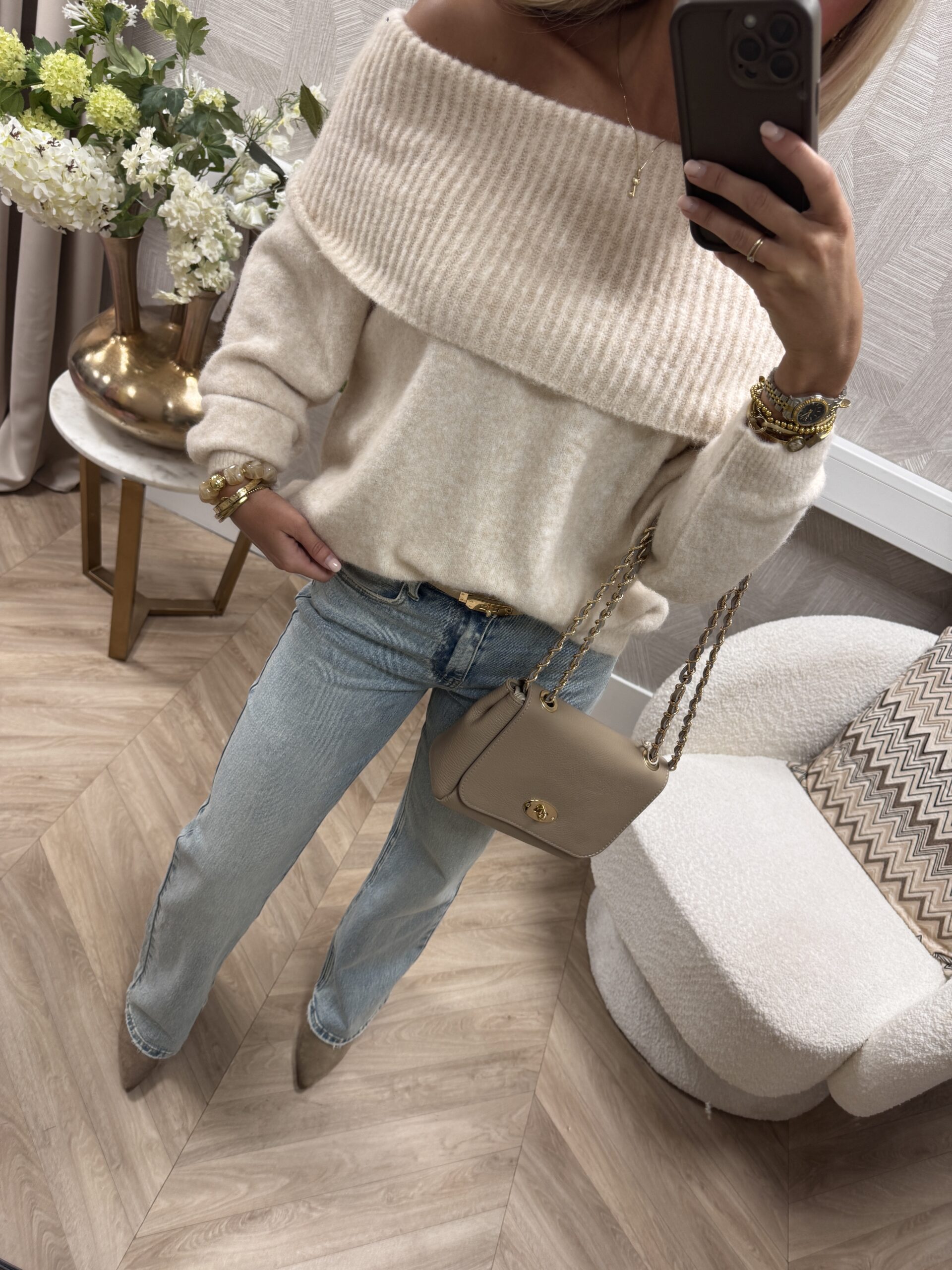Deze off-shoulder trui is een echte eyecatcher. Het brede omslagdetail bij de hals zorgt ervoor dat de trui mooi off-shoulder valt, maar kan ook iets hoger gedragen worden voor een subtielere look. De zachte knit voelt comfortabel aan en heeft een licht losvallende fit, waardoor hij perfect is voor zowel casual als chique outfits.