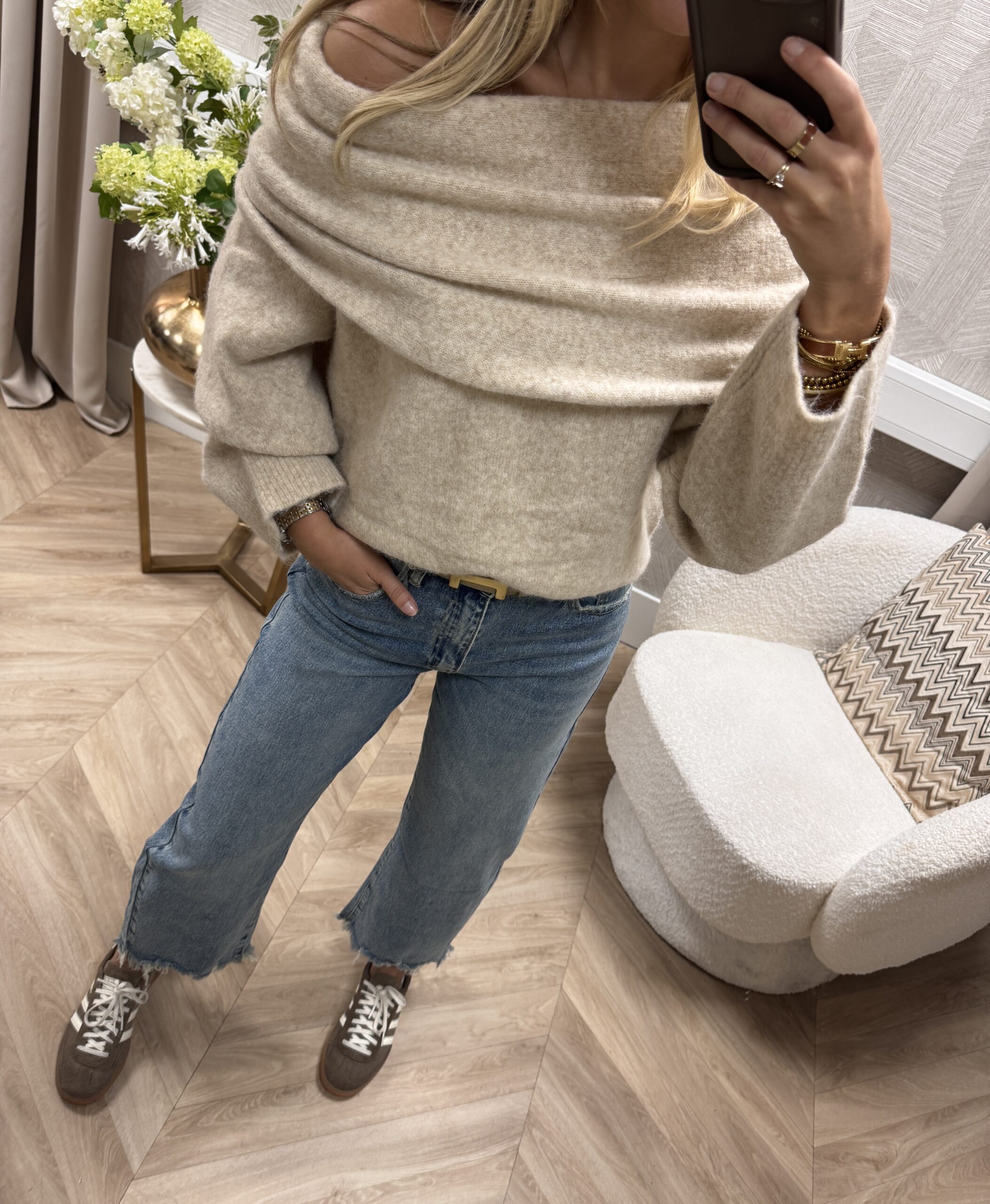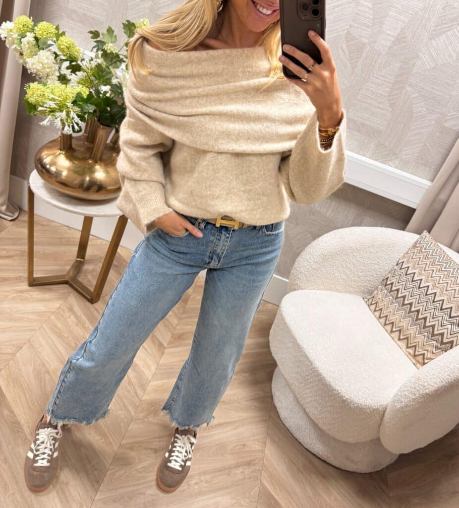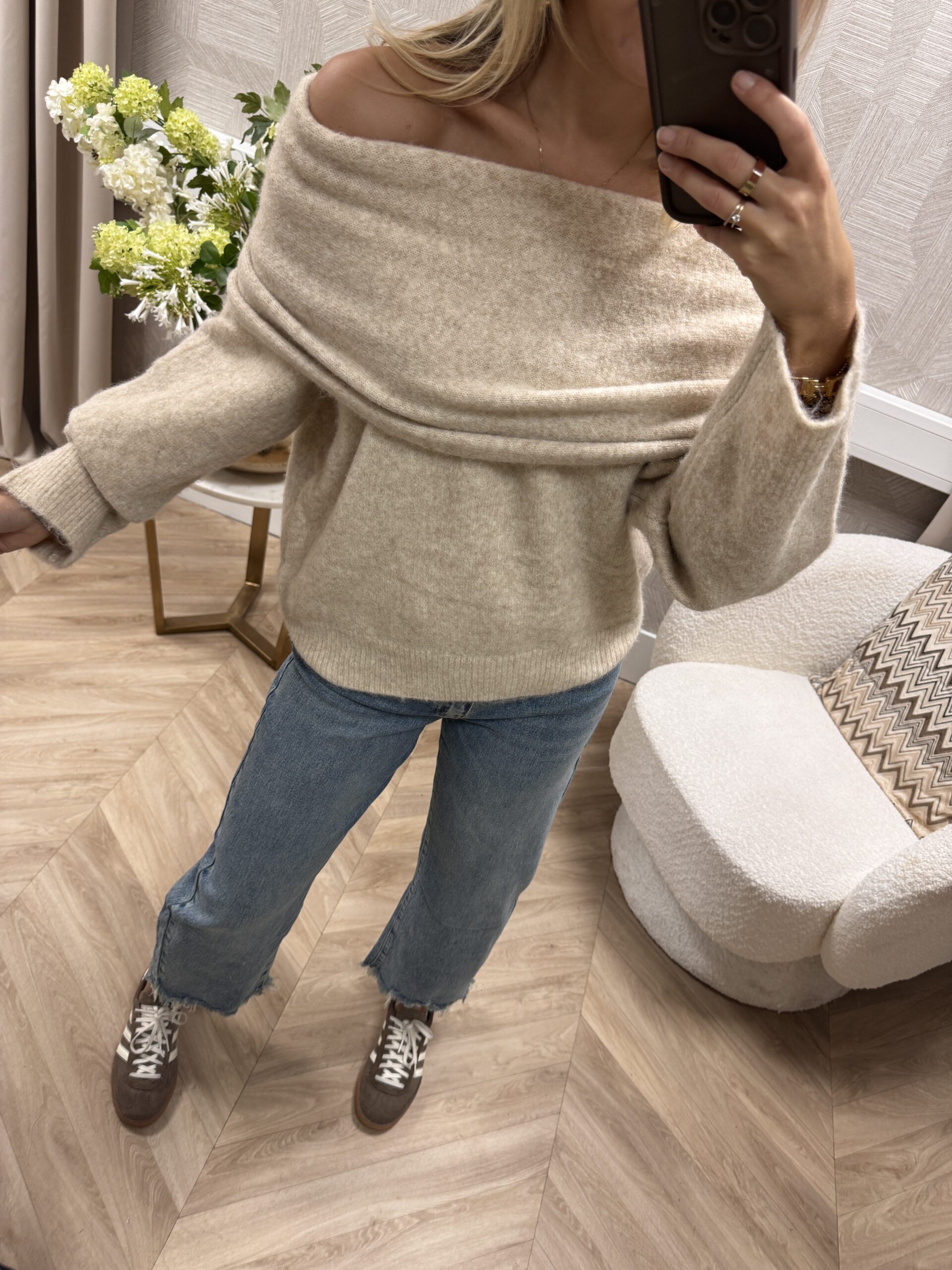 Deze zachte off-shoulder trui heeft een wijde halslijn die mooi over de schouders valt voor een vrouwelijke look. De losvallende pasvorm en gebreide structuur zorgen voor ultiem draagcomfort.
