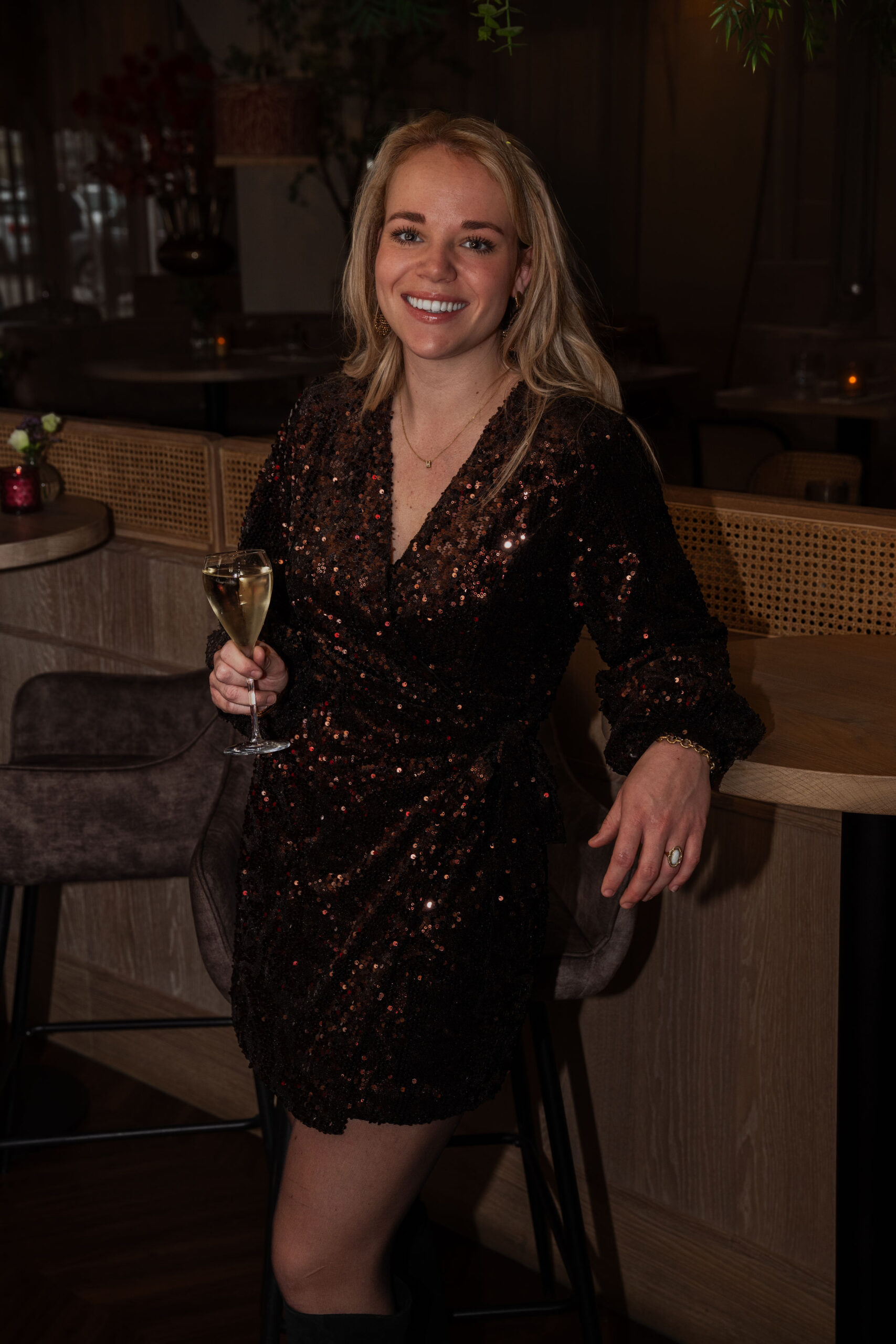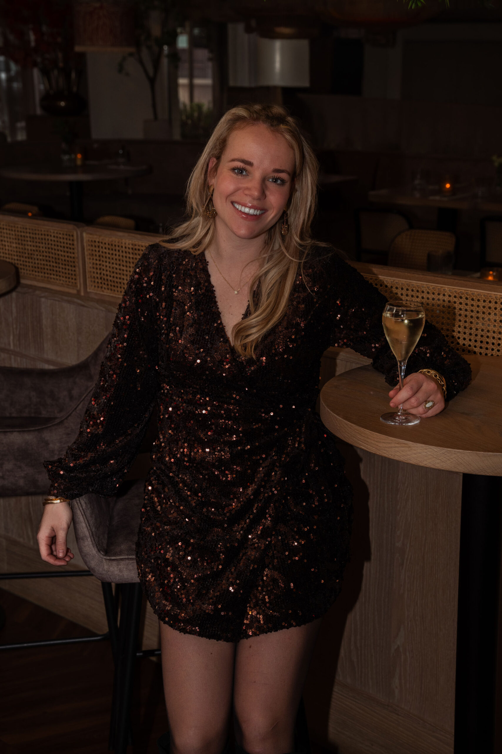 Wauw, hoe prachtig is dit pailletten jurkje! Dankzij het vrouwelijk overslag valt het jurkje mooi aangesloten, met een elegante V-hals en subtiele plooien die een slank silhouet creëren. De lange mouwen met elastische cuffs maken het geheel helemaal af.