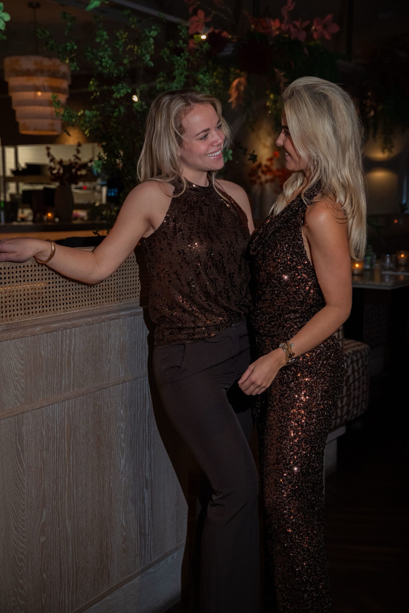 Wauw… hoe geweldig is deze pailletten broek! Deze broek is volledig bezaaid met schitterende bronzen pailletten die het licht prachtig vangen. Het model heeft een hoge taille en loopt elegant uit in een rechte/flared pijp, waardoor je benen optisch langer lijken. Samen met de bijpassende haltertop vormt deze broek een echte showstopper — perfect voor feestjes, diners of iedere gelegenheid waarbij je wil stralen.