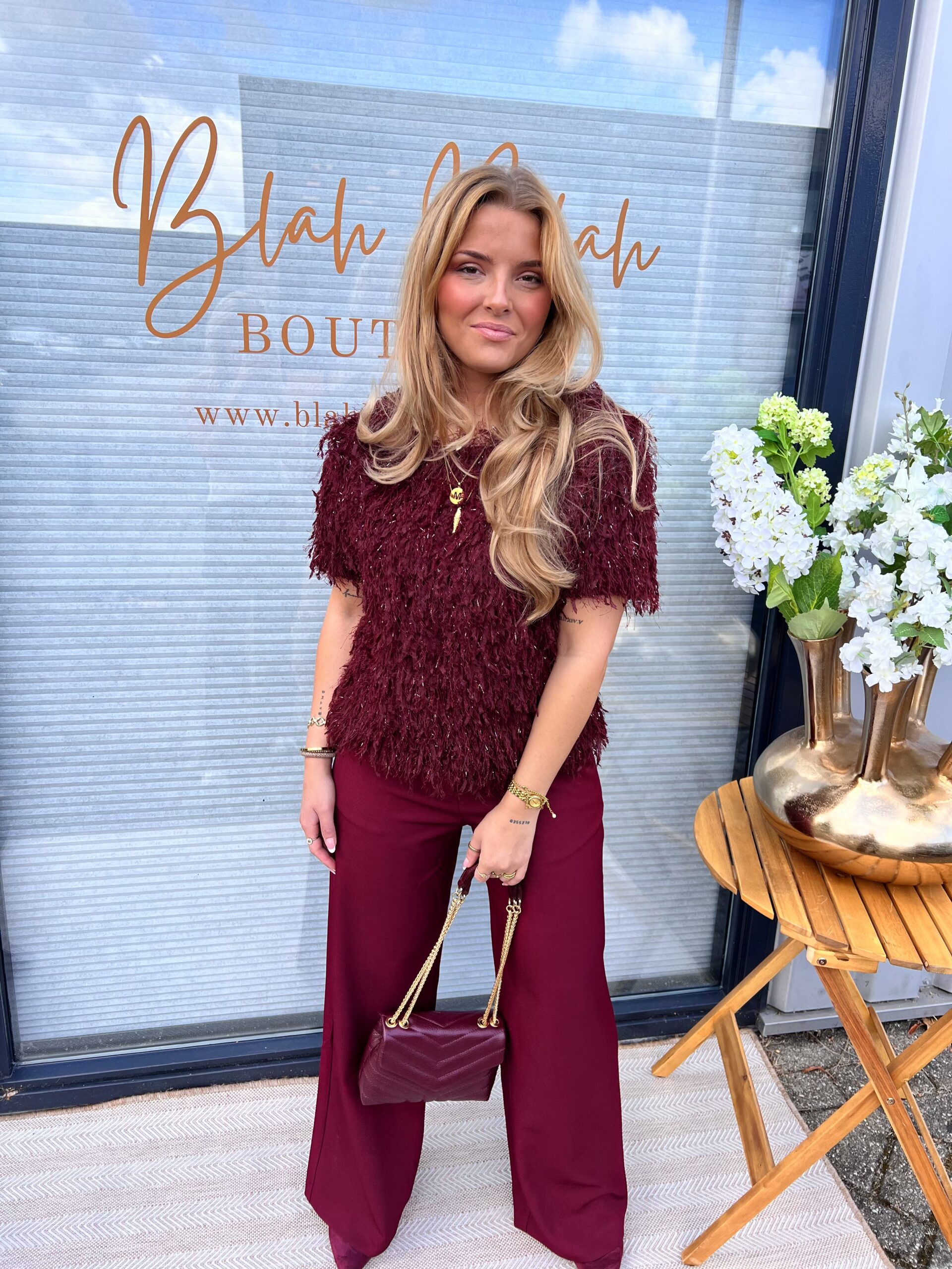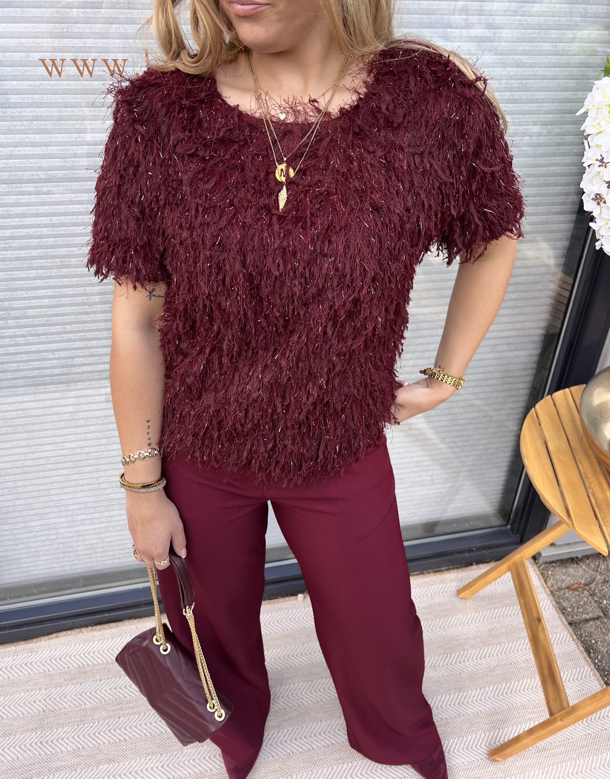 Deze pailletten top in het bordeaux is een echte eyecatcher voor je garderobe. De speelse franjes met subtiele glitters geven de top een feestelijke uitstraling, terwijl de losse fit zorgt voor een comfortabel en stijlvol draagcomfort. Perfect om je outfit net dat beetje extra glamour te geven!