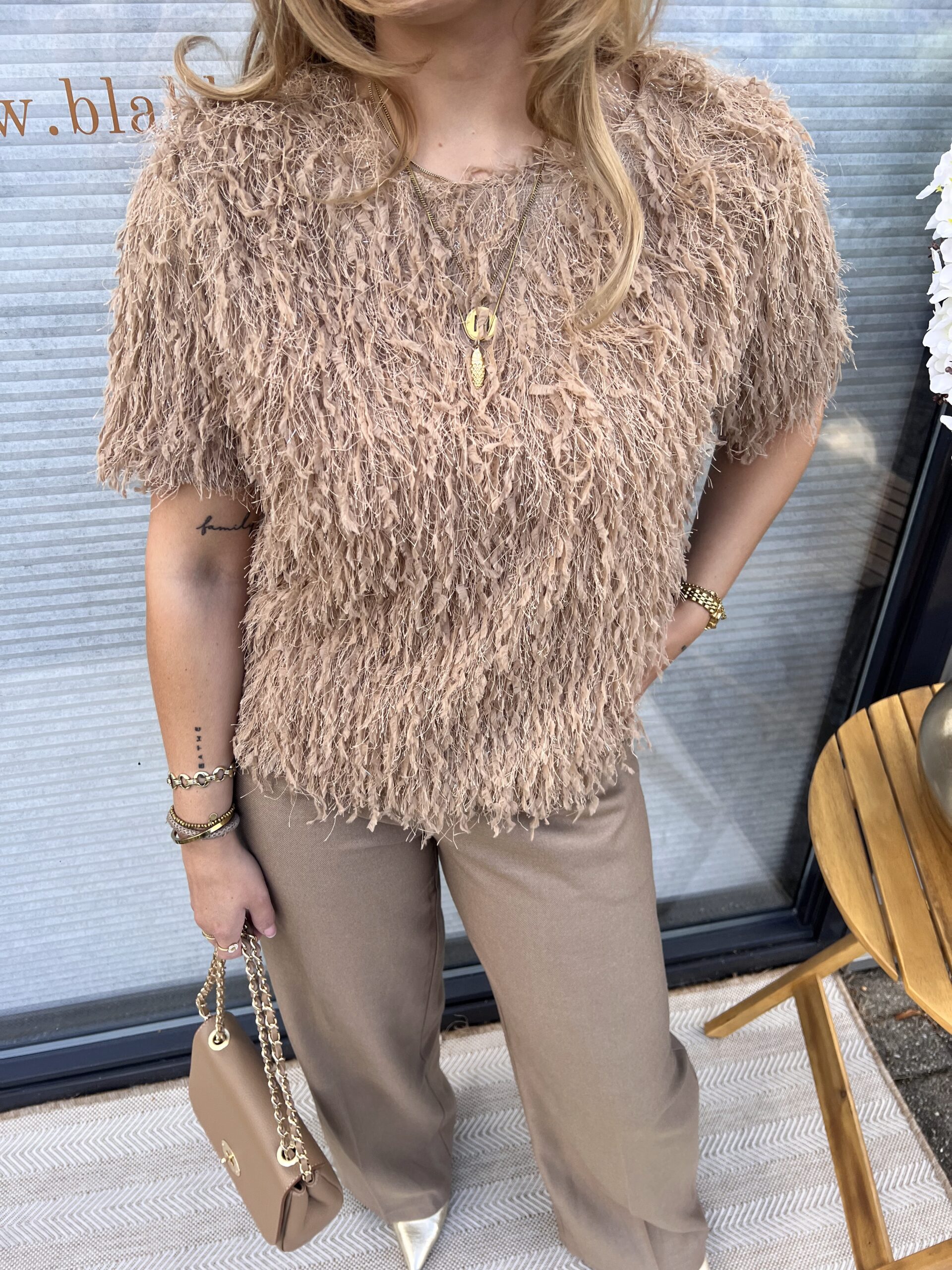 – Camel kleur met subtiele pailletten