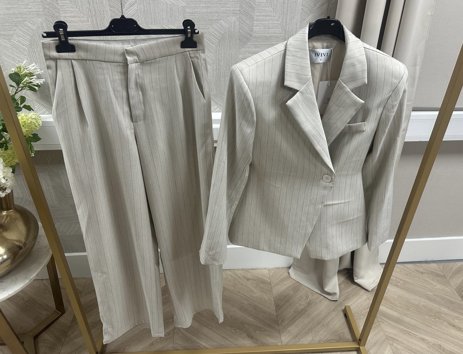 Deze beige pantalon heeft een stijlvolle, nette uitstraling dankzij de rechte pijpen en de subtiele krijtstreep. De hoge taille en persplooi aan de voorkant zorgen voor een mooi, elegant silhouet. Perfect te dragen als set met het bijpassende jasje, maar ook los heel chic met een blouse of knit.