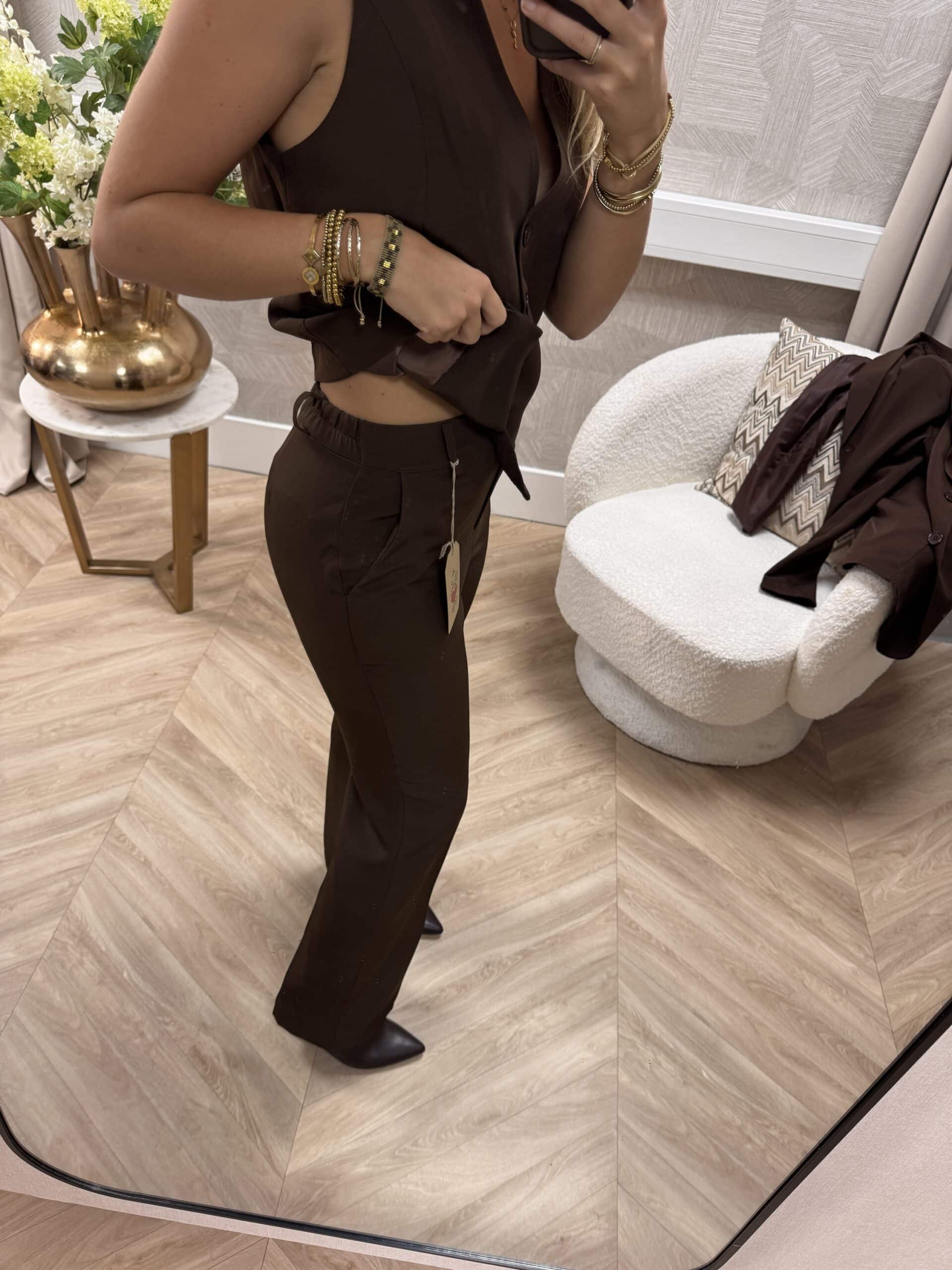 Deze pantalon is een echte musthave voor een classy én comfortabele look. Het model heeft een hoge taille met elastische band aan de achterzijde, waardoor hij mooi aansluit en toch heerlijk draagt. De rechte pijpen met lichte flare geven de broek een elegante uitstraling. Perfect te combineren met de bijpassende blazer of gilet, maar ook los met een knit of blouse.