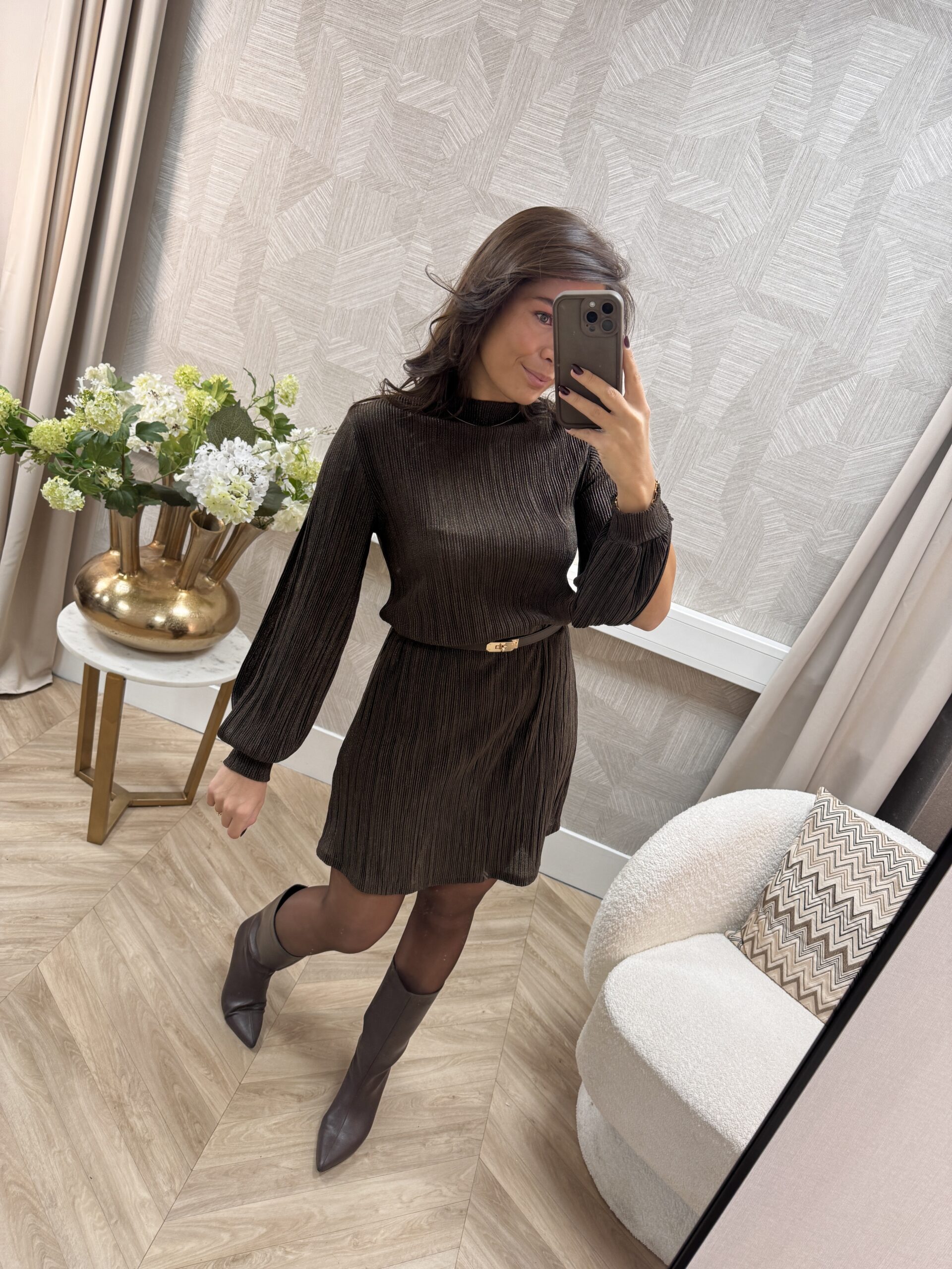 Prachtige jurk gemaakt van een rijke plissé-stof met subtiele glitter