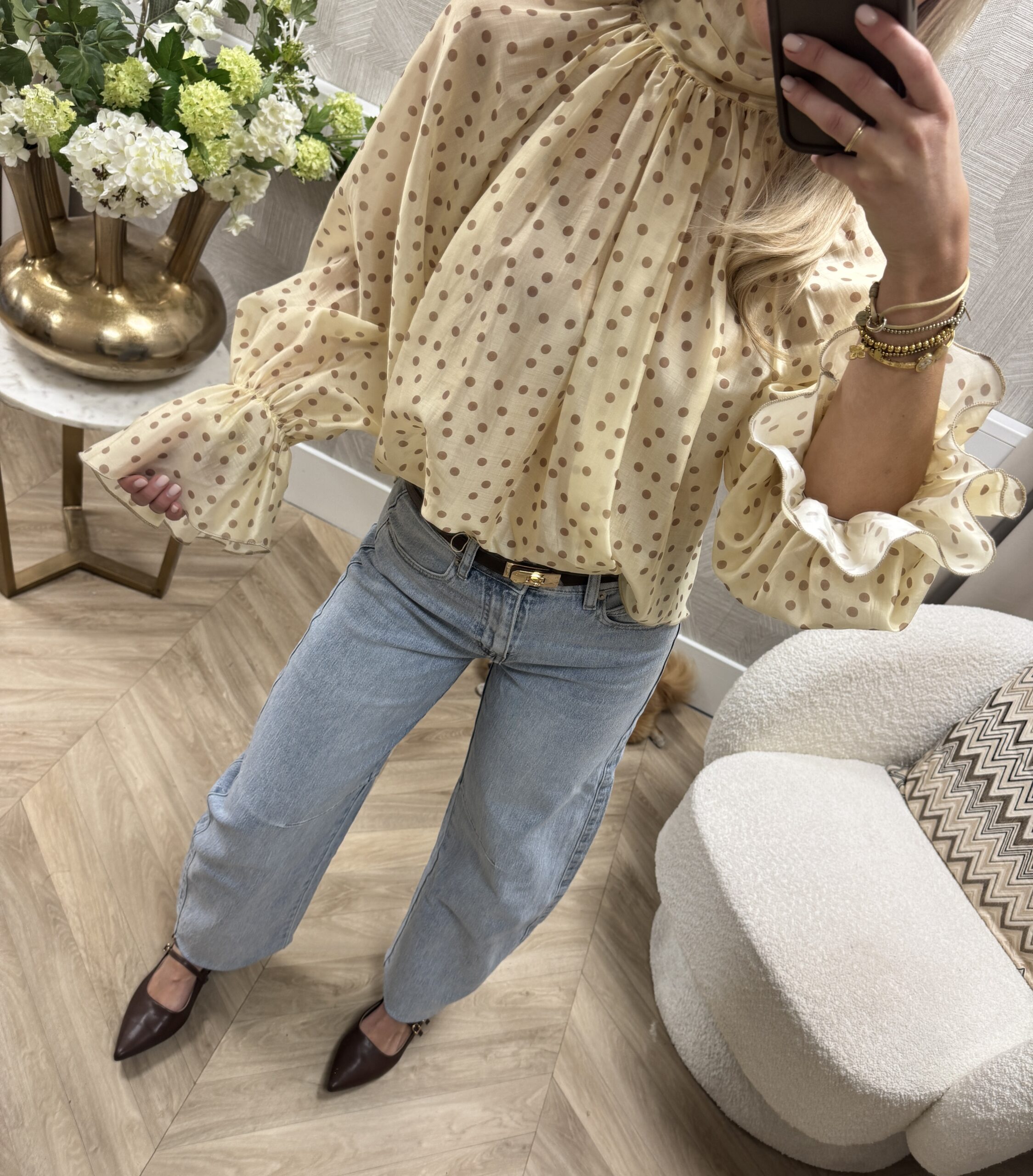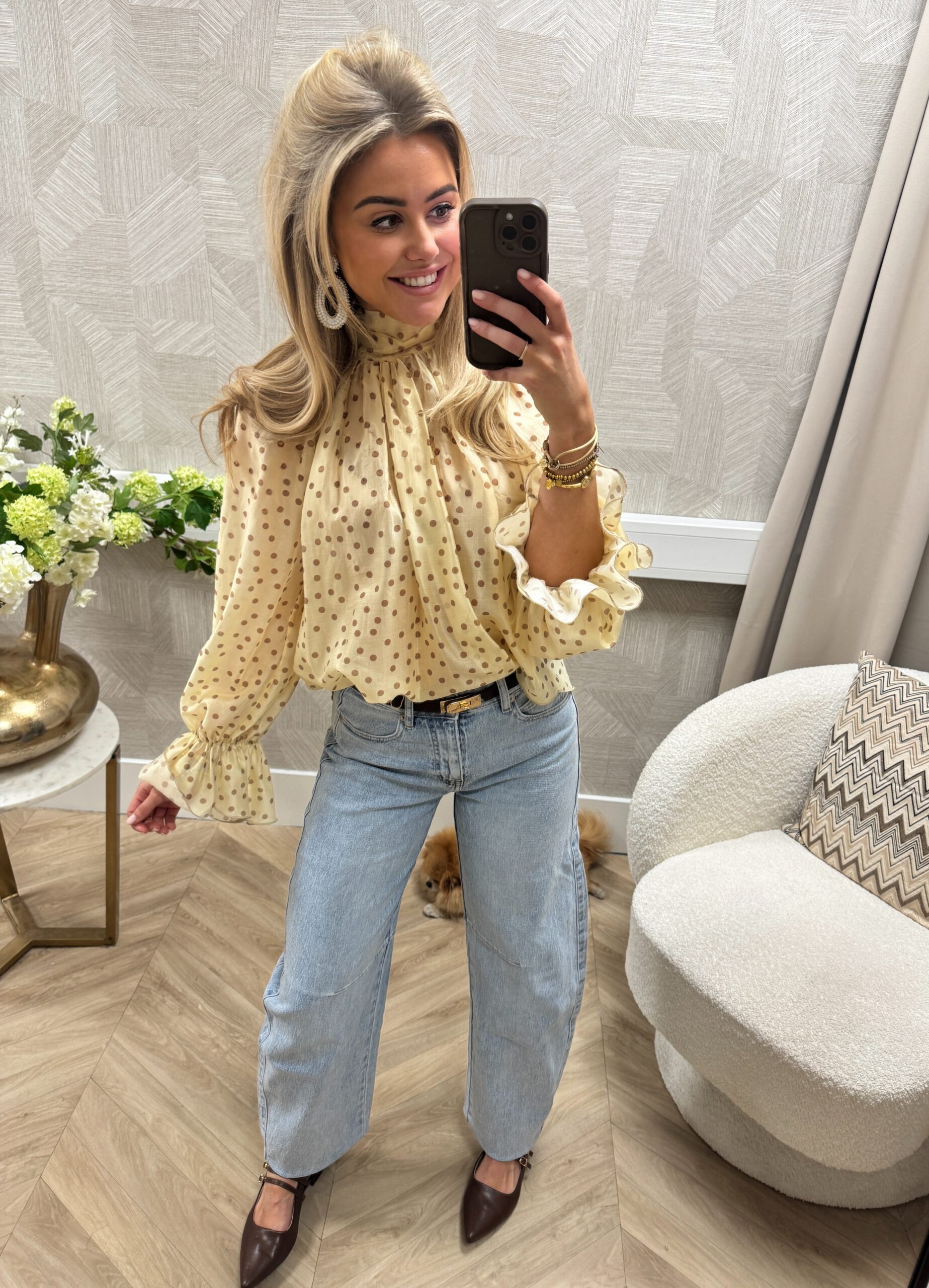 Hoe leuk is deze blouse?! Een stijlvolle blouse met speelse polka dot print en een elegante strik op de rug. De luchtige stof en opvallende mouwdetails maken ‘m perfect voor zowel een casual als geklede look.