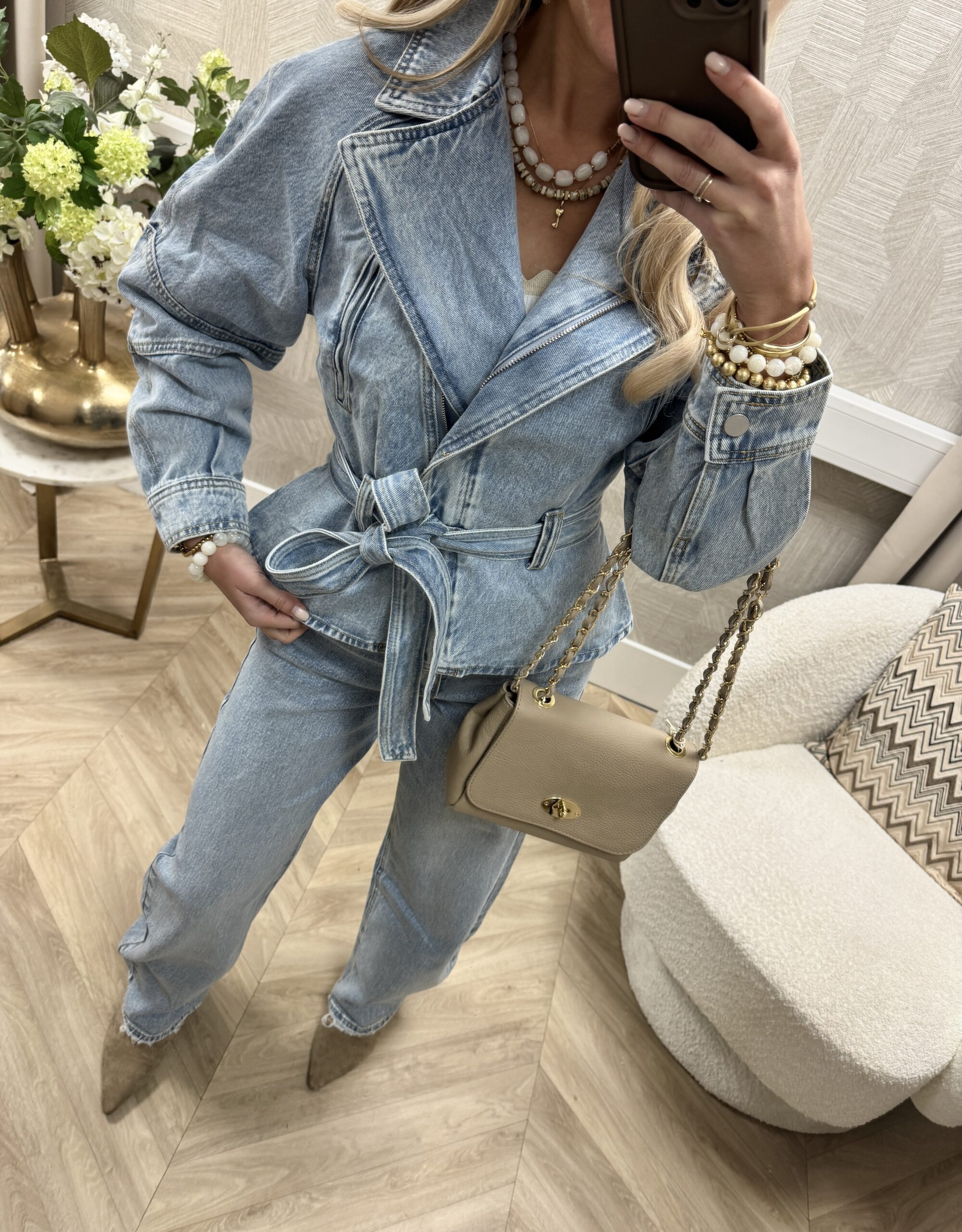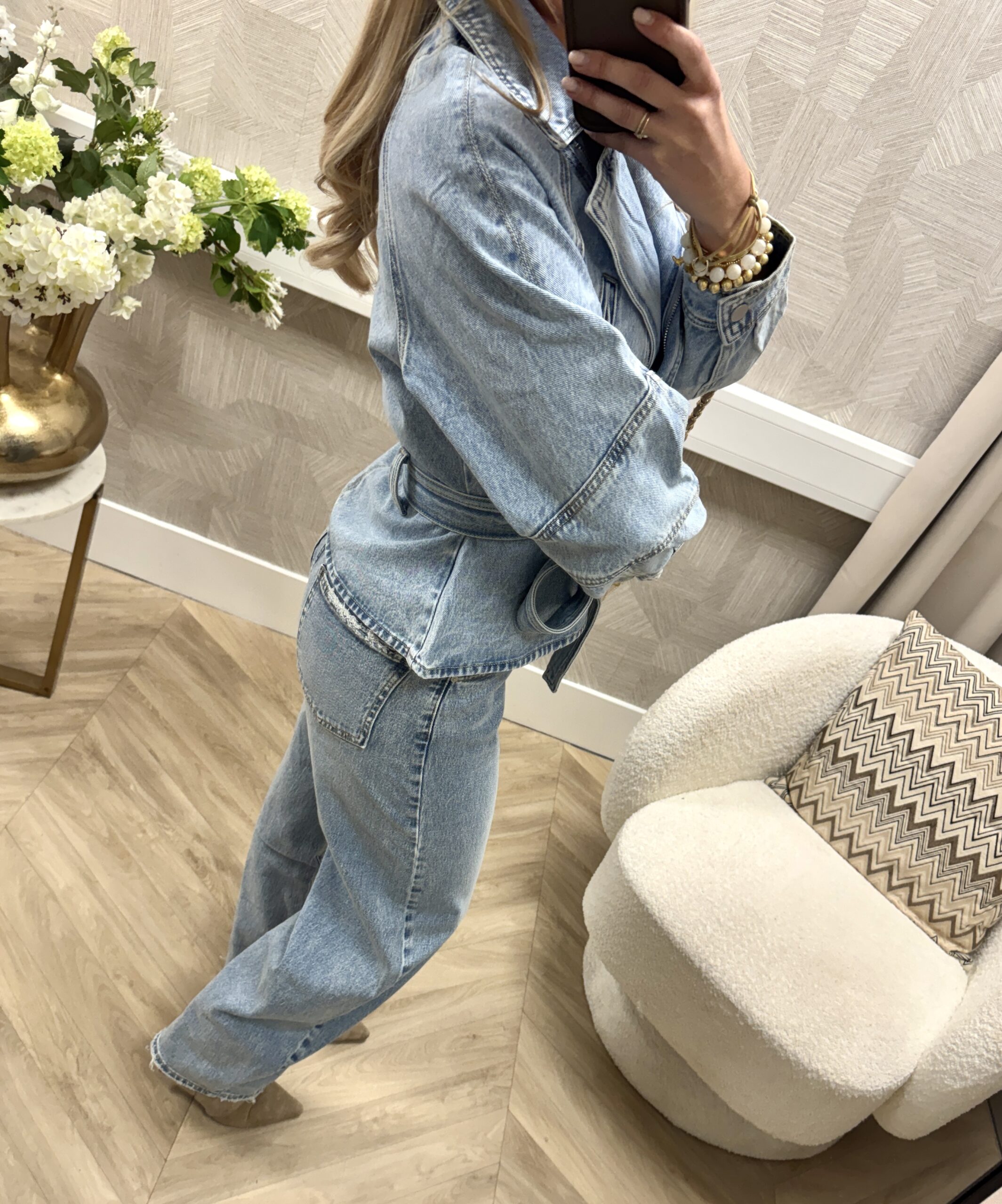 Hoe leuk is dit jasje! Een stoer denim jasje met een vrouwelijke touch. De tailleceintuur zorgt voor een mooie, getailleerde pasvorm en geeft het jasje net wat extra vorm. De lichte wassing en details maken ‘m perfect voor een casual, maar stoere look 🩵