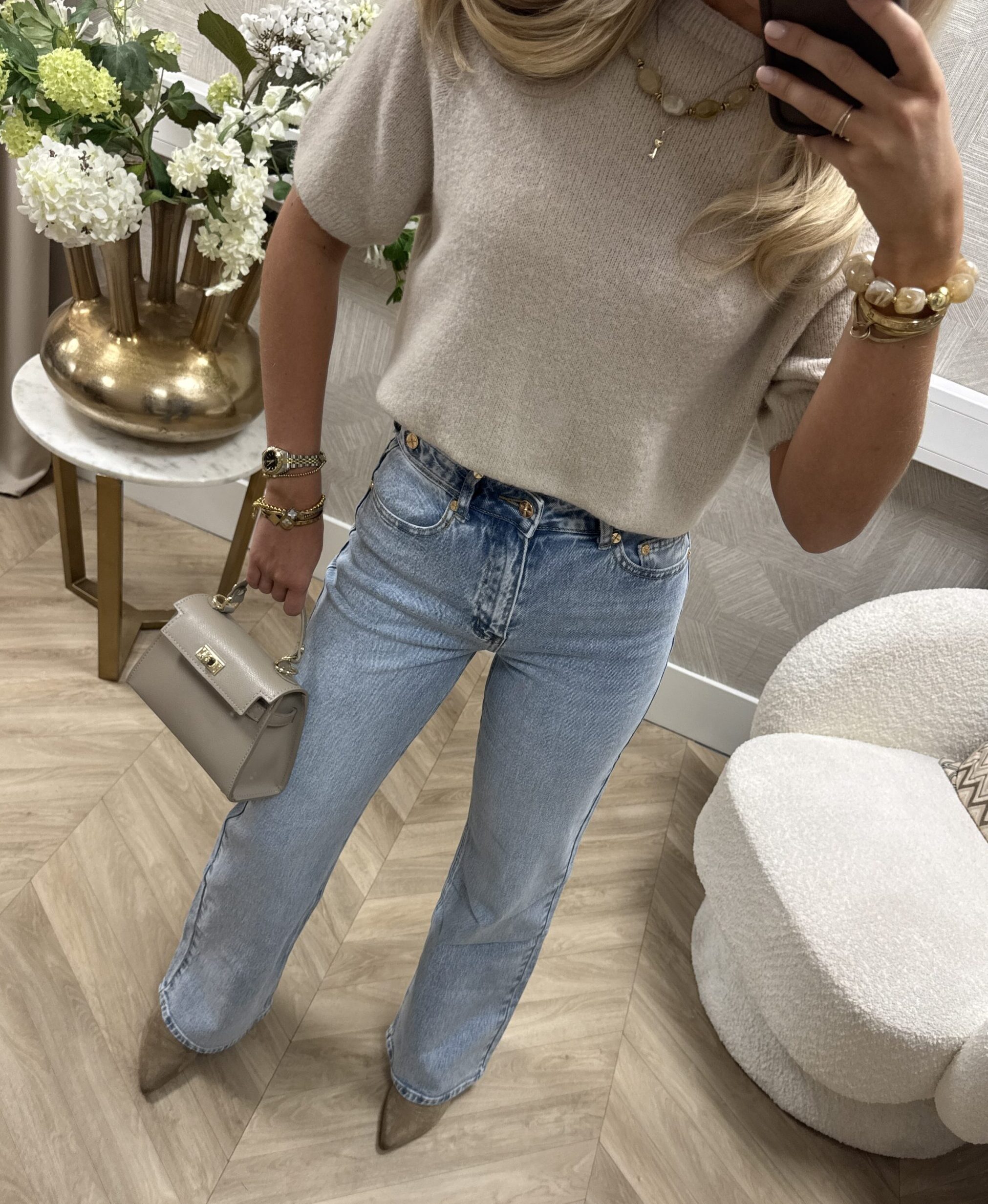 Stijlvolle blauwe jeans met prachtige gouden knoopdetails aan de taille voor een luxe uitstraling. De jeans heeft een mooie wide leg en mid waist pasvorm. Een must item voor het voorjaar!