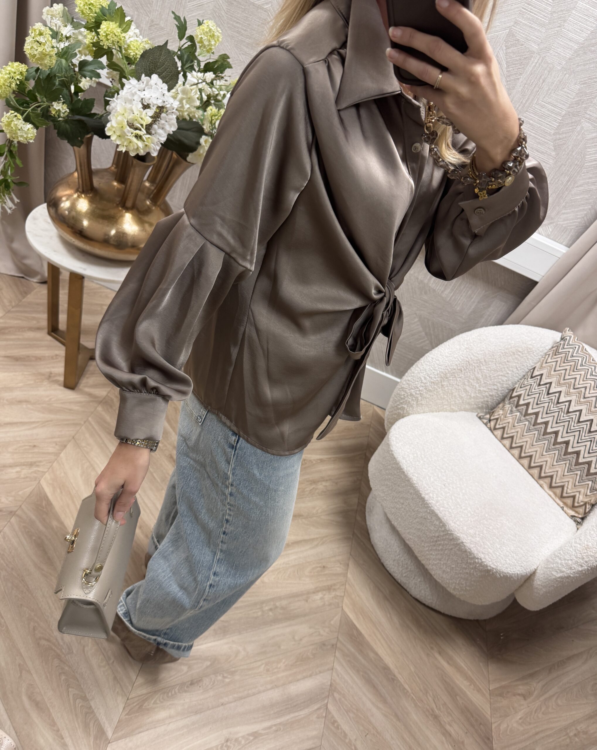 Deze elegante blouse heeft een luxe, satijnen uitstraling en een vrouwelijke twist door het strikdetail aan de voorzijde. De soepelvallende stof en subtiele glans maken dit item perfect voor zowel casual als geklede looks.