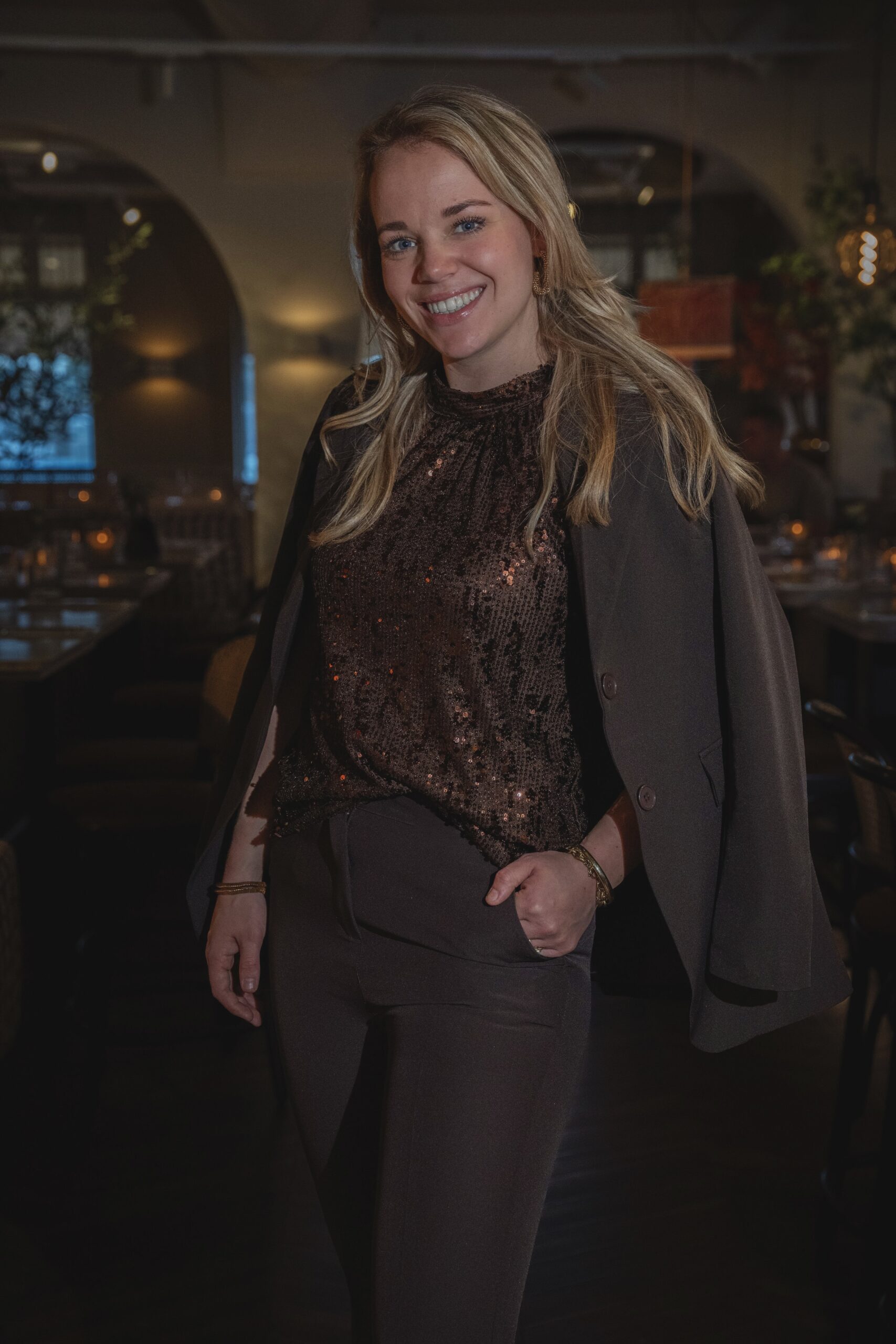 De perfecte party top die élke look naar een hoger niveau tilt! Deze bronzen haltertop heeft een schitterende glans, valt mooi soepel en heeft een super elegante halslijn.