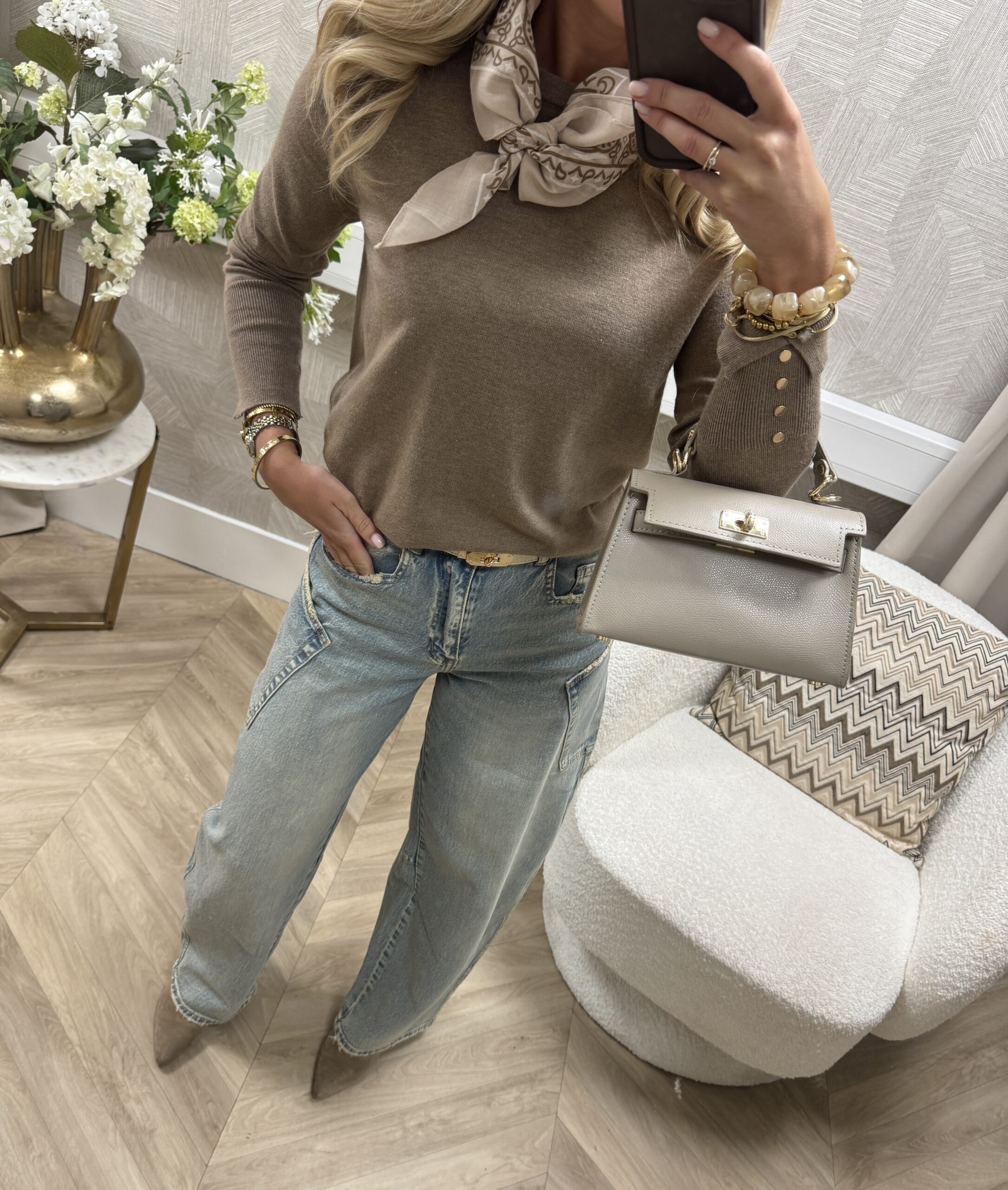 Deze mini shawl is dé trend van dit moment en geeft elke outfit direct een speelse touch. Het compacte formaat maakt ’m perfect om te dragen om de hals, in het haar of aan je tas. De beige print is makkelijk te stylen.