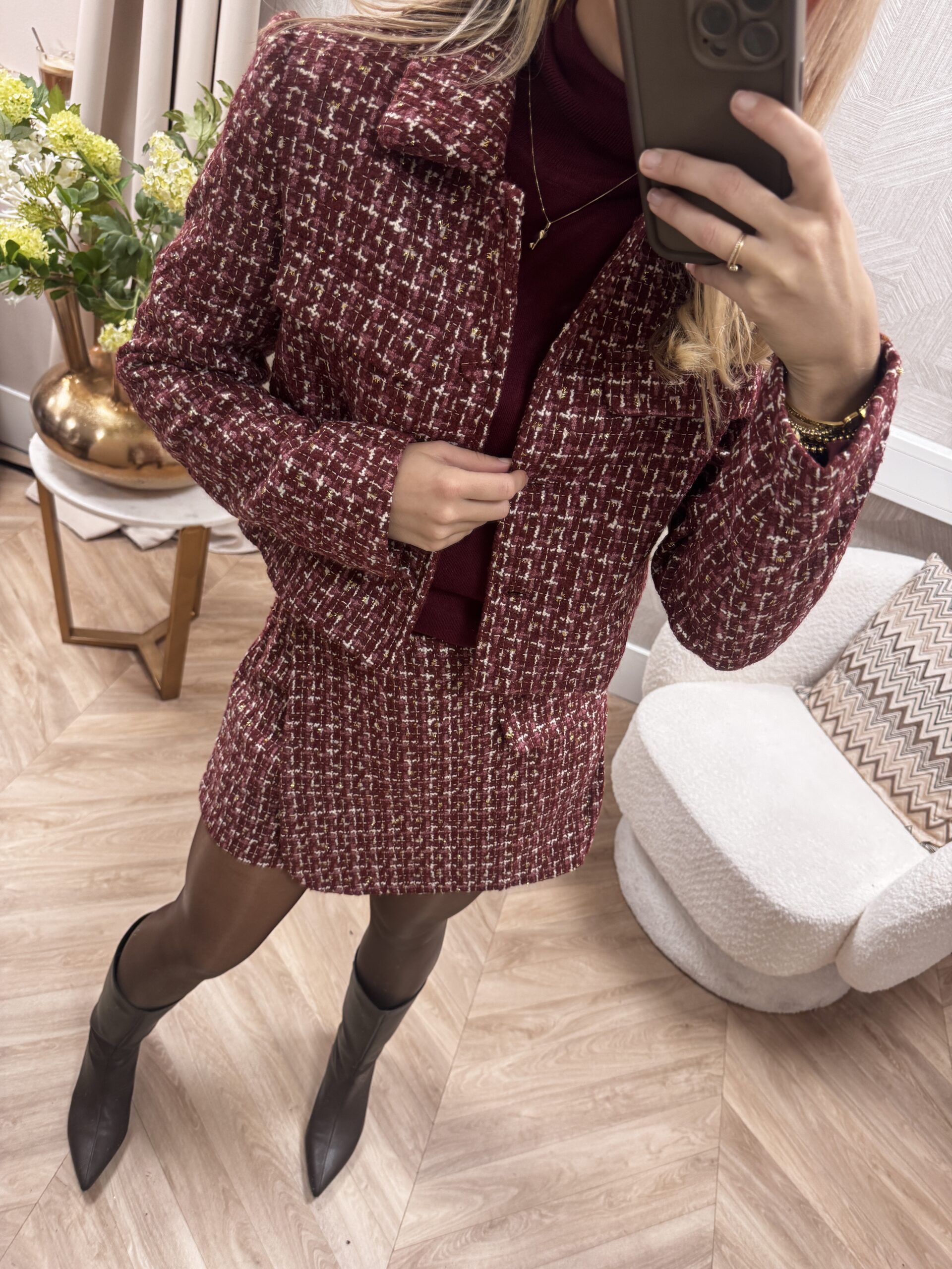 – Luxe tweed stof met kleuren als bordeaux, roze en goud