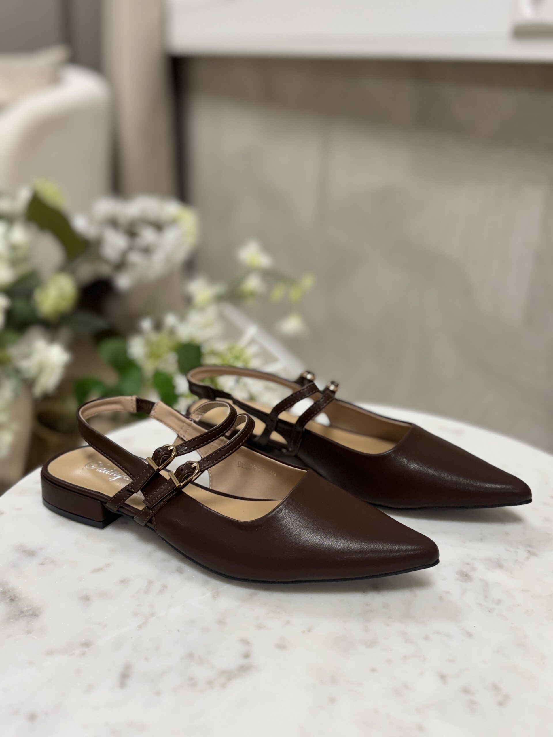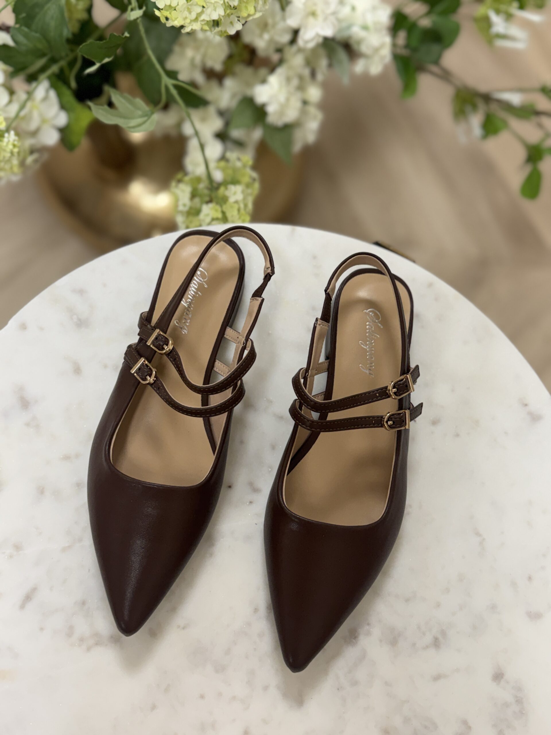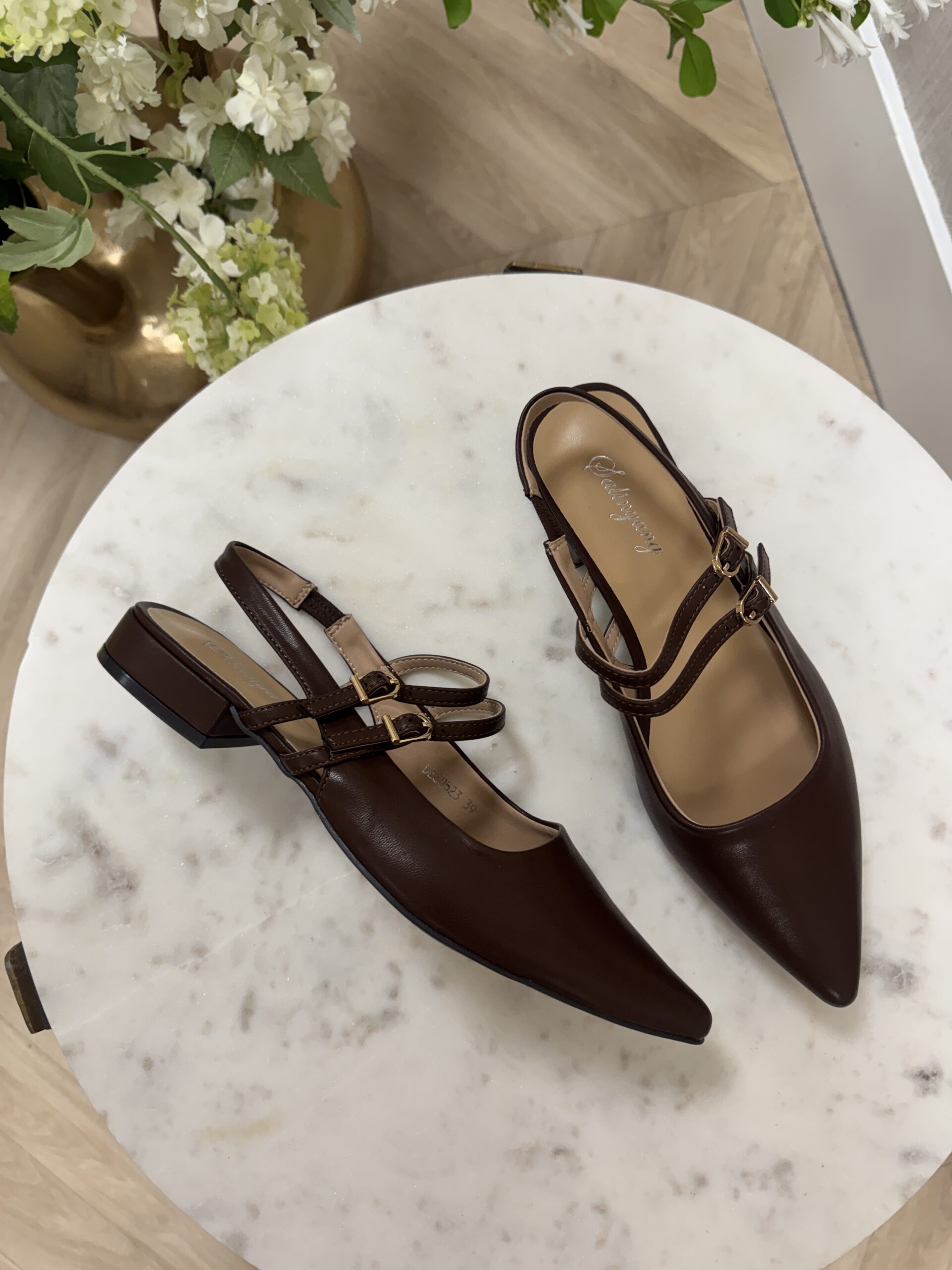 Een stijlvol laag hakje met een elegante punt en verfijnde bandjes. De subtiele hak zorgt voor comfort, terwijl de vorm je outfit een chique en vrouwelijke uitstraling geeft. Perfect voor elke dag én een nette look.