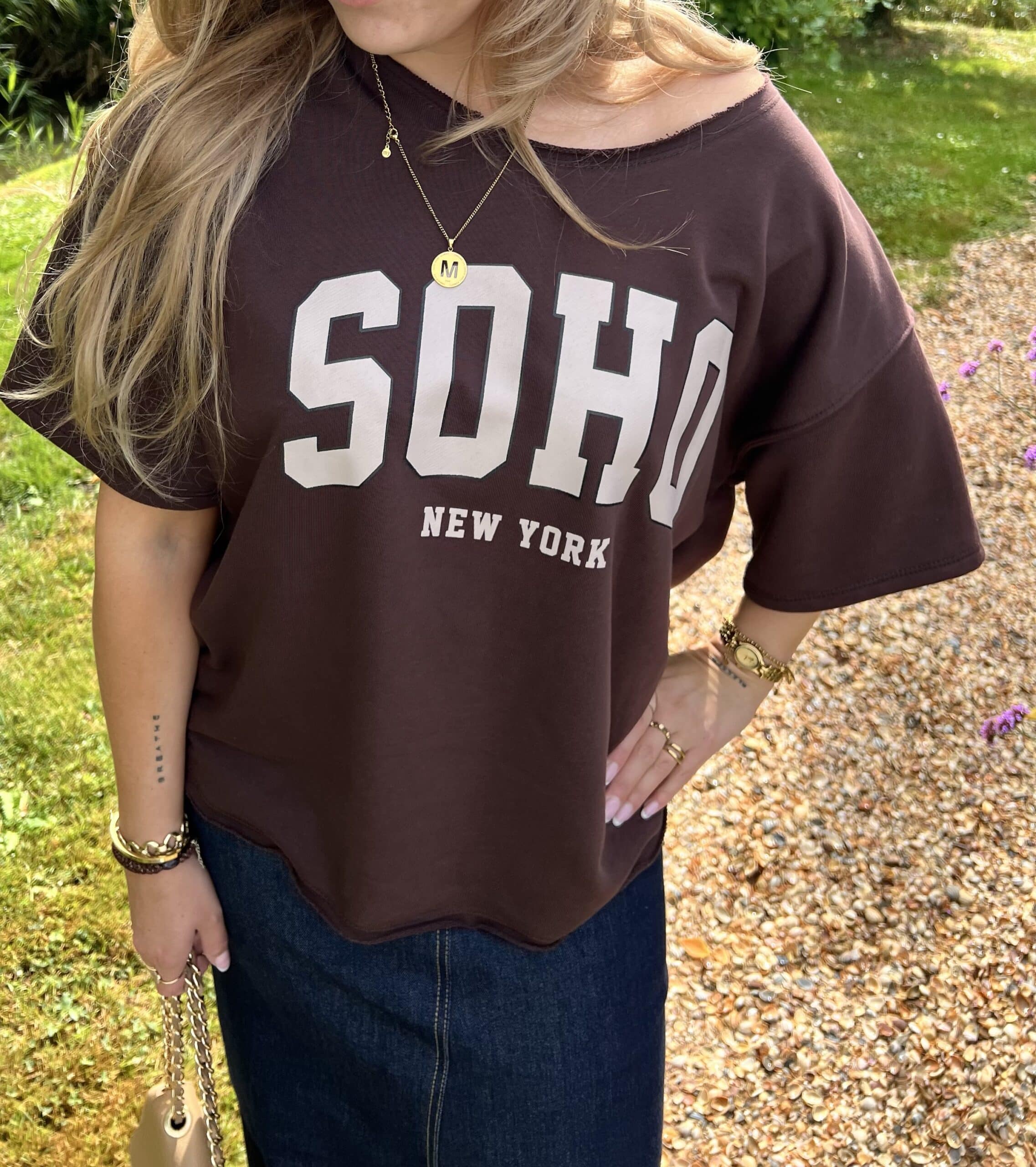 Een casual maar vrouwelijke sweater met een sporty touch! De off shoulder halslijn en oversized fit zorgen voor een nonchalante look, terwijl de “SOHO New York” print hem helemaal afmaakt.