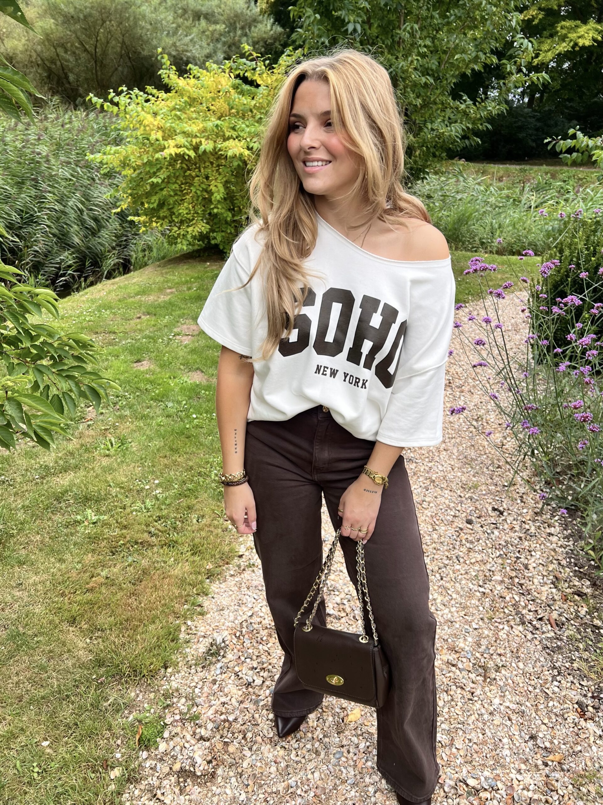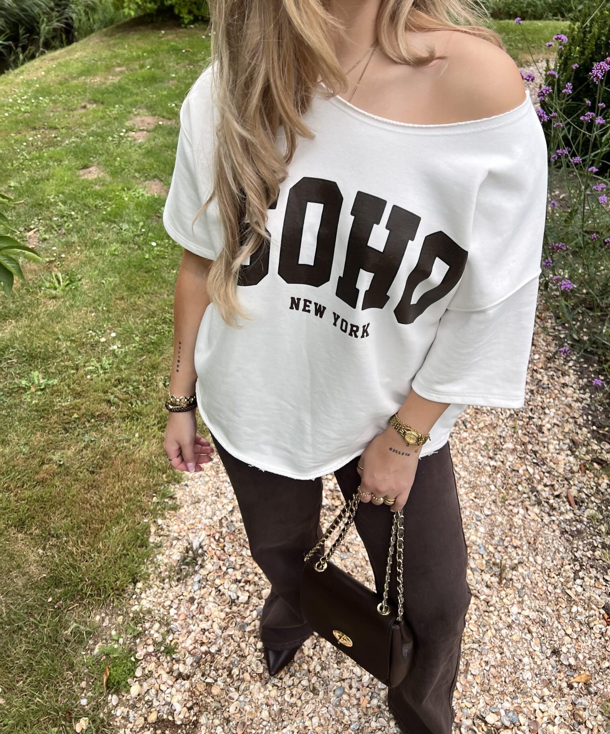 Een casual maar vrouwelijke sweater met een sporty touch! De off shoulder halslijn en oversized fit zorgen voor een nonchalante look, terwijl de “SOHO New York” print hem helemaal afmaakt.