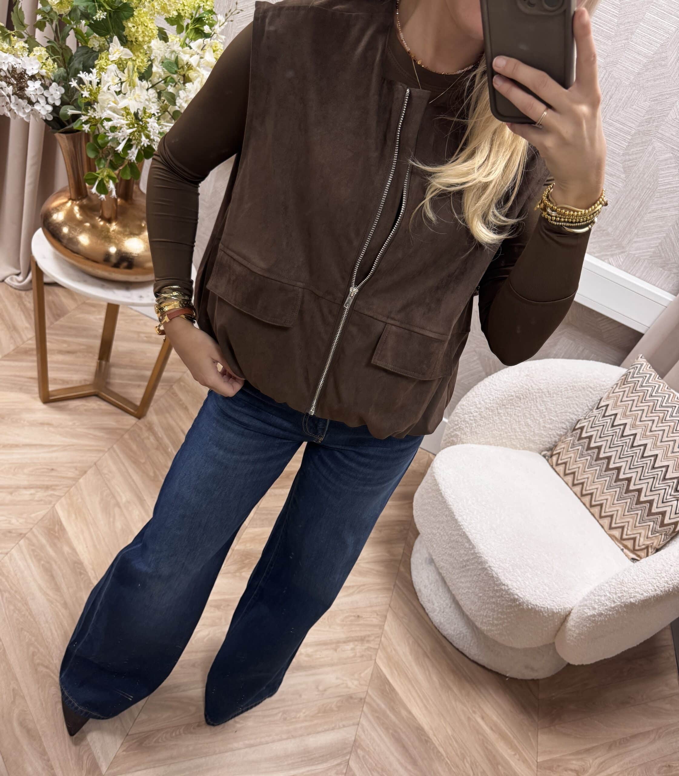 Dit gilet is dé perfecte layering piece voor dit seizoen! Het stoere model met zakken en rits geeft een trendy utility look, terwijl de zachte suedelook stof zorgt voor een chique touch. Je kunt hem eindeloos combineren: draag hem over een blouse of longsleeve met een jeans voor een casual outfit, of combineer hem met een jurkje en laarzen voor een fashionable look.