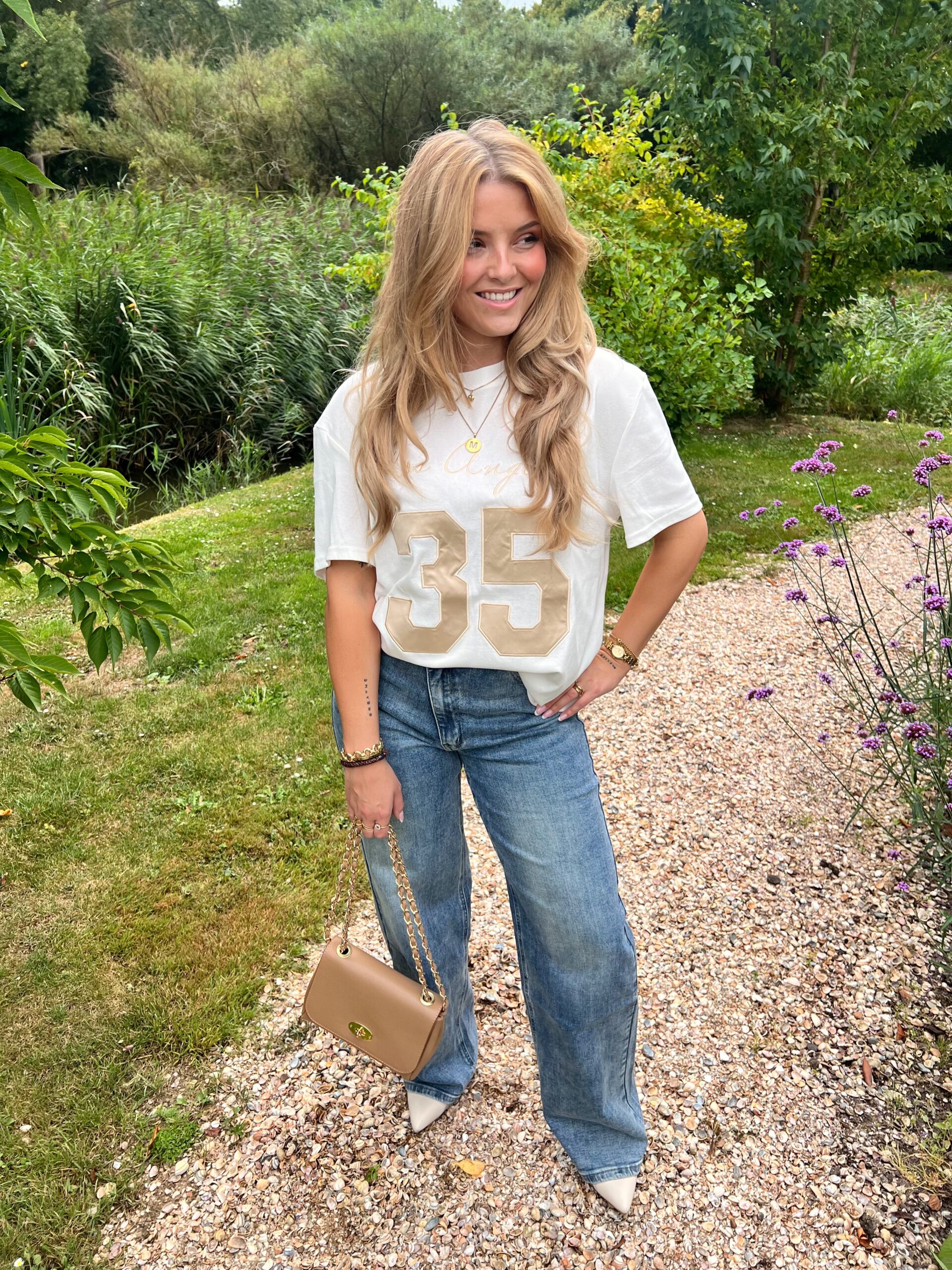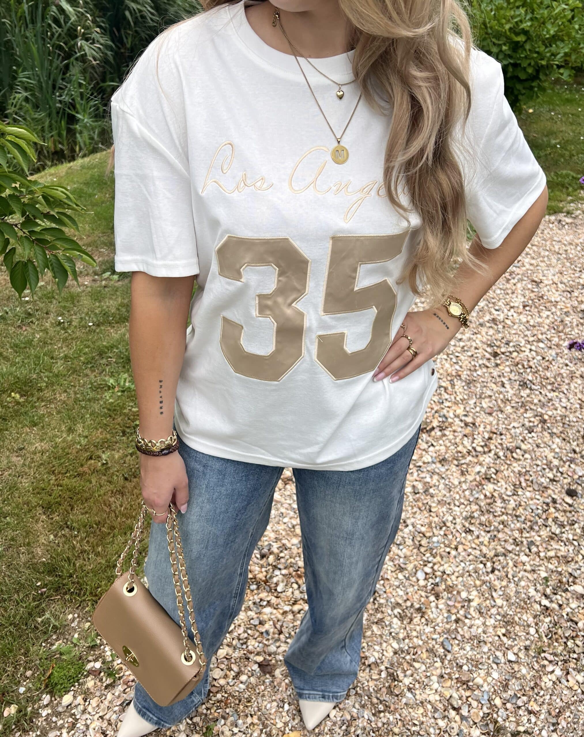 Dit Ambika T-shirt is een echte musthave voor een sportieve maar toch stijlvolle look. Het losse model valt soepel en heeft een ronde hals. Voorzien van de tekst Los Angeles en het cijfer 35 in shiny gouden letters, wat zorgt voor een trendy en luxe uitstraling.