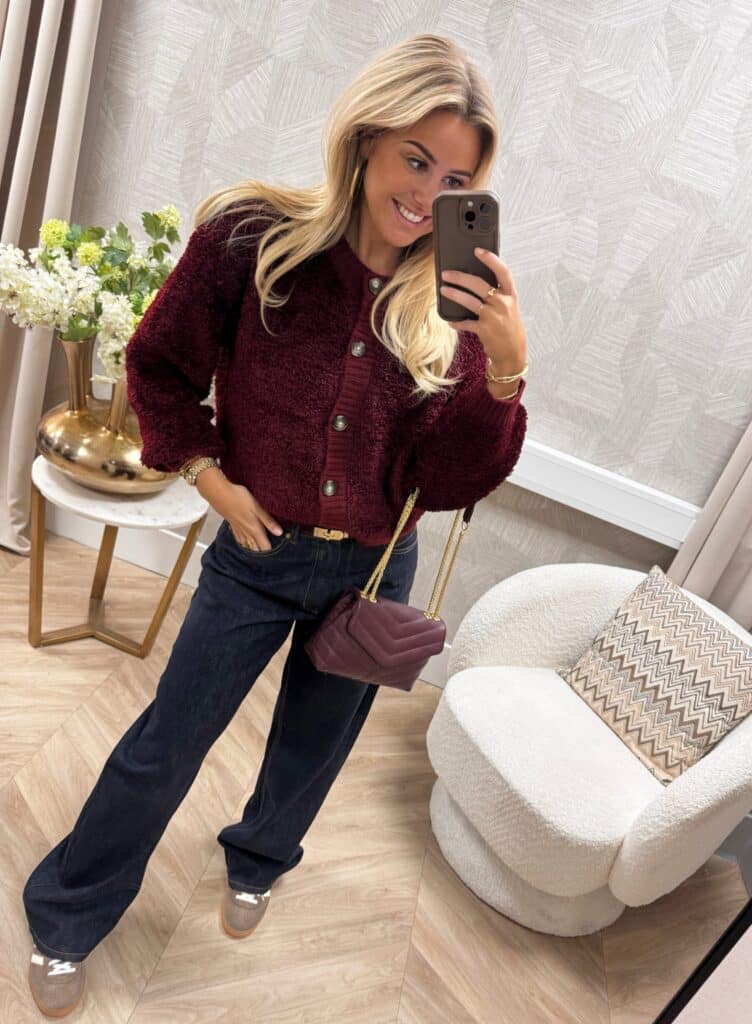 Dit superzachte teddy vest in een warme bordeauxkleur is een echte musthave voor het najaar! De stof voelt heerlijk comfortabel aan en geeft direct een cosy, luxe uitstraling. Het model heeft ballonmouwen en mooie knopen aan de voorkant.