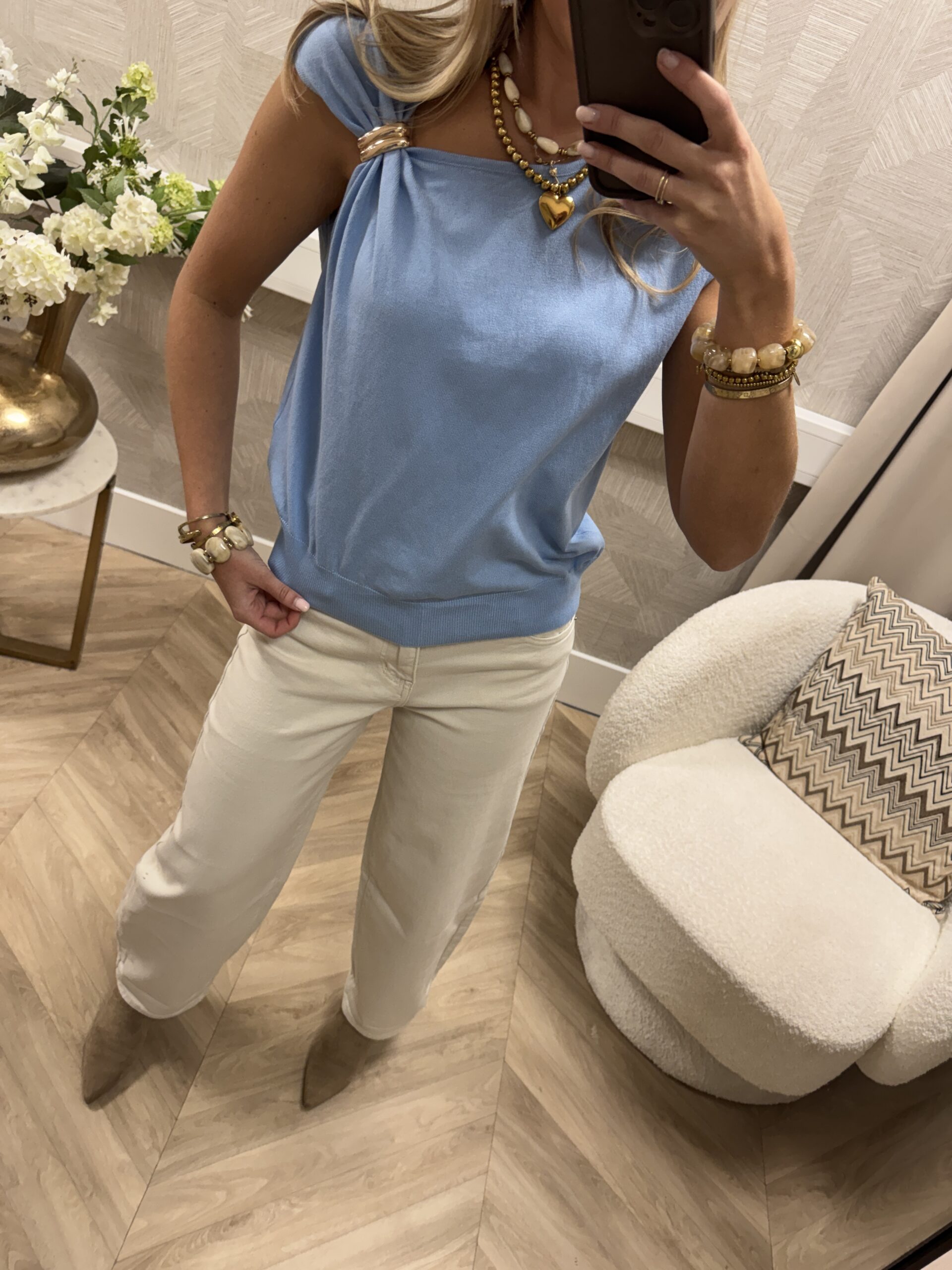 Stijlvolle mouwloze top in een zachte blauwe stof. De top is afgewerkt met een goudkleurig detail op de schouder, wat zorgt voor een elegante en opvallende touch. De soepele pasvorm maakt dit item perfect voor zowel een casual als geklede look.