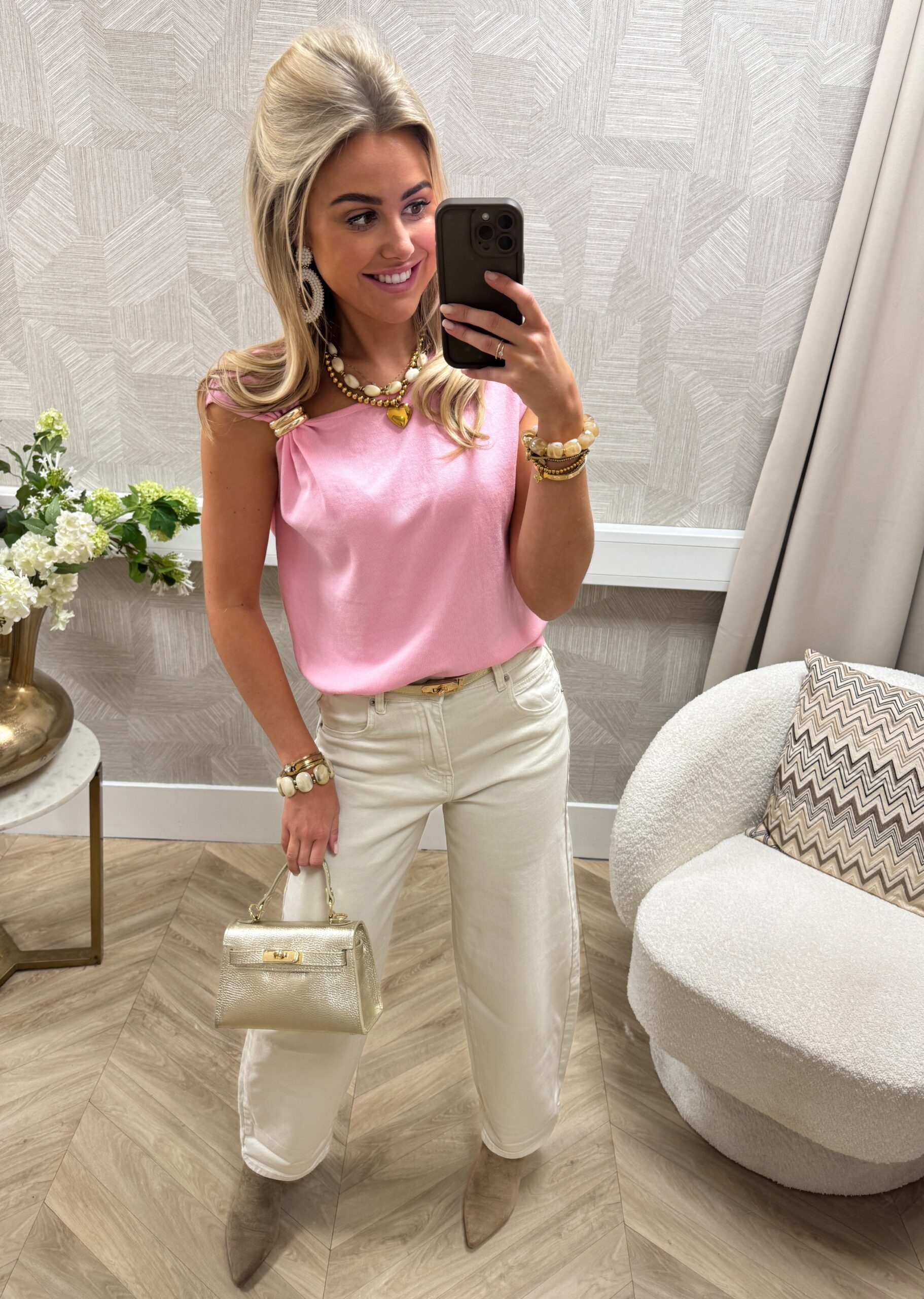 Stijlvolle mouwloze top in een zachte roze stof. De top is afgewerkt met een goudkleurig detail op de schouder, wat zorgt voor een elegante en opvallende touch. De soepele pasvorm maakt dit item perfect voor zowel een casual als geklede look.