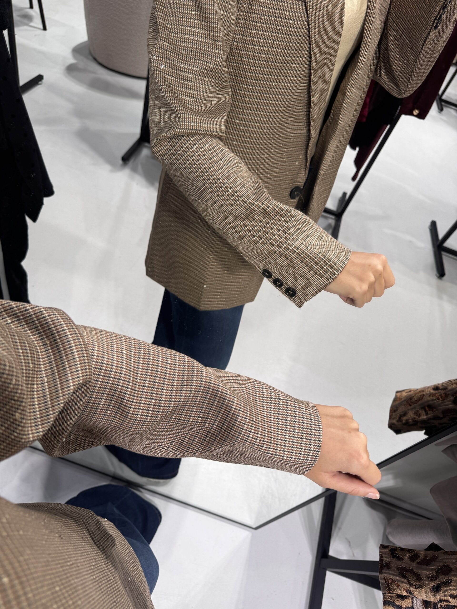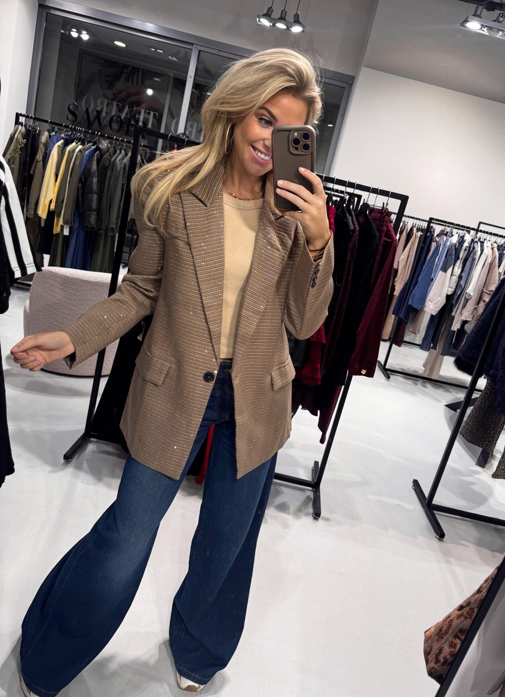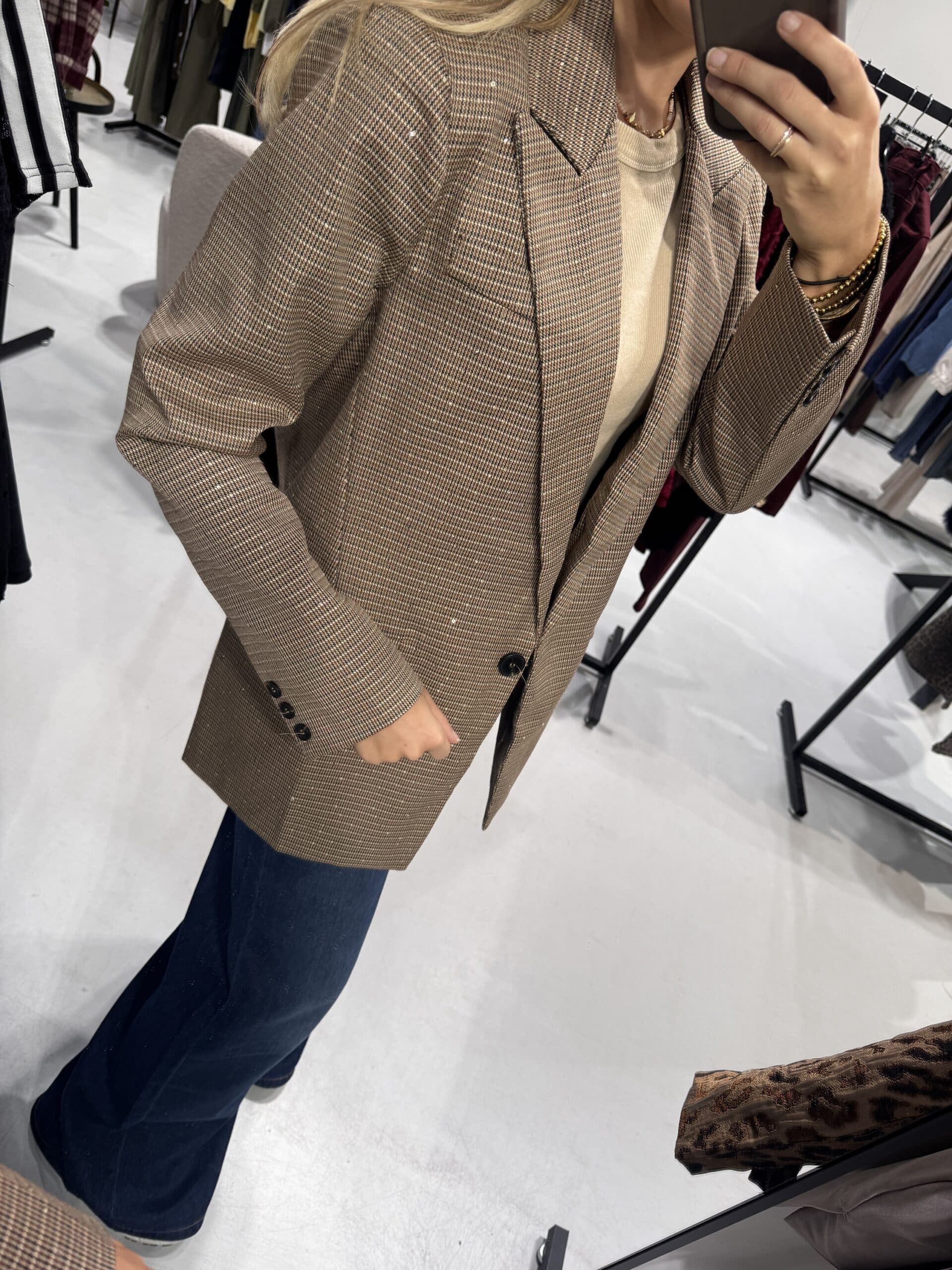 Dit geruite jasje is een echte musthave voor dit seizoen. Het model heeft een rechte fit met lange mouwen en knoopsluiting aan de voorkant. De bruin/beige ruitprint geeft het jasje een trendy maar ook tijdloze uitstraling. Gedetailleerd met subtiele strass steentjes.